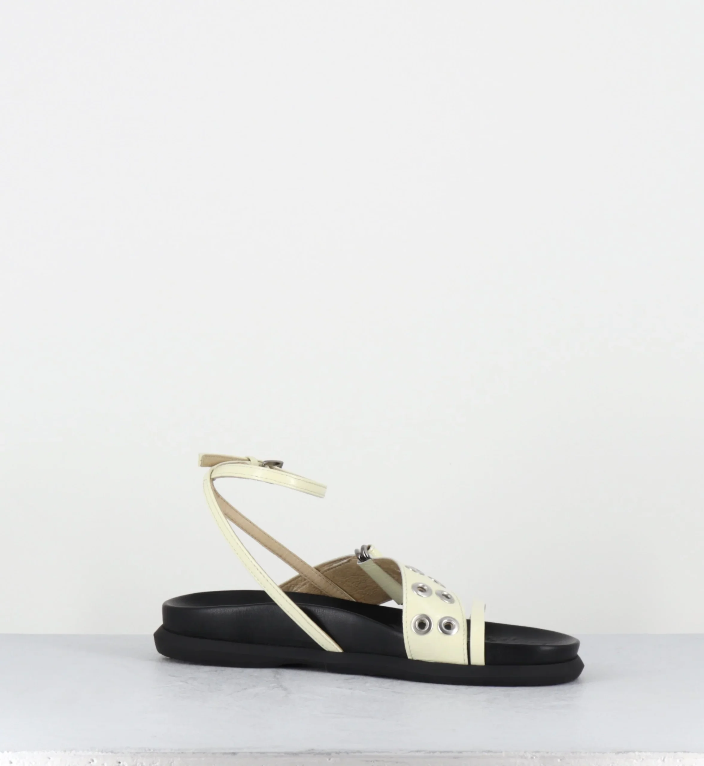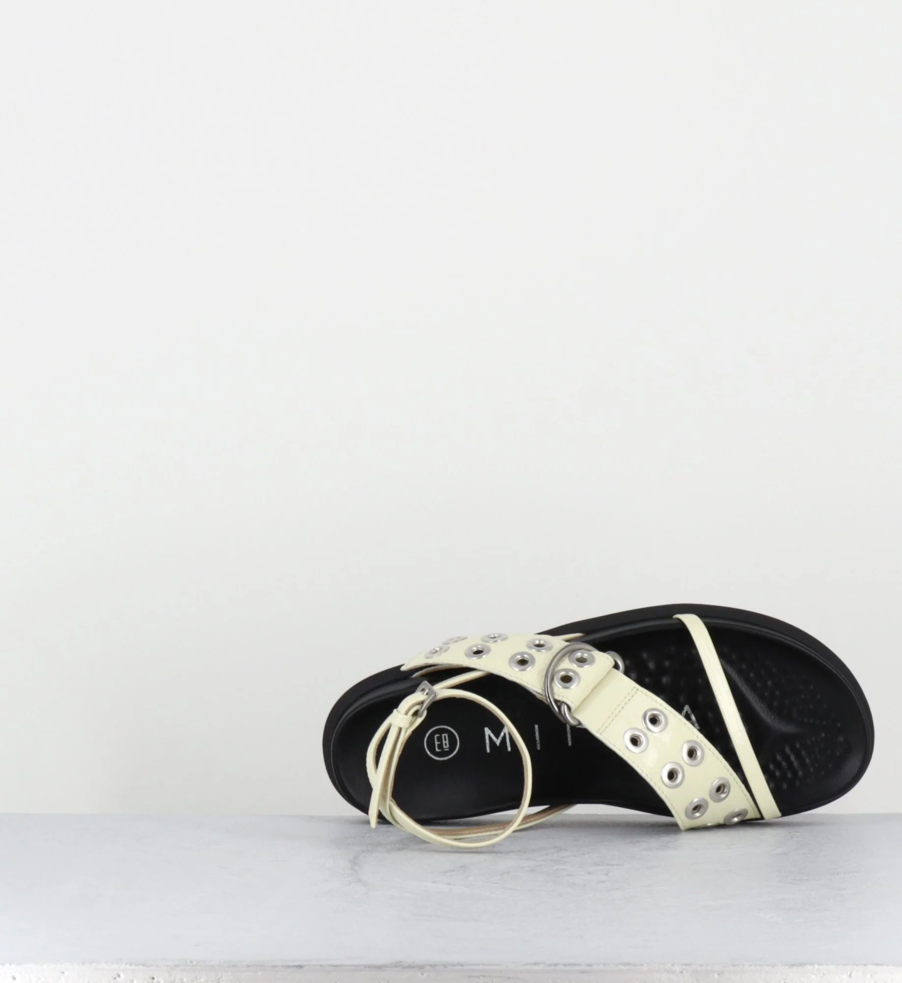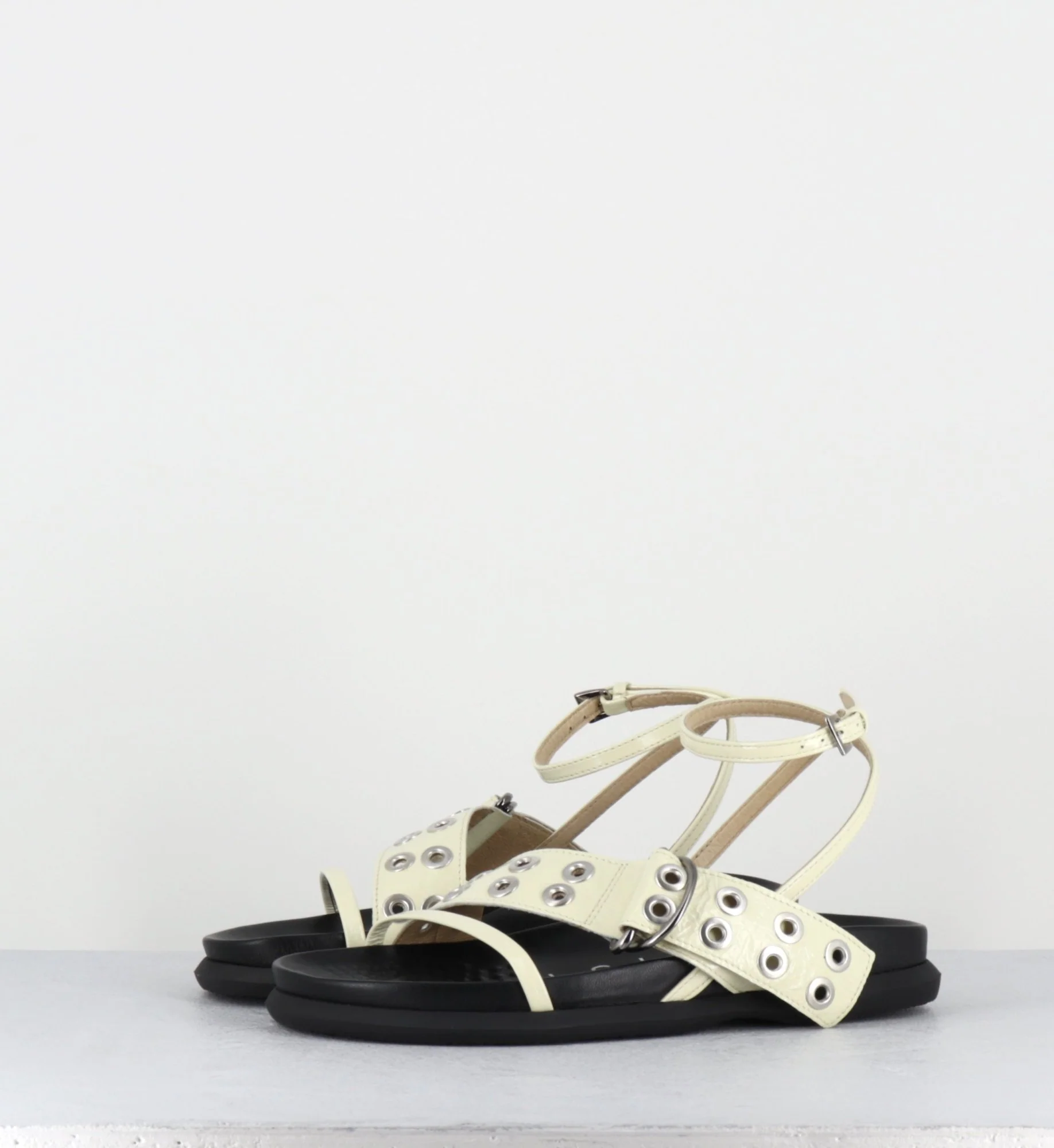 Sandales plates en cuir vernis crème, large bride ceinture à oeillets, montées sur une semelle anatomique confortable