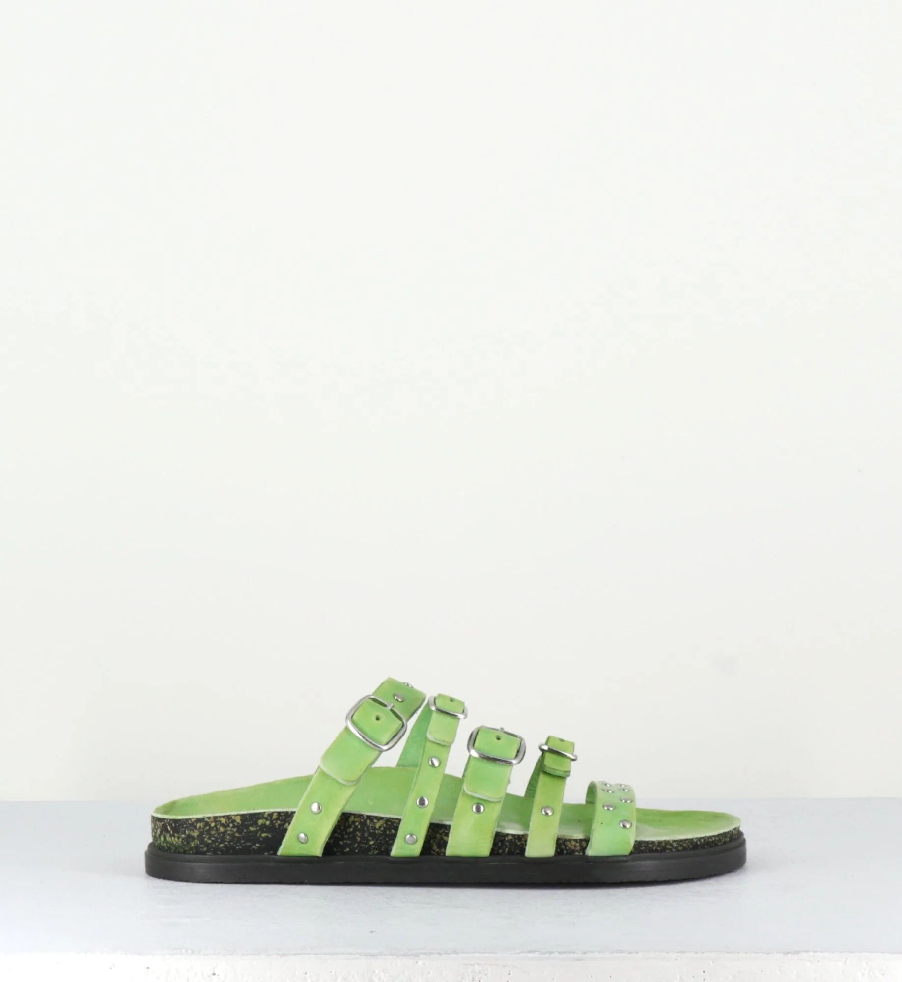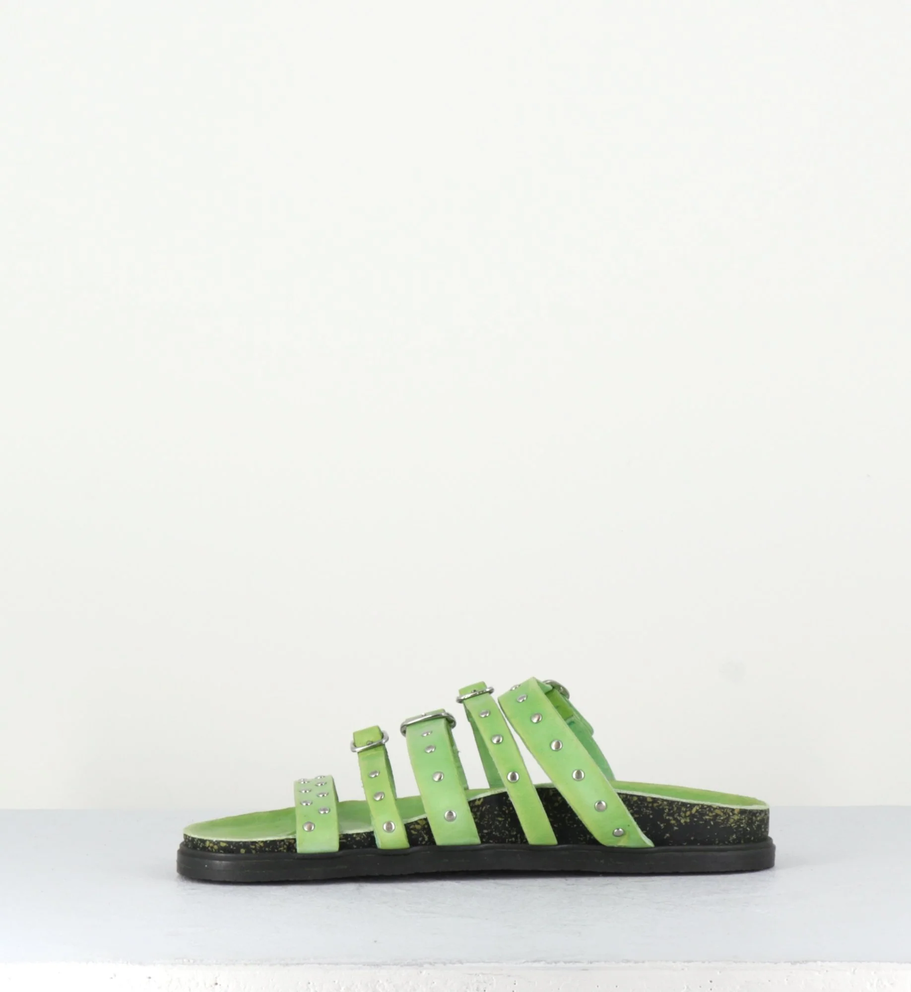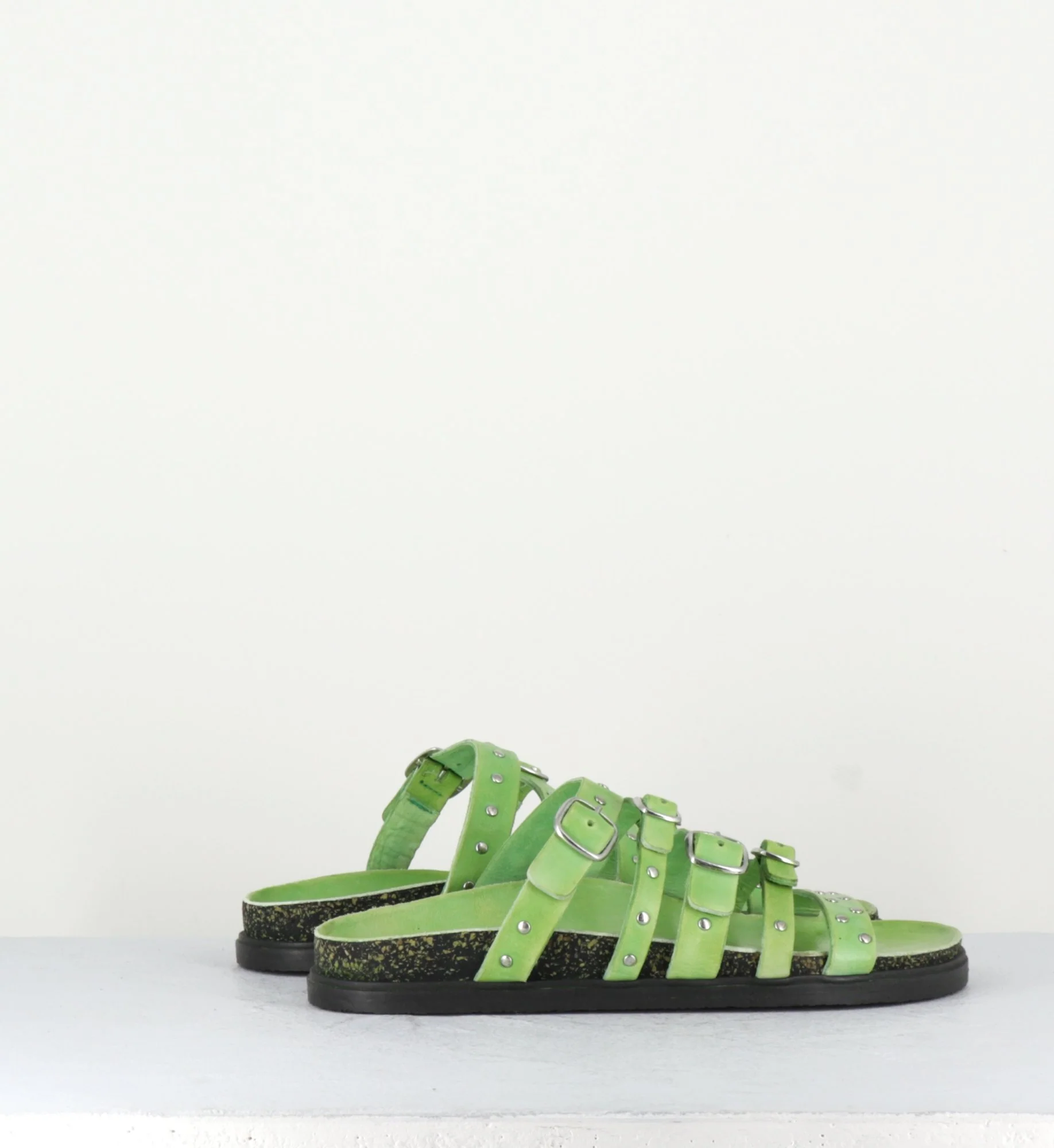 Sandales plates multi-brides à clous & boucles en cuir lavé vert clair, montées sur une semelle anatomique en gomme très souple.