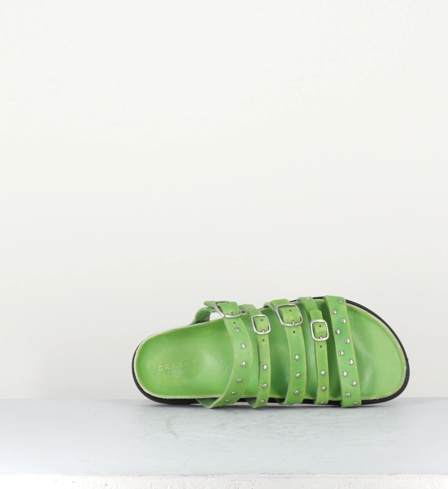 Sandales plates multi-brides à clous & boucles en cuir lavé vert clair, montées sur une semelle anatomique en gomme très souple. Fabrication Artisanale Italienne – Ateliers Brador Chausse normalement