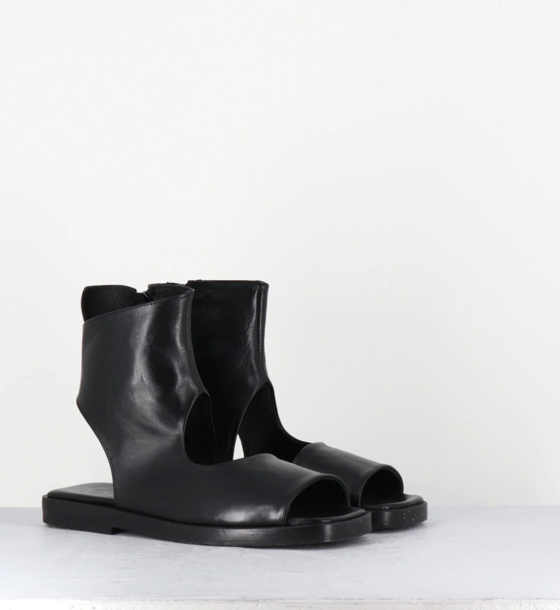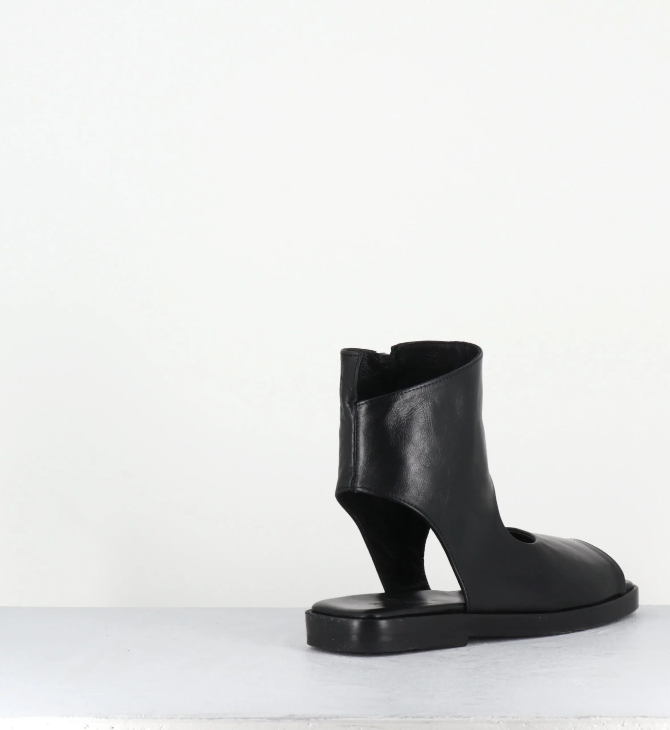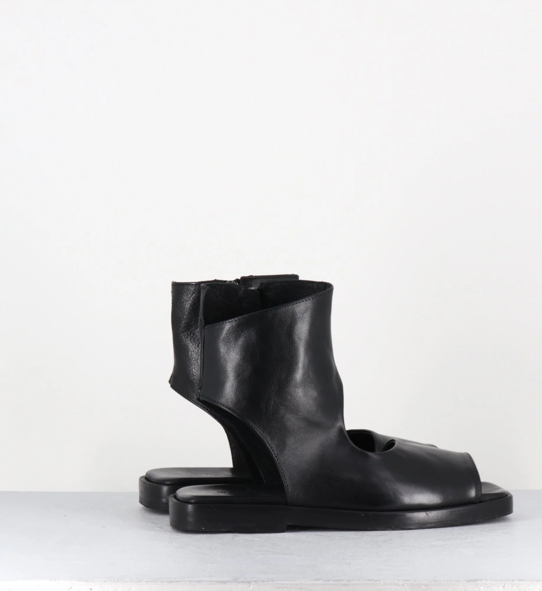 Sandales plates en cuir souple noir esprit ‘open-boots’, bout carré doux, ligne pure déstructuré avec zip intérieur