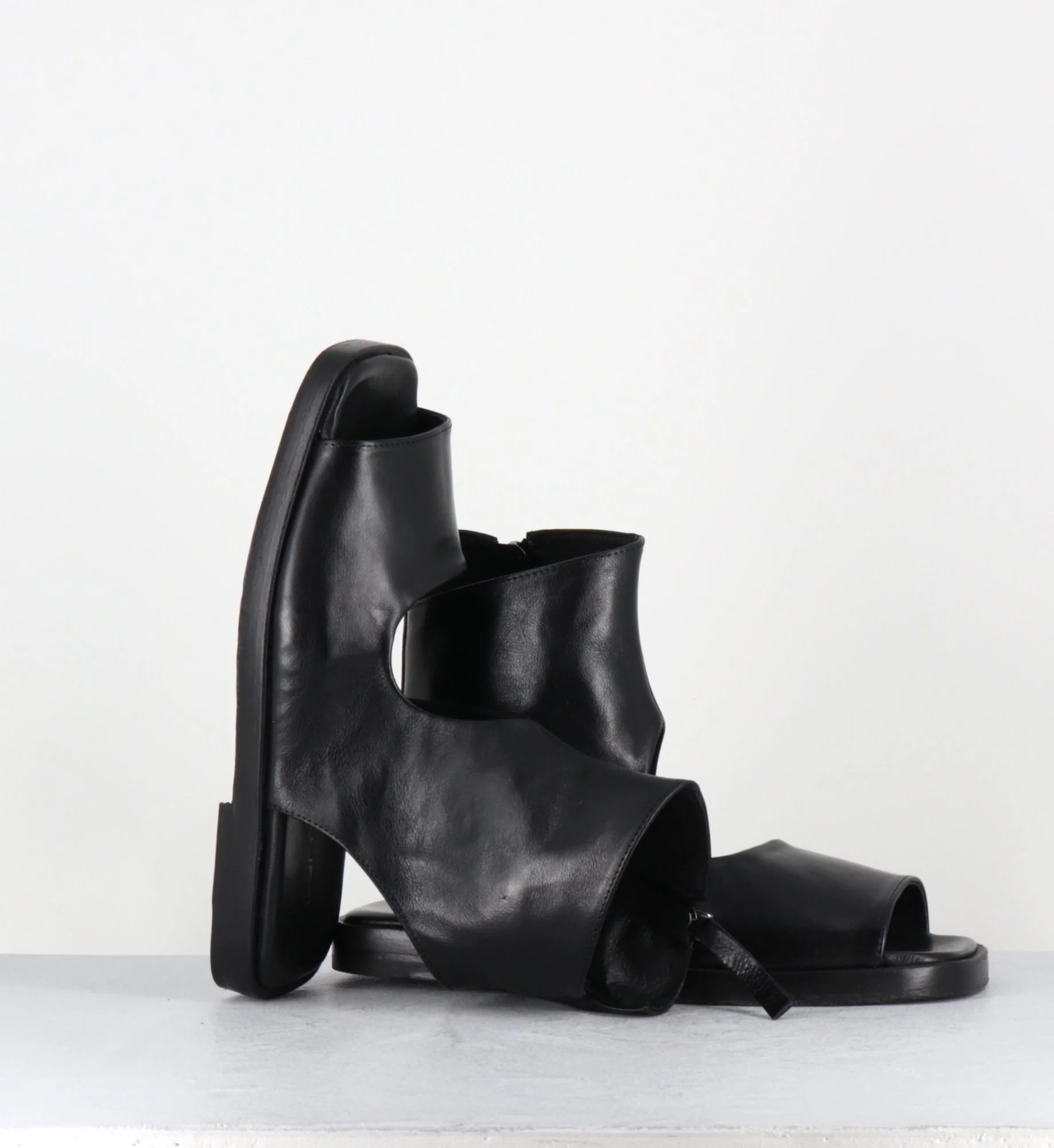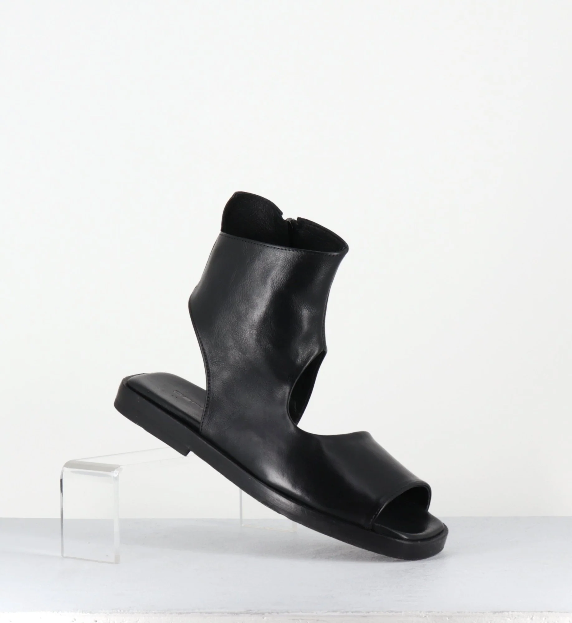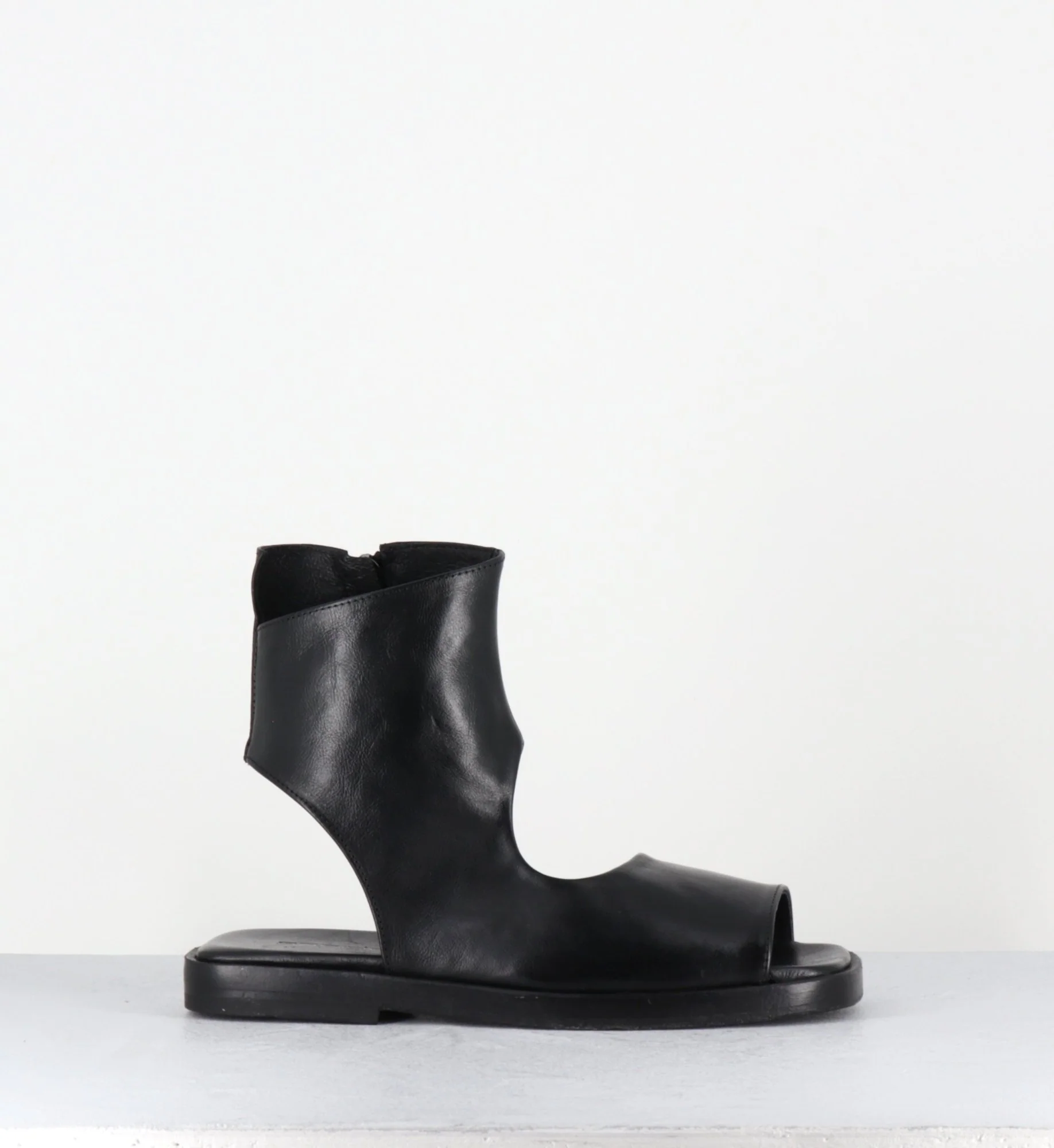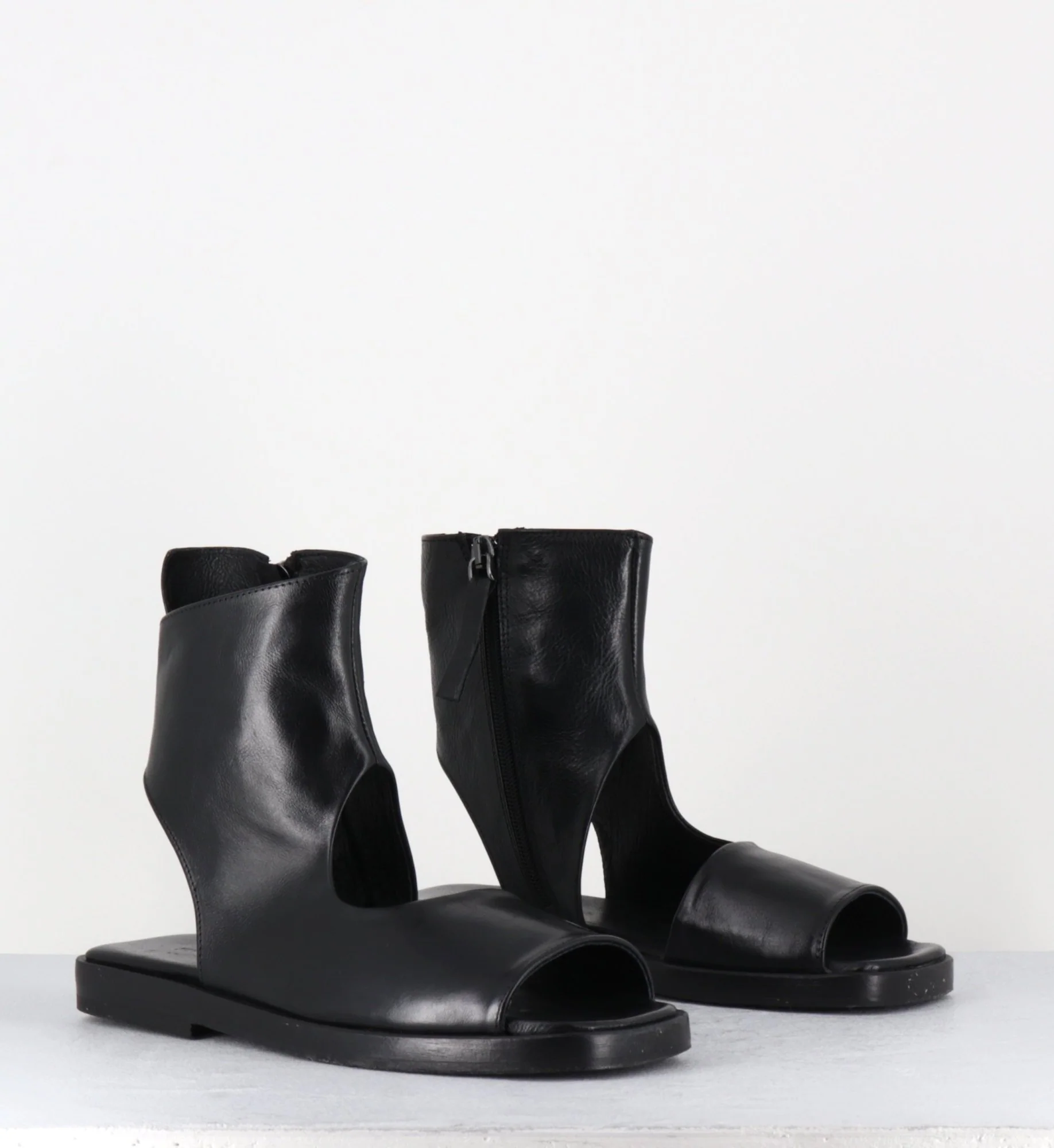 Sandales plates en cuir souple noir esprit ‘open-boots’, bout carré doux, ligne pure déstructuré avec zip intérieur