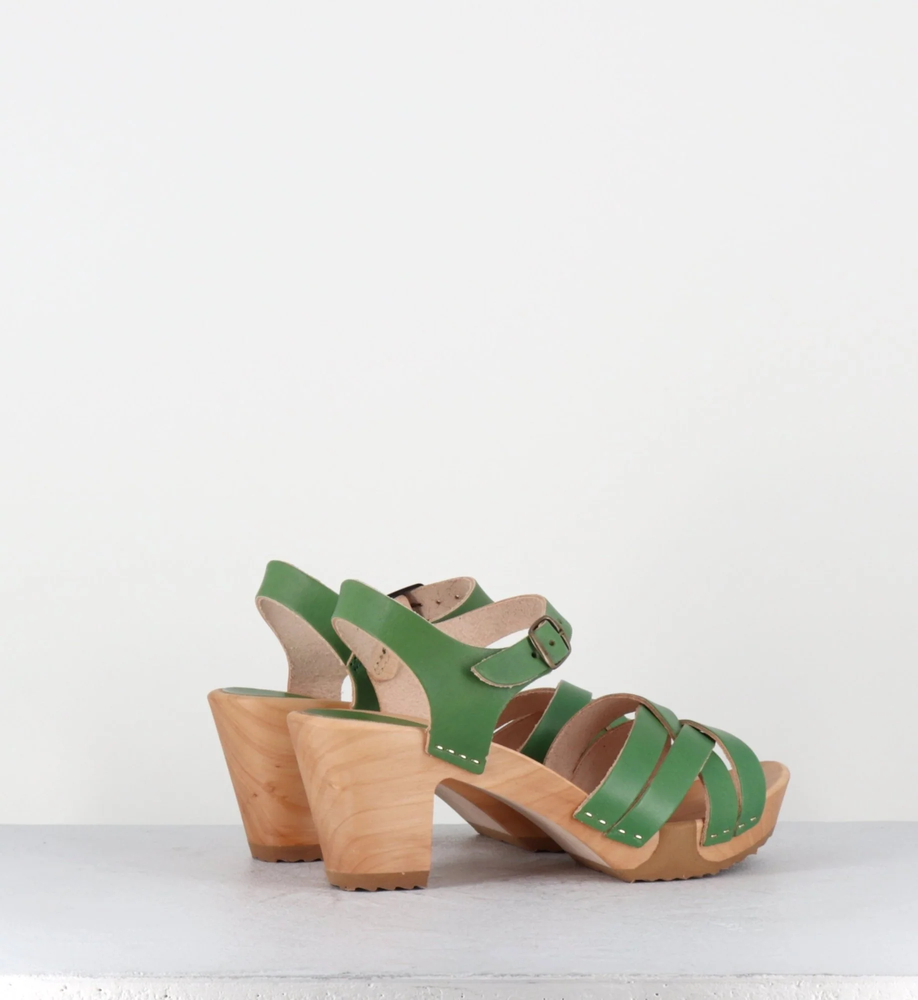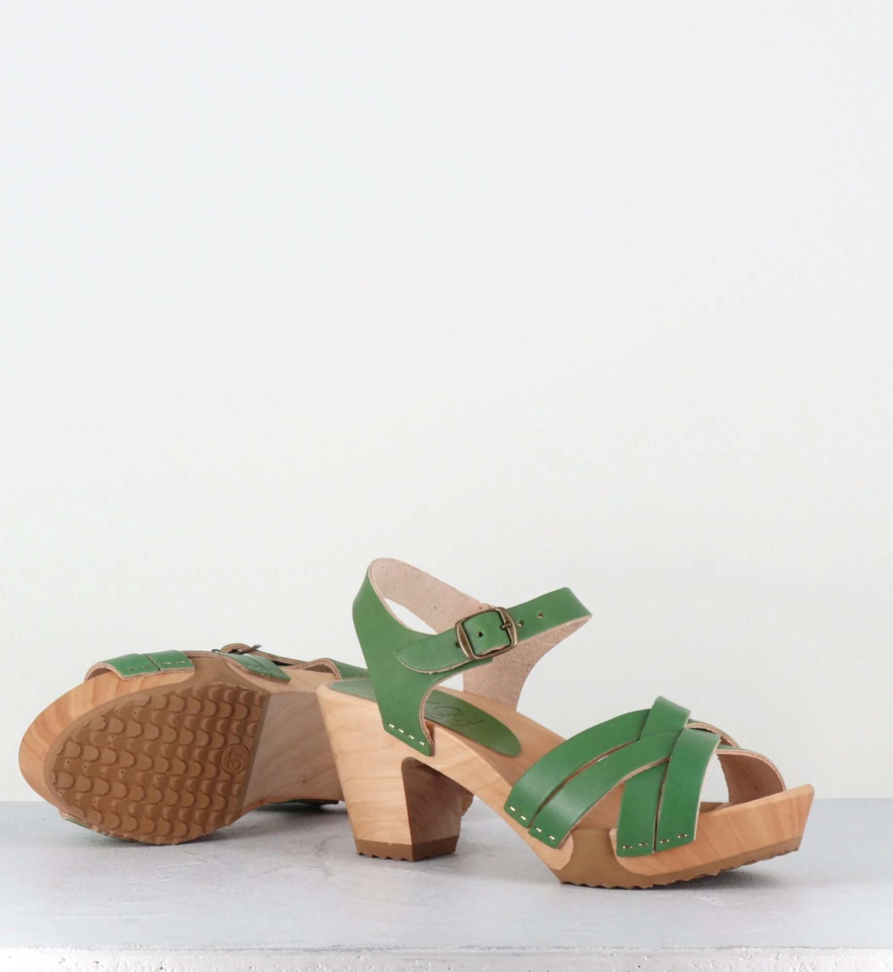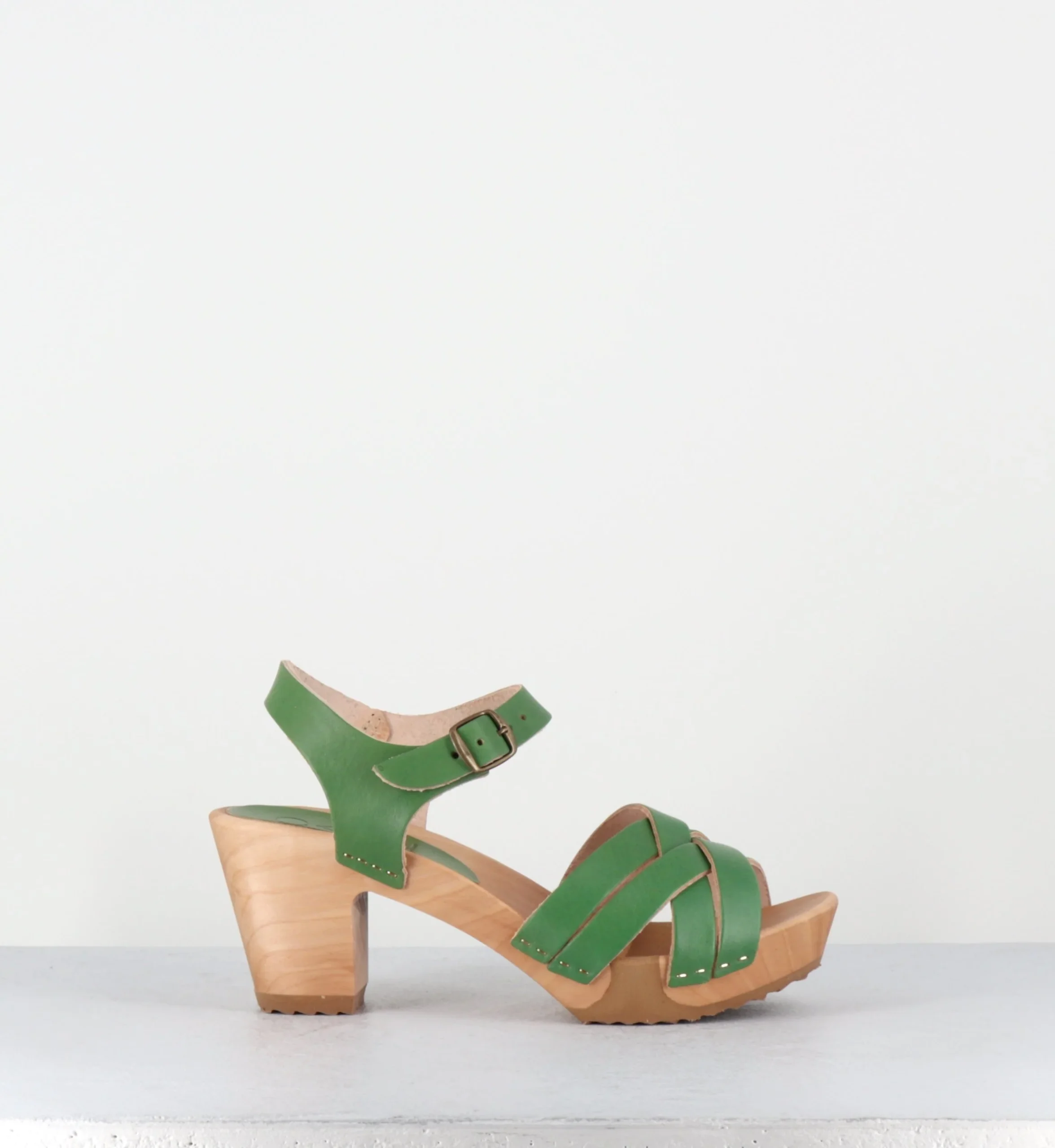 Sandales-sabots multi-brides en cuir vert pomme, montées sur une semelle à talon moyen, réalisée dans un bois naturel ultra léger avec un insert de caoutchouc qui permet une vrai flexibilité ! D’un grand confort