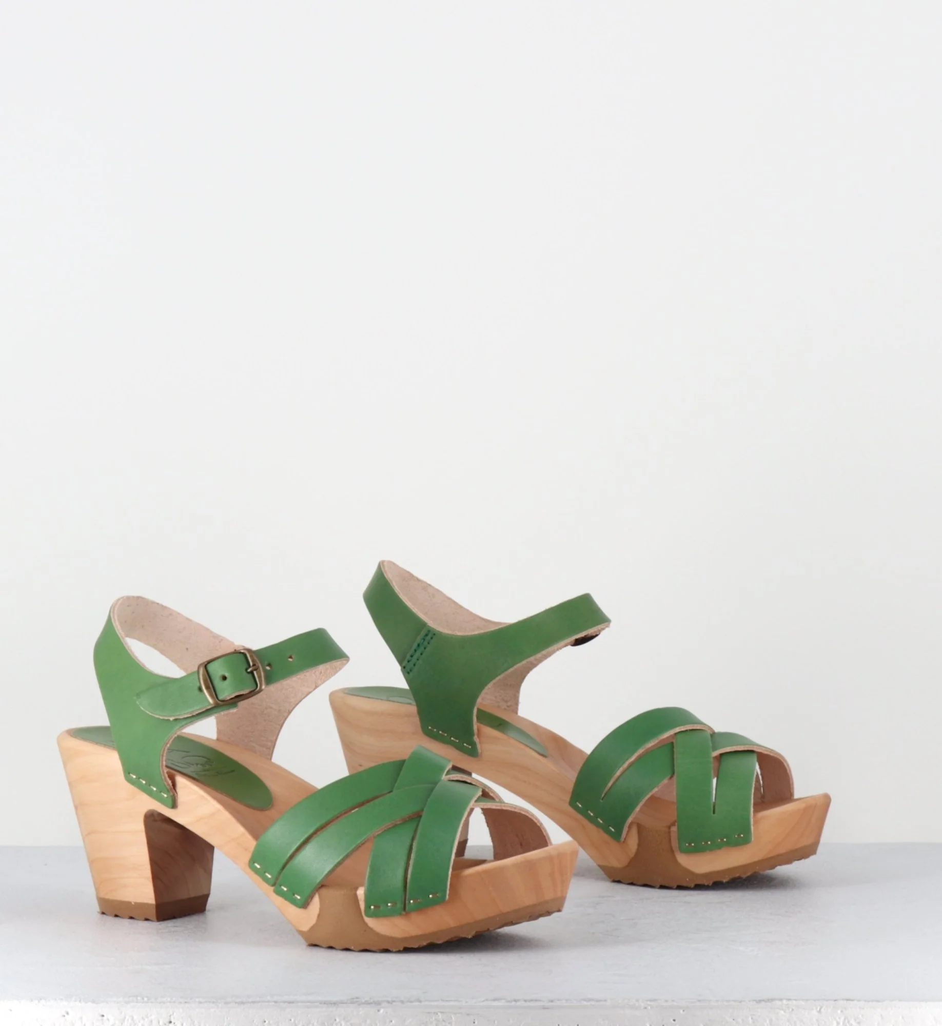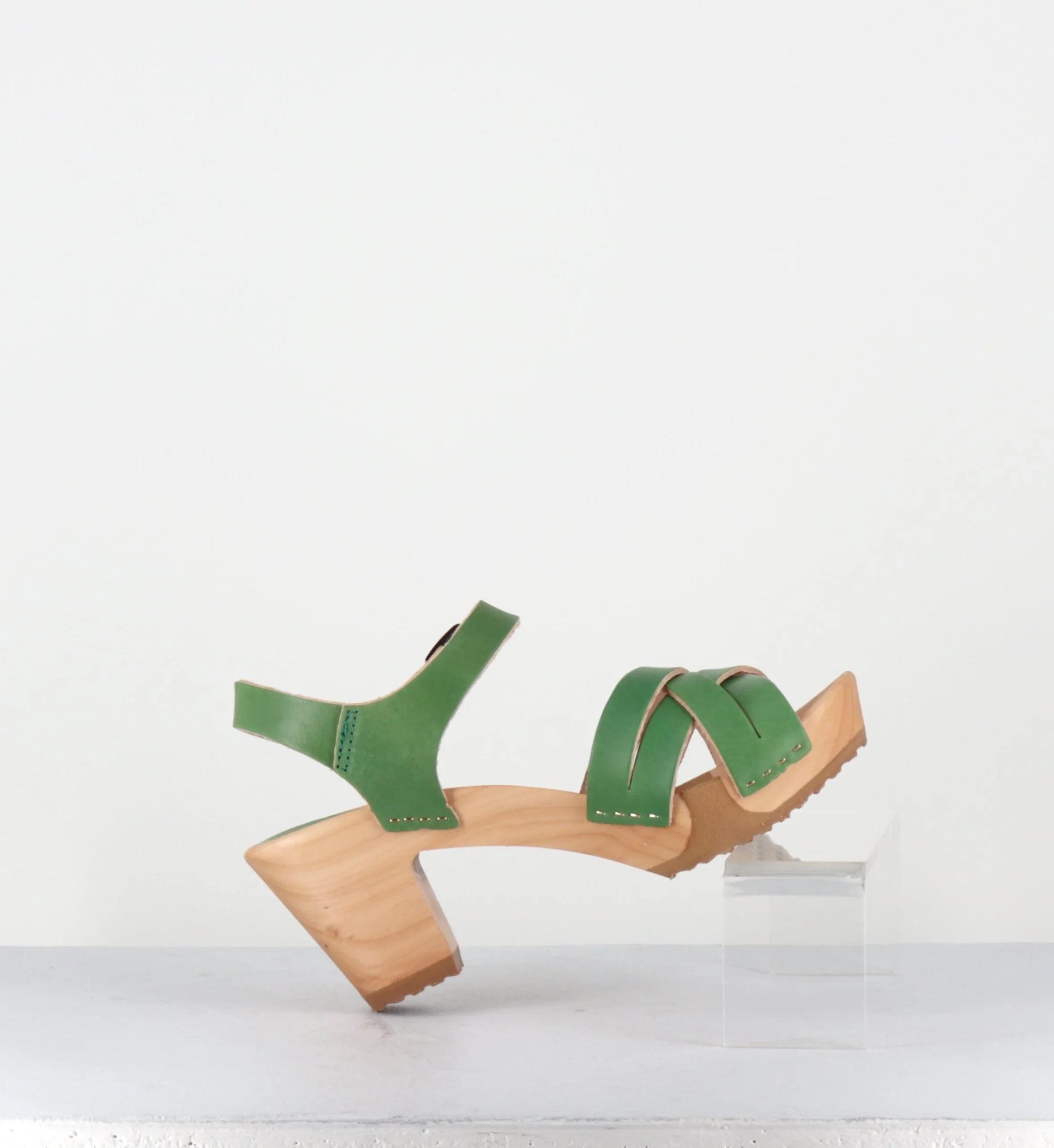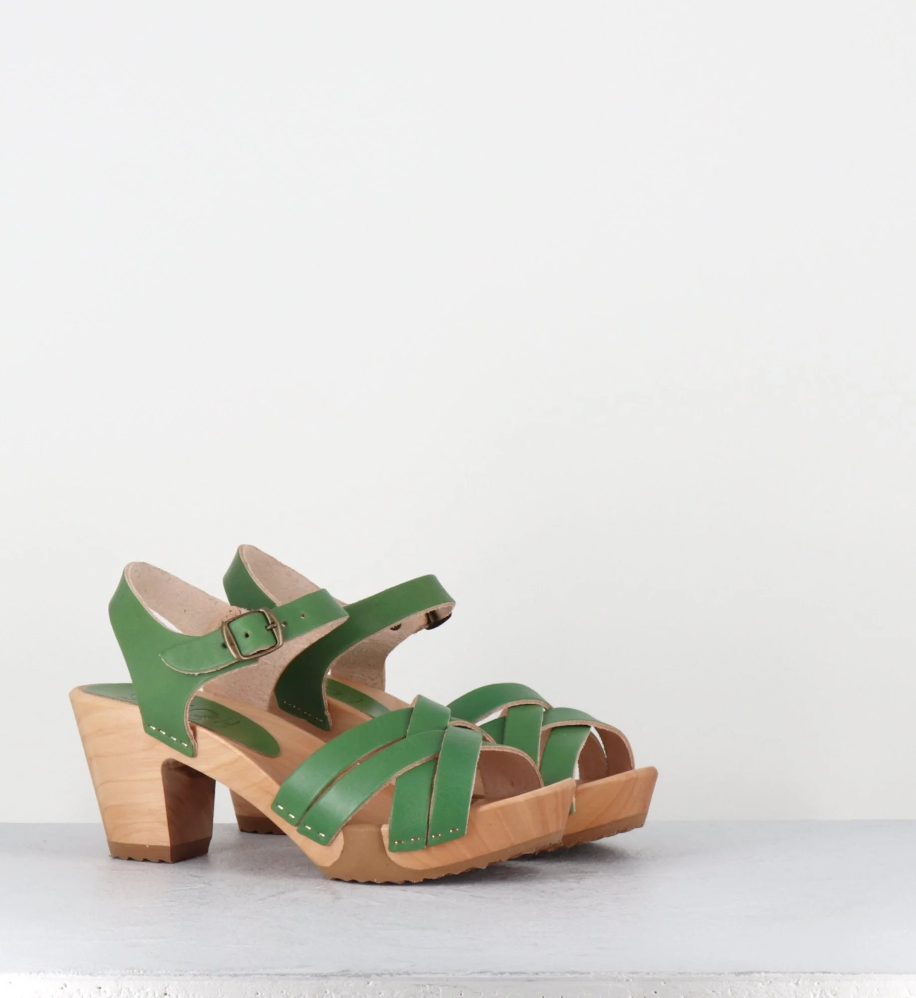 Sandales-sabots multi-brides en cuir vert pomme, montées sur une semelle à talon moyen, réalisée dans un bois naturel ultra léger avec un insert de caoutchouc qui permet une vrai flexibilité ! D’un grand confort