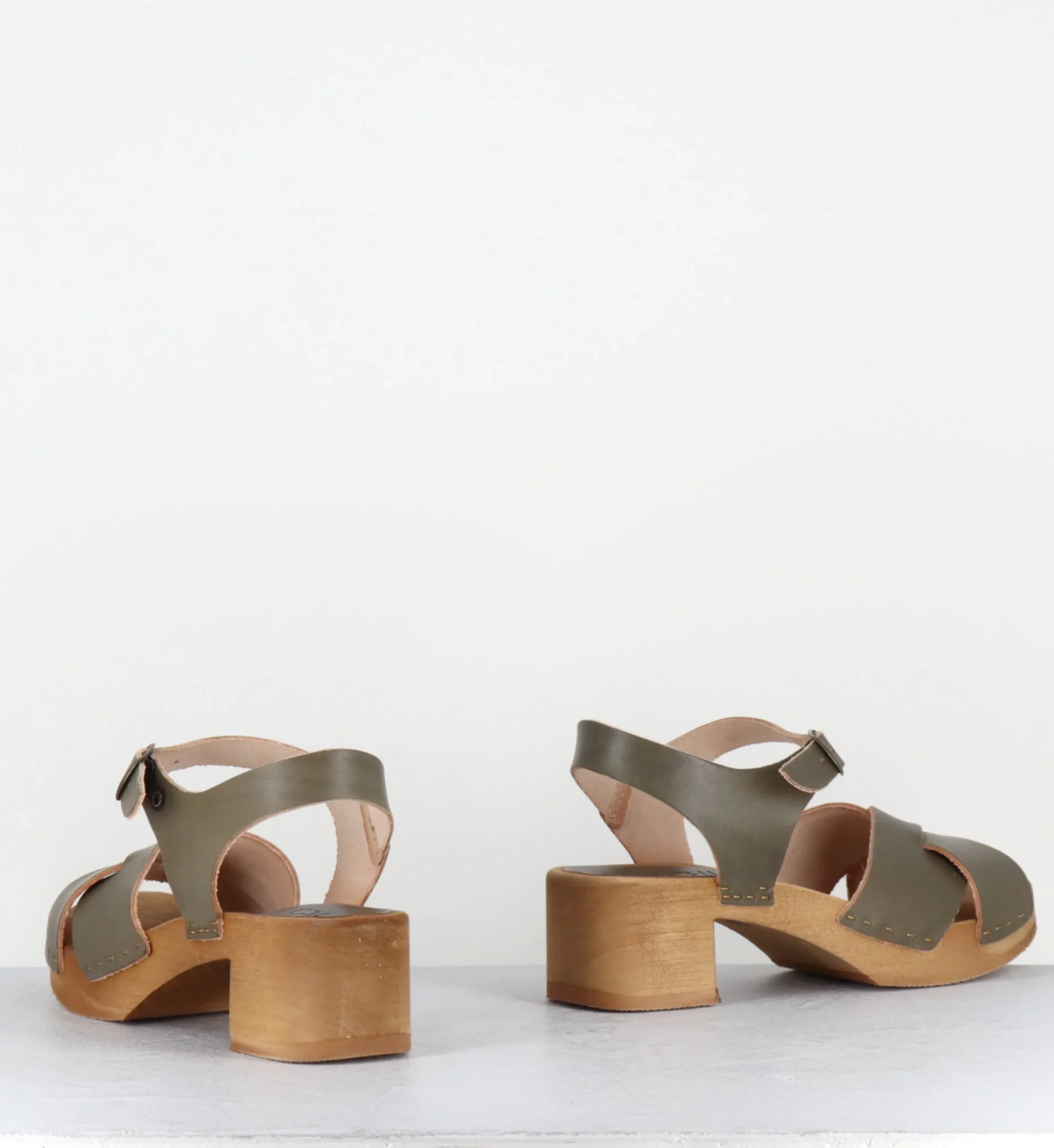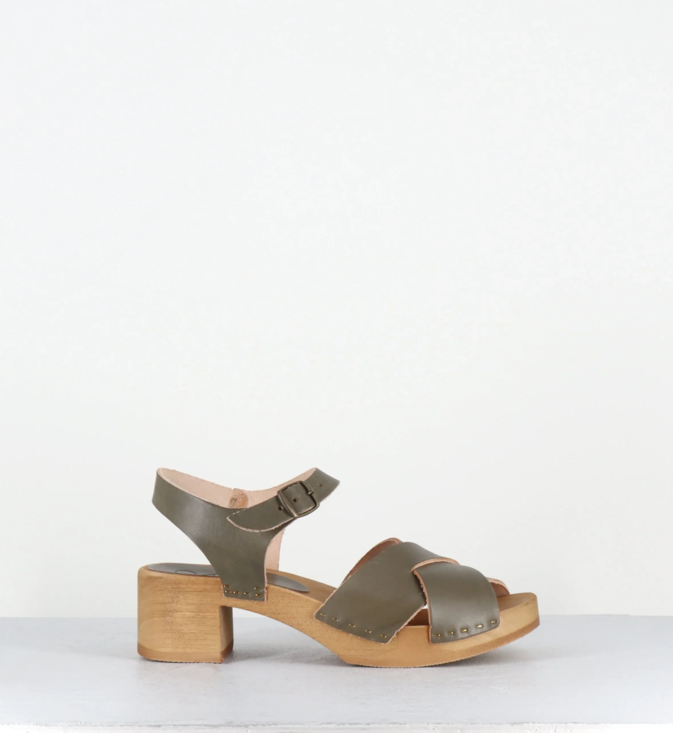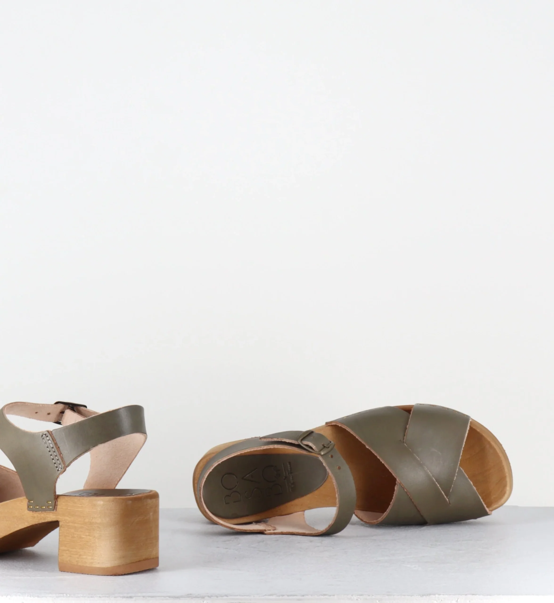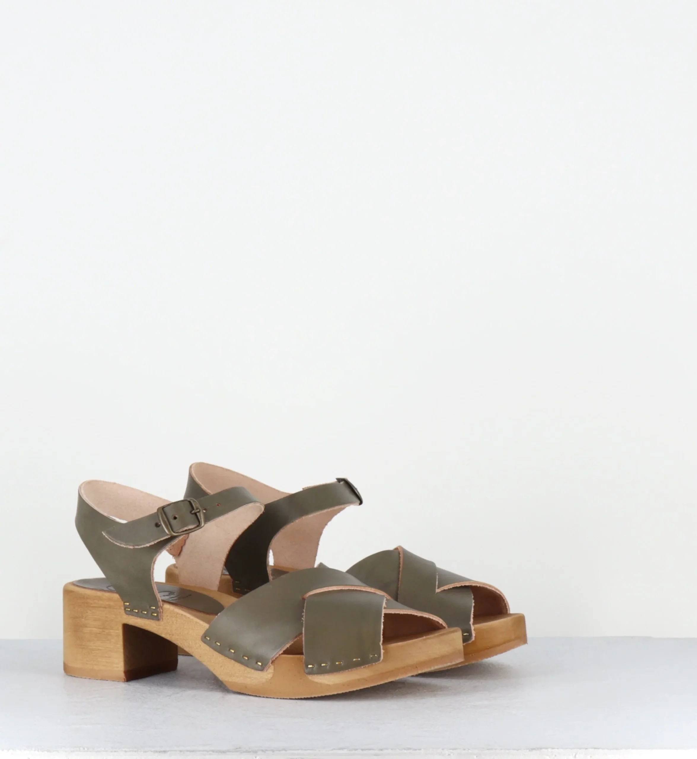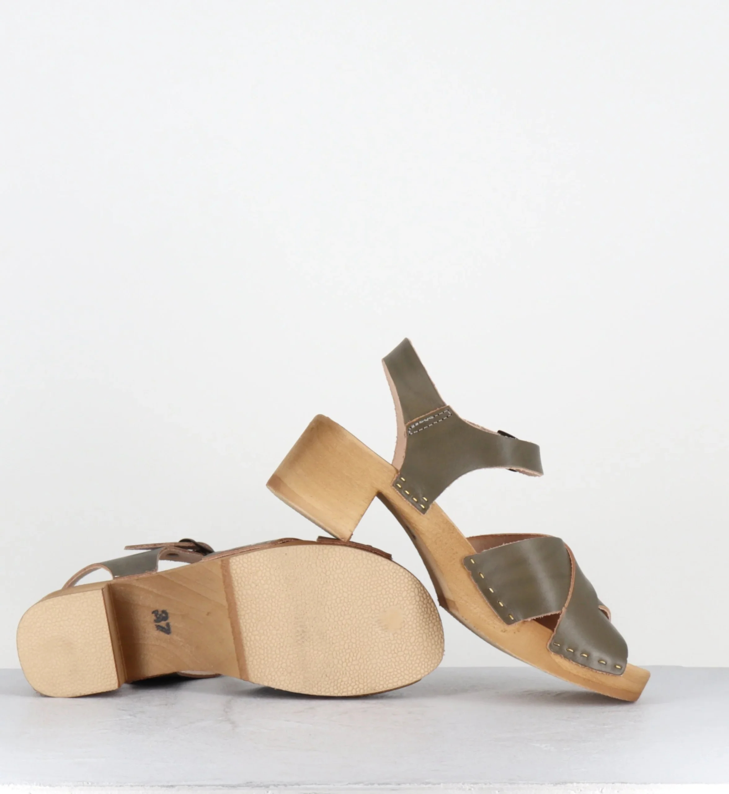 Sandales-sabots brides croisées en cuir vert kaki, montées sur une semelle à petit talon, réalisées dans un bois naturel ultra léger avec un insert de caoutchouc qui permet une vrai flexibilité ! D’un grand confort