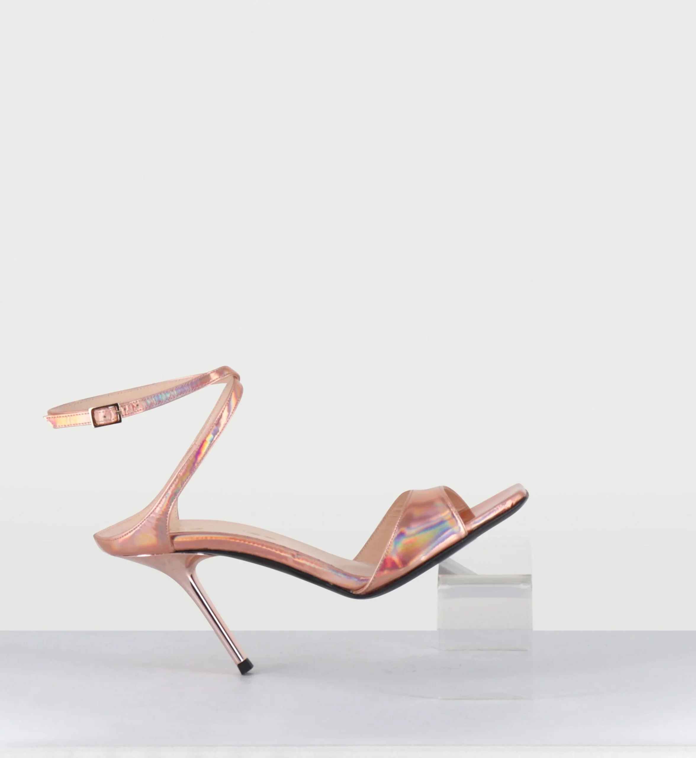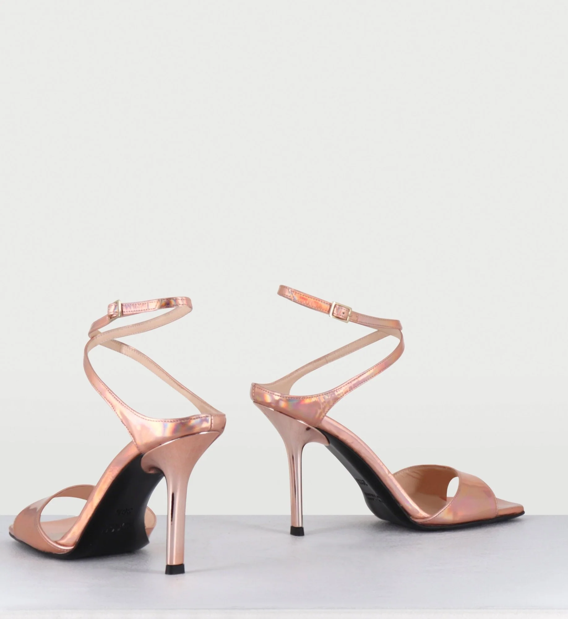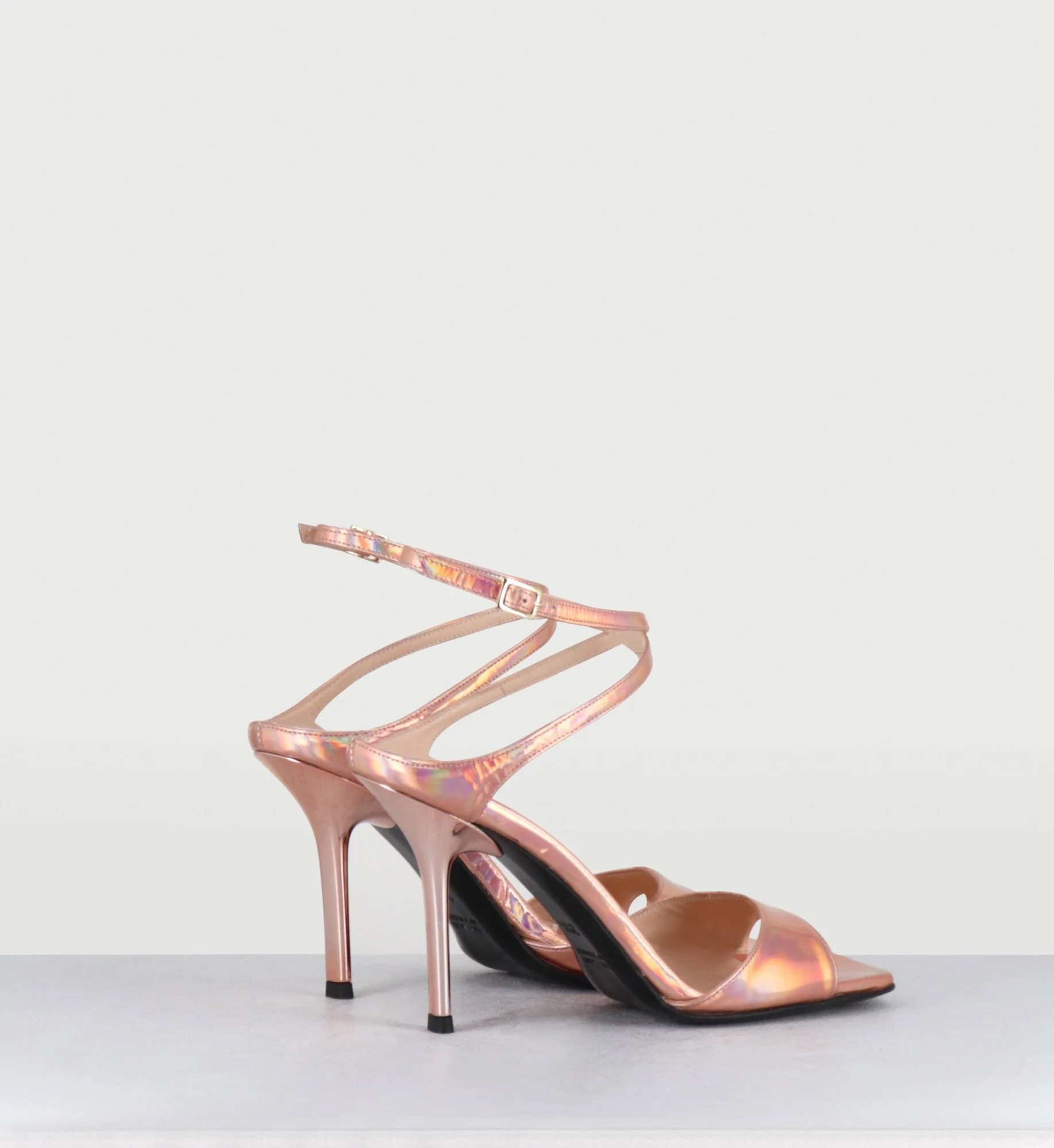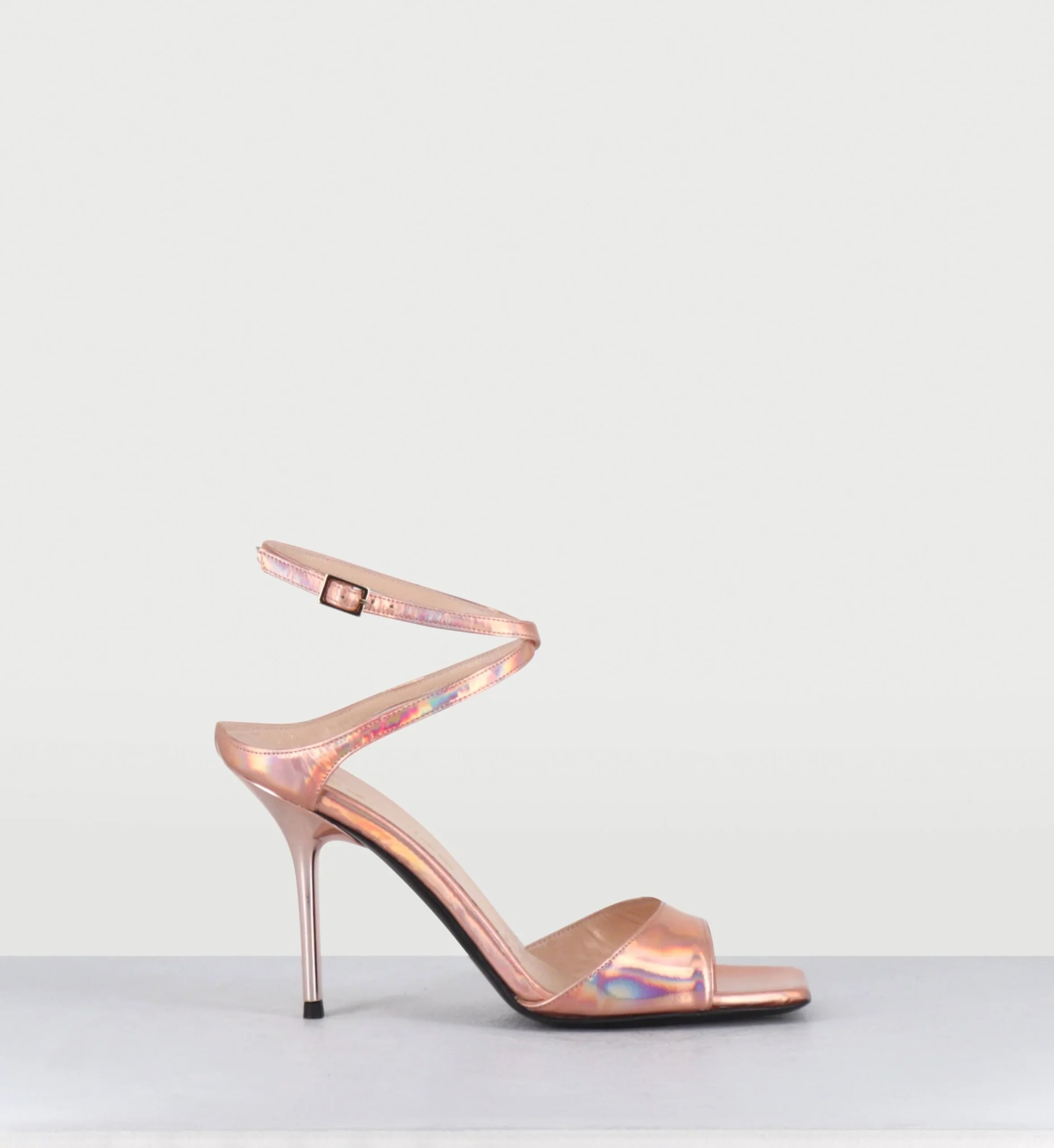 Sandales à talon haut en cuir glacé miroir rose, brie cheville réglable, bout carré esprit années 90, montées sur un talon stylisé laqué ton sur ton Fabrication Artisanale Italienne – Ateliers GarriceLab