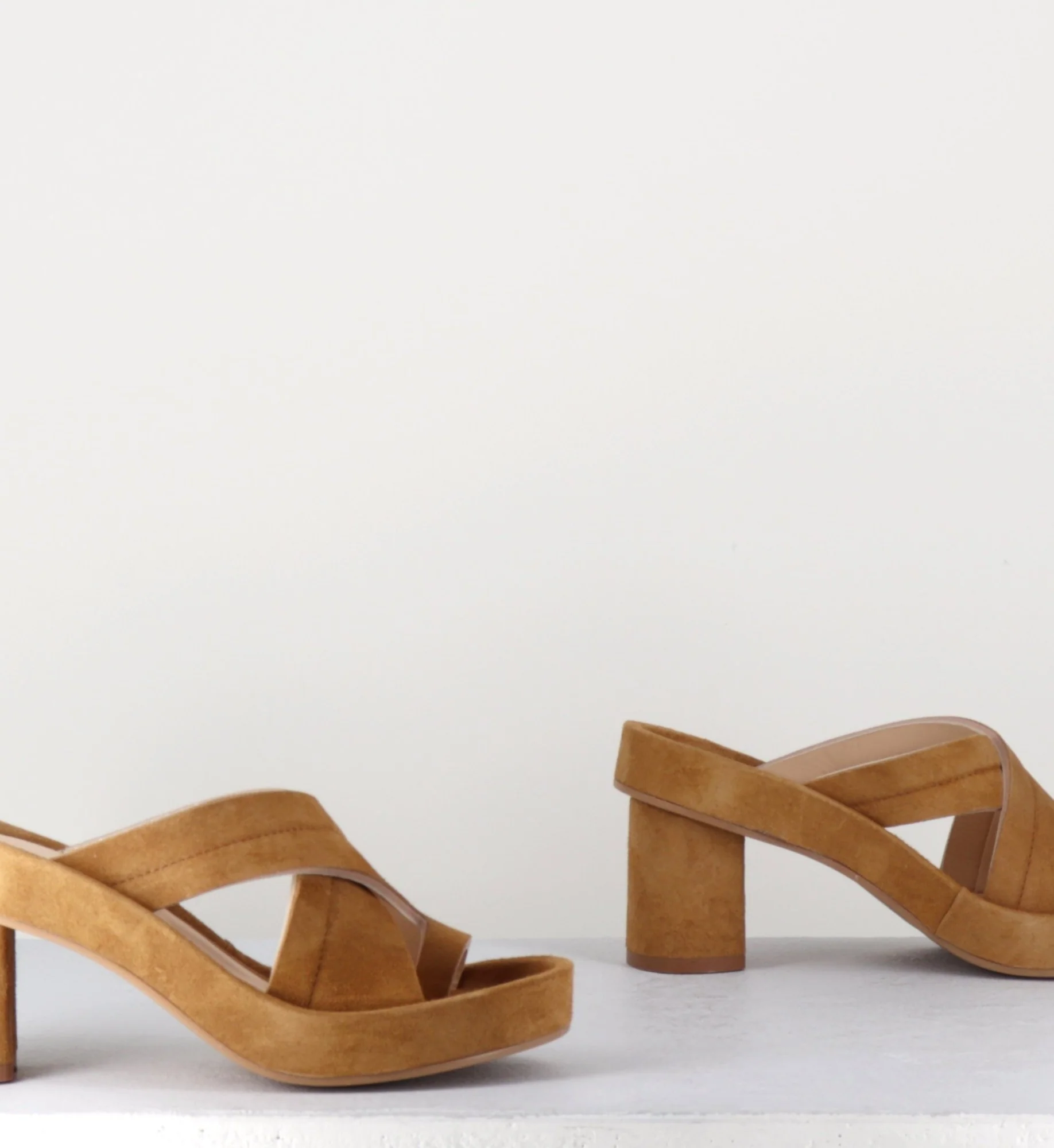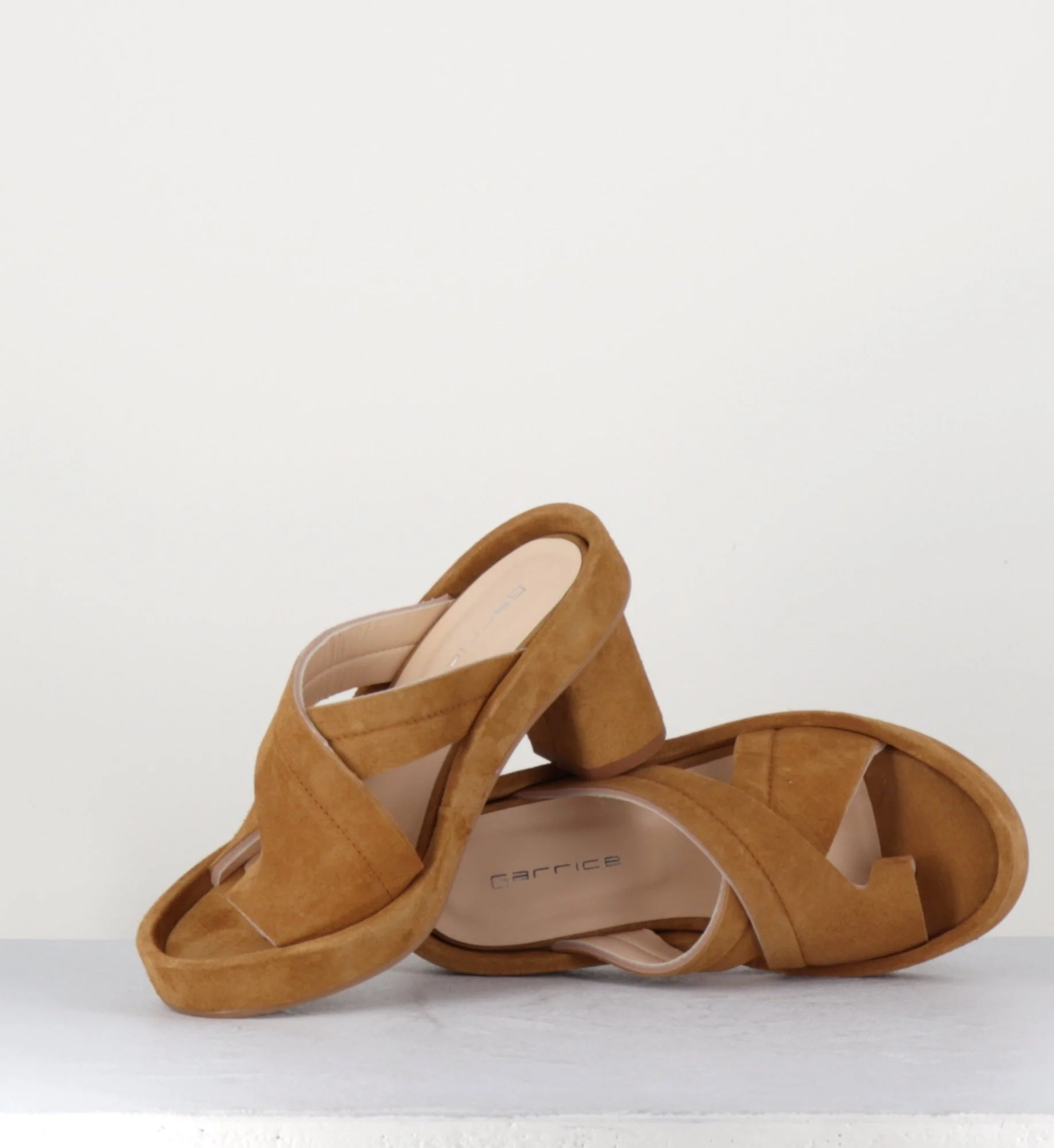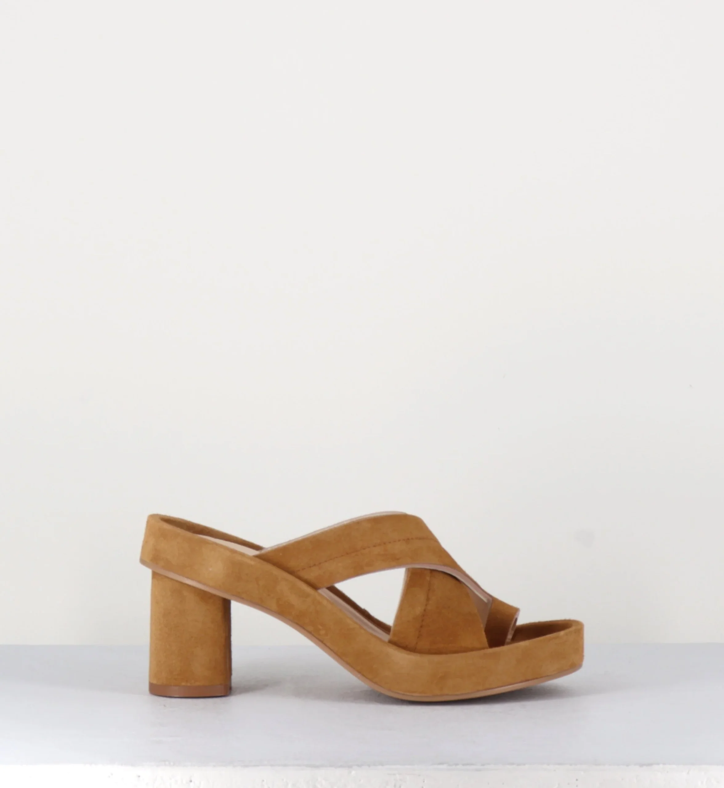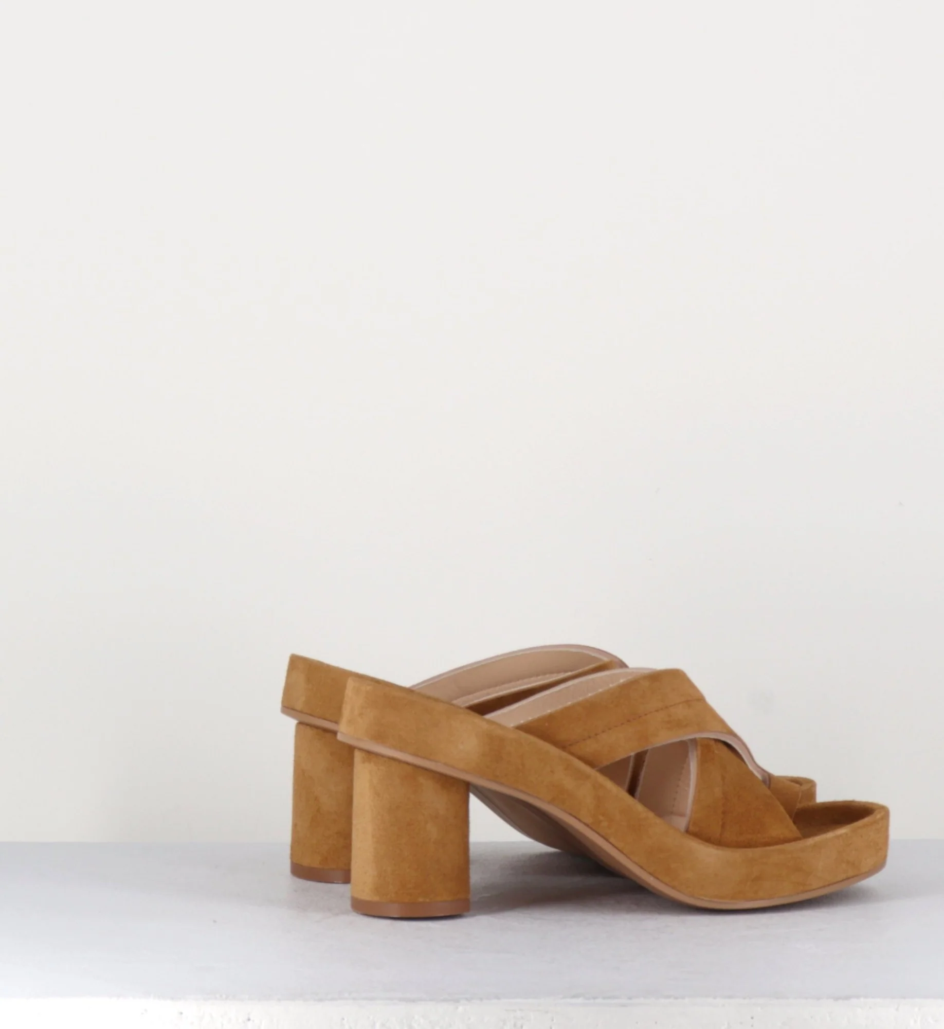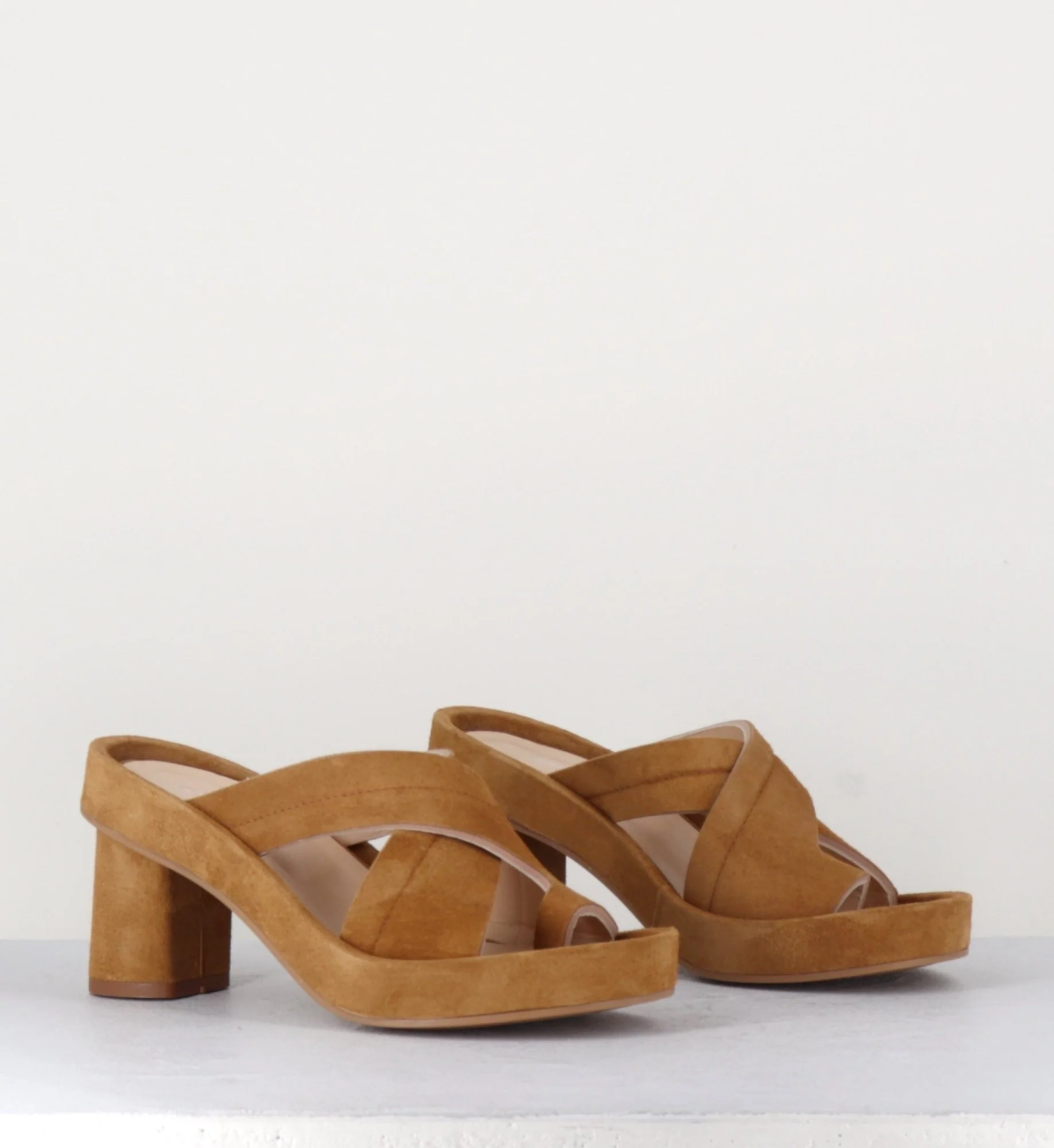 Sandales mules en daim souple camel à entre-doigts, semelle à débord, montées sur un petit talon géométrique recouvert confortable et une fine plateforme.