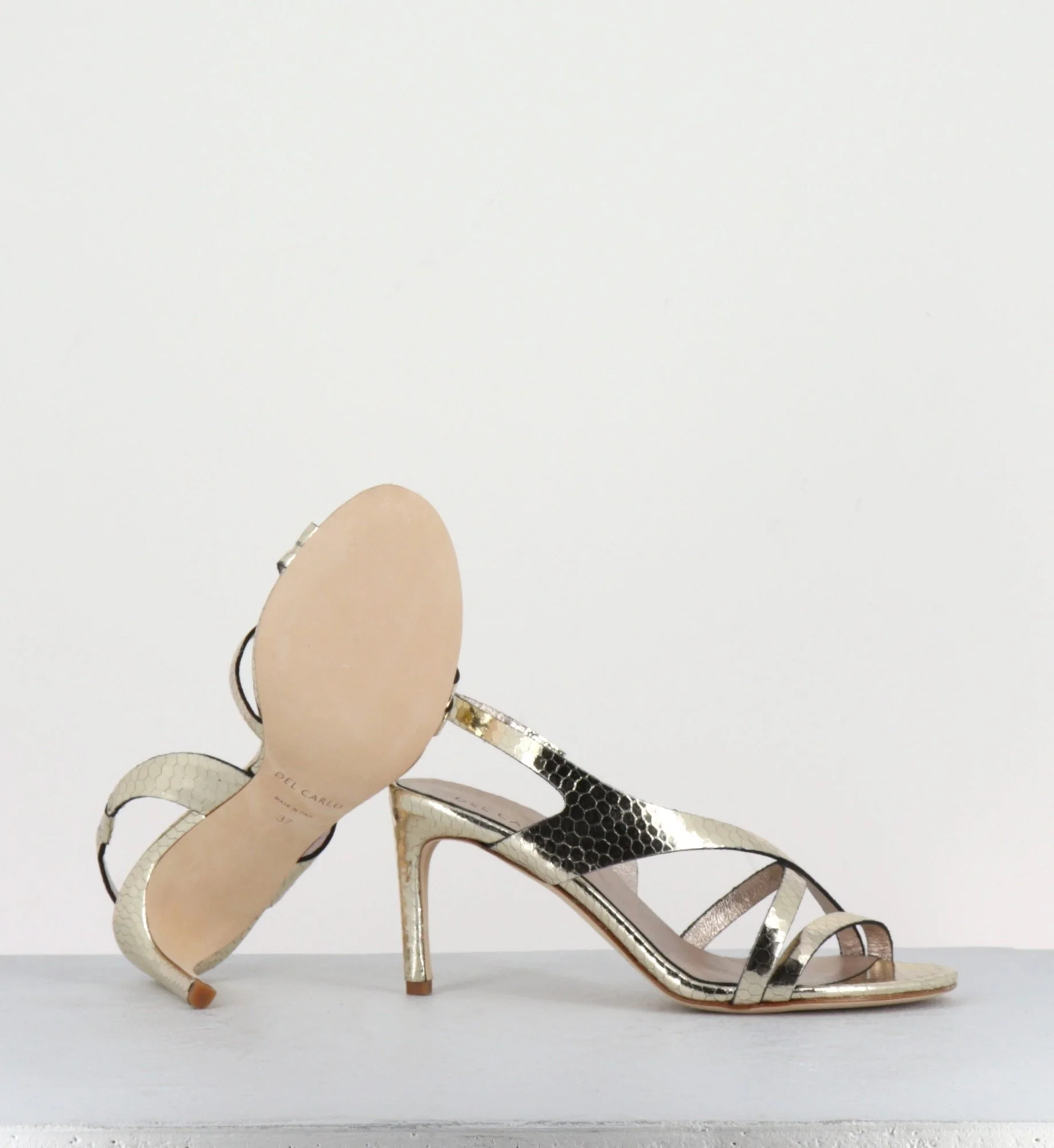 Sandales en cuir imprimé serpent métallisé doré clair, bout en amande, élégantes brides asymétriques avec bride arrière slingback avec petit élastique de confort, montées sur un talon fin Fabrication Artisanale Italienne – Ateliers Del Carlo