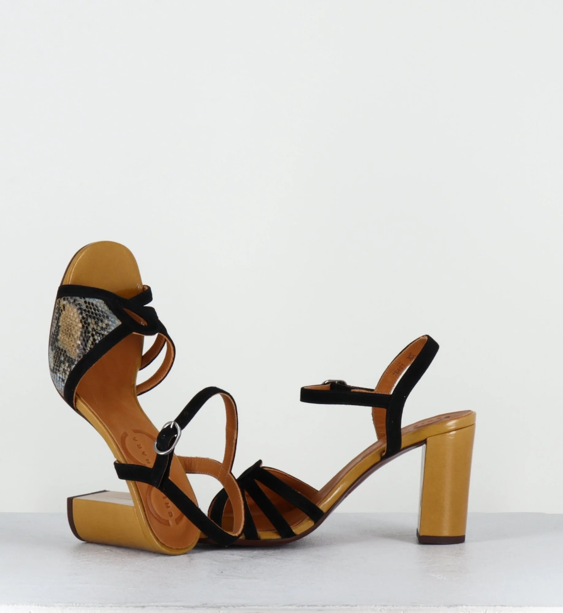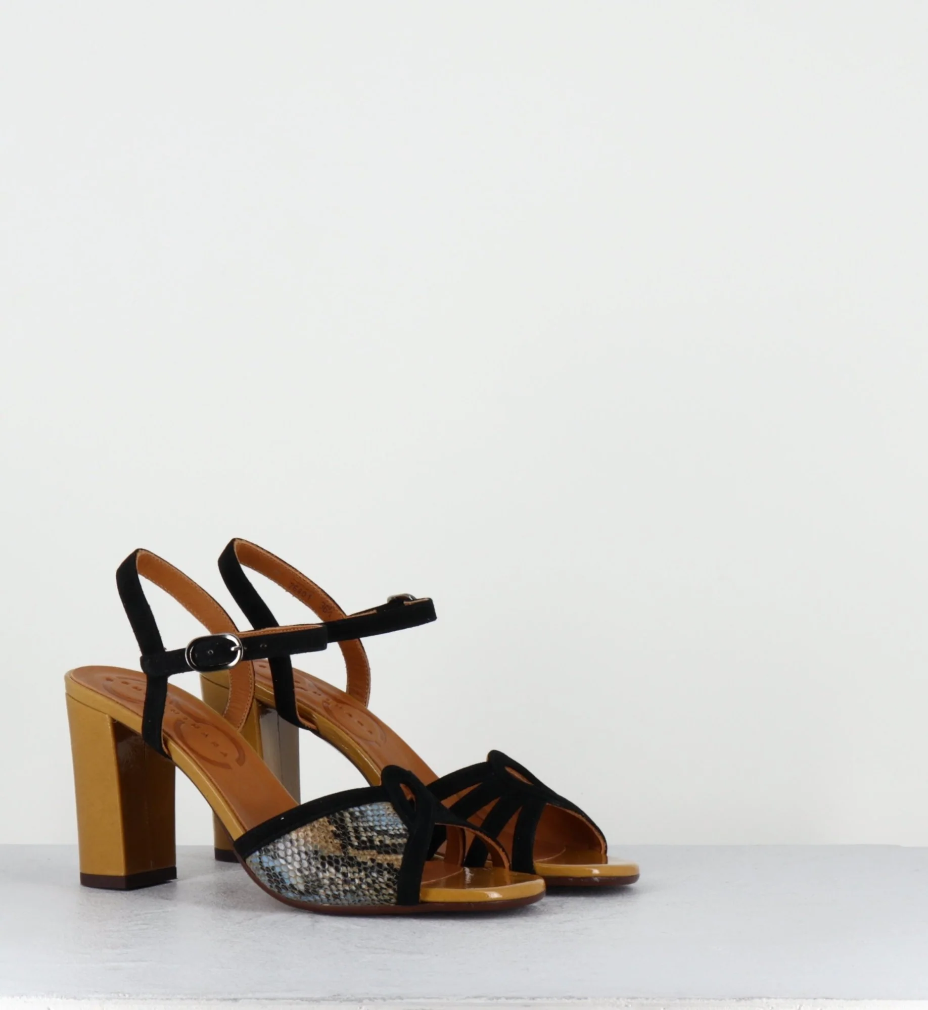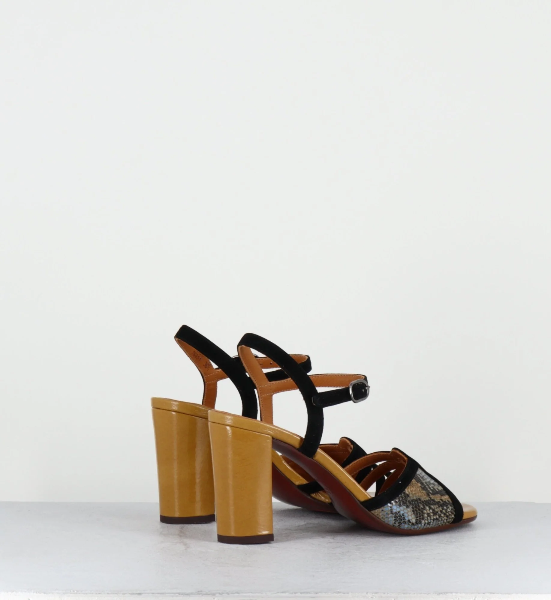 Sandales en cuir jaune moutarde, bout arrondi, impression serpent tons bleus & détails de daim noir; montées sur un haut talon droit.