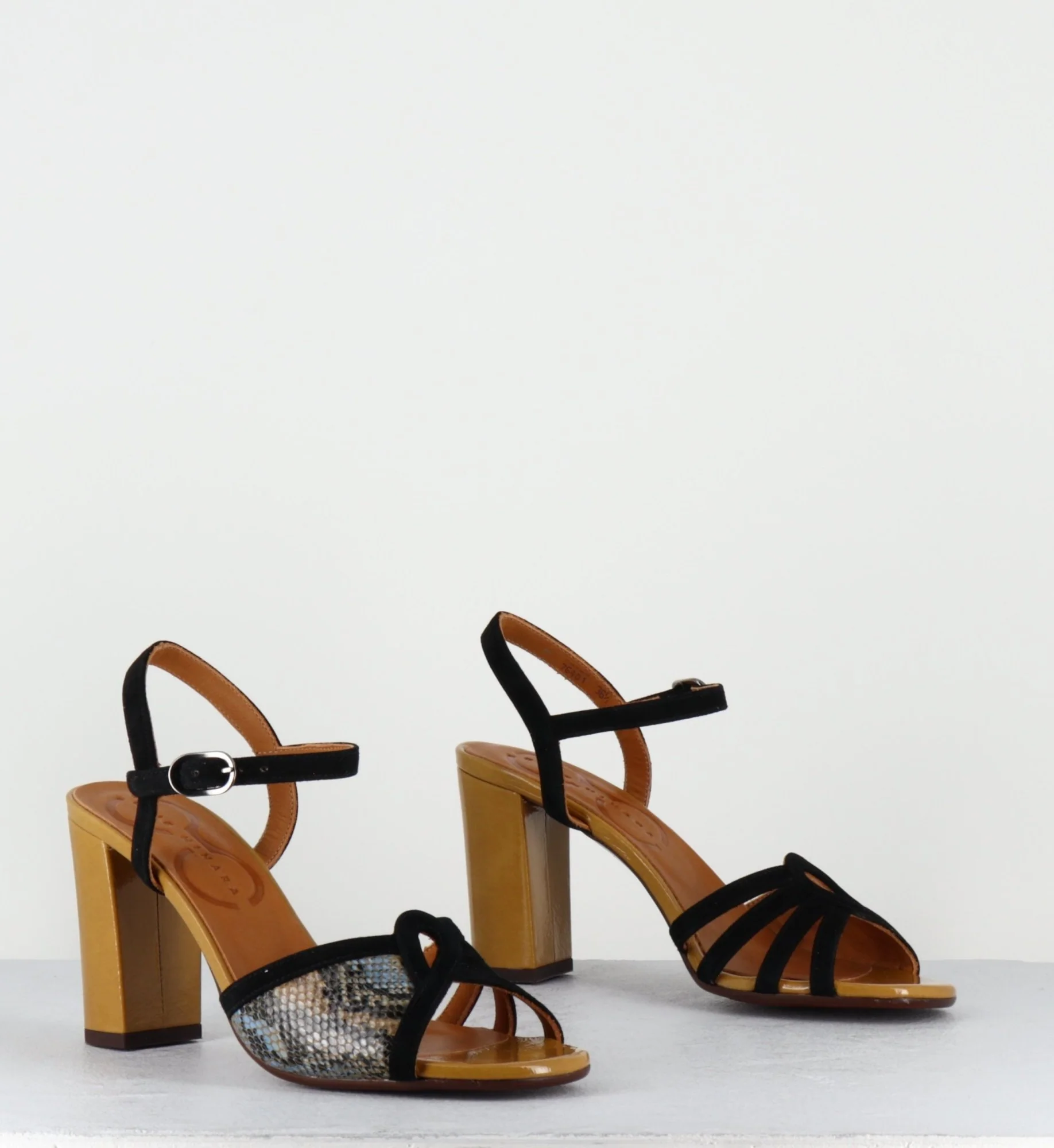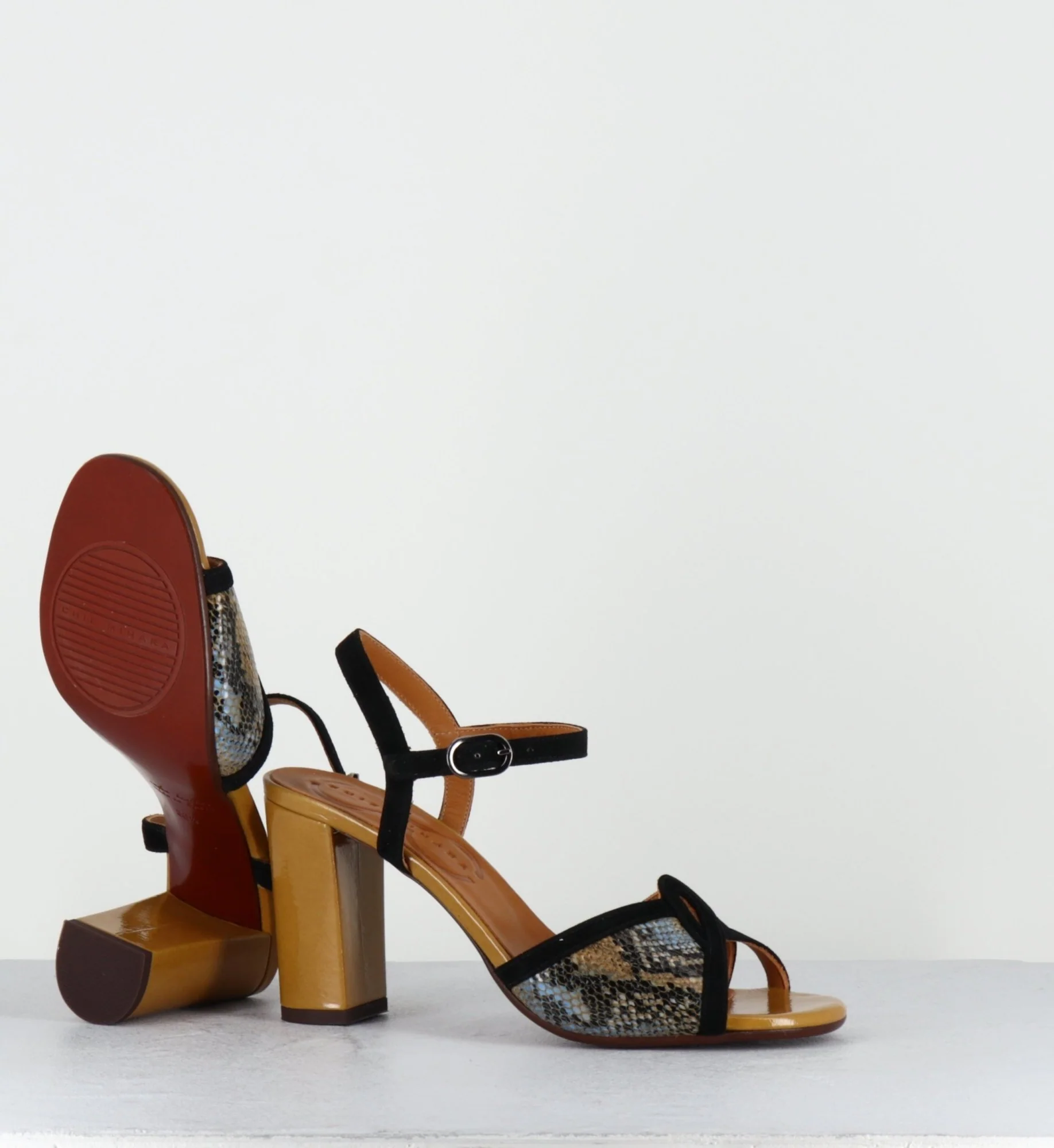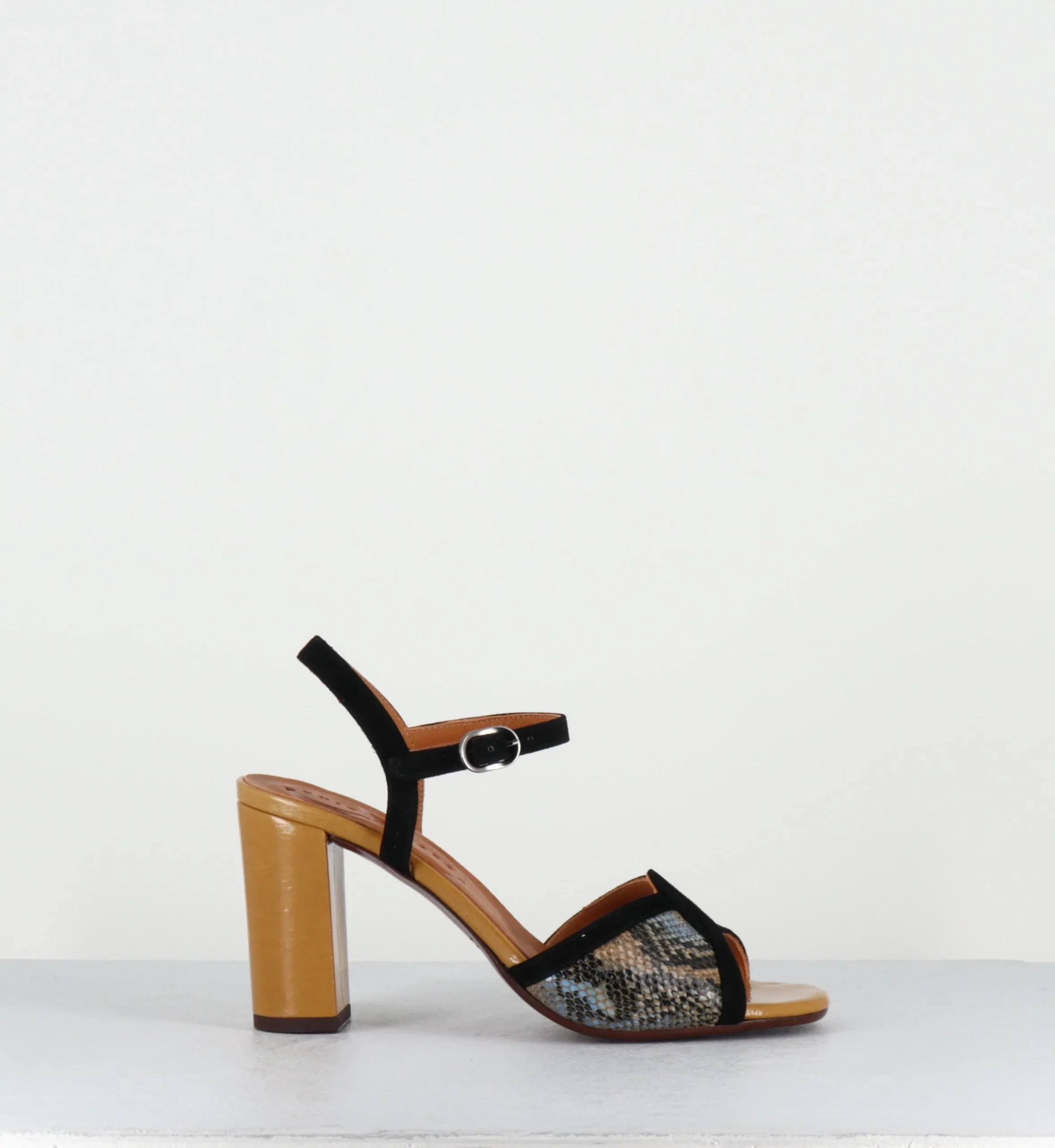 Sandales en cuir jaune moutarde, bout arrondi, impression serpent tons bleus & détails de daim noir; montées sur un haut talon droit. Fabrication Artisanale Espagnole – Ateliers Chie Mihara Chausse légèrement grand