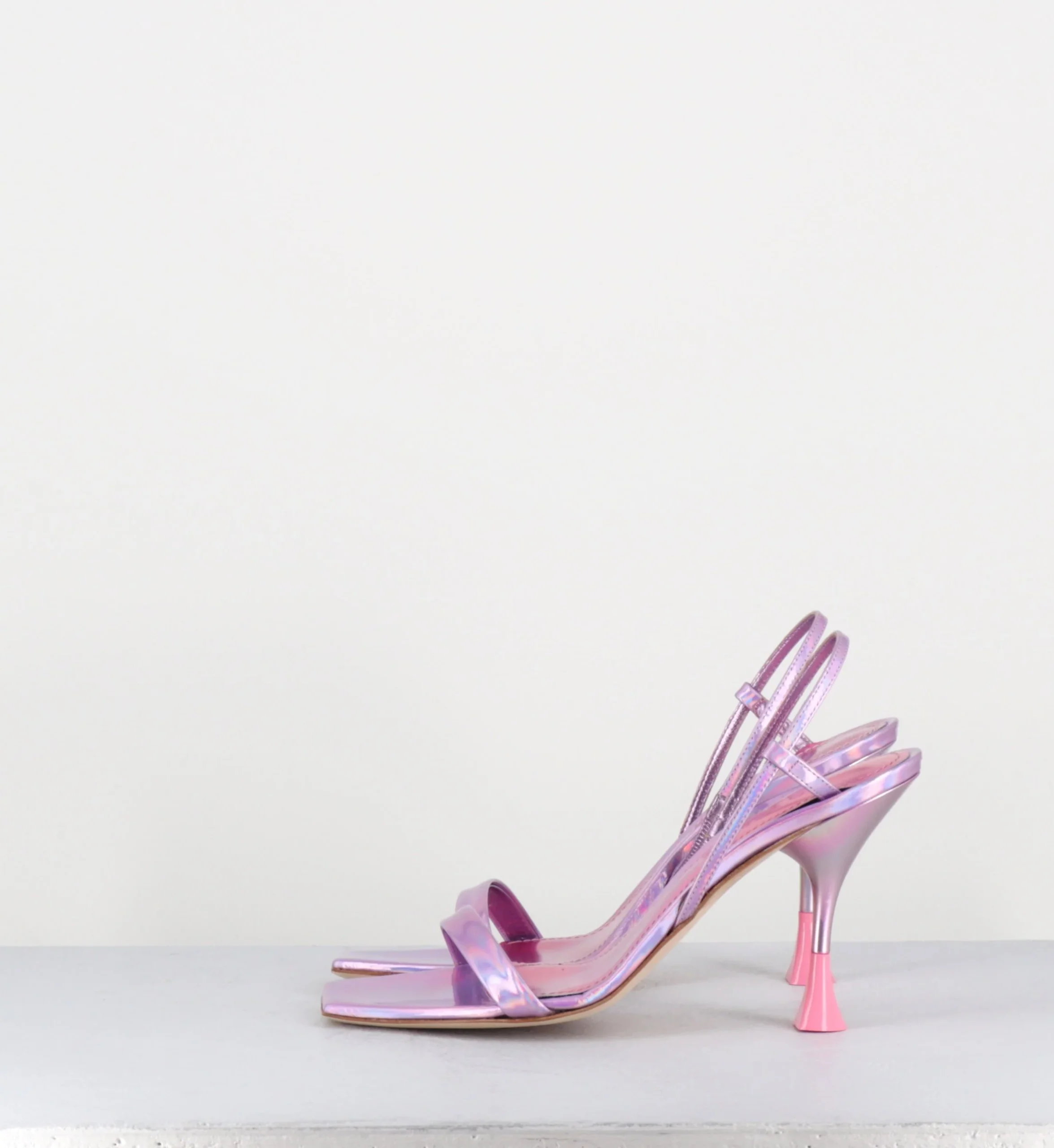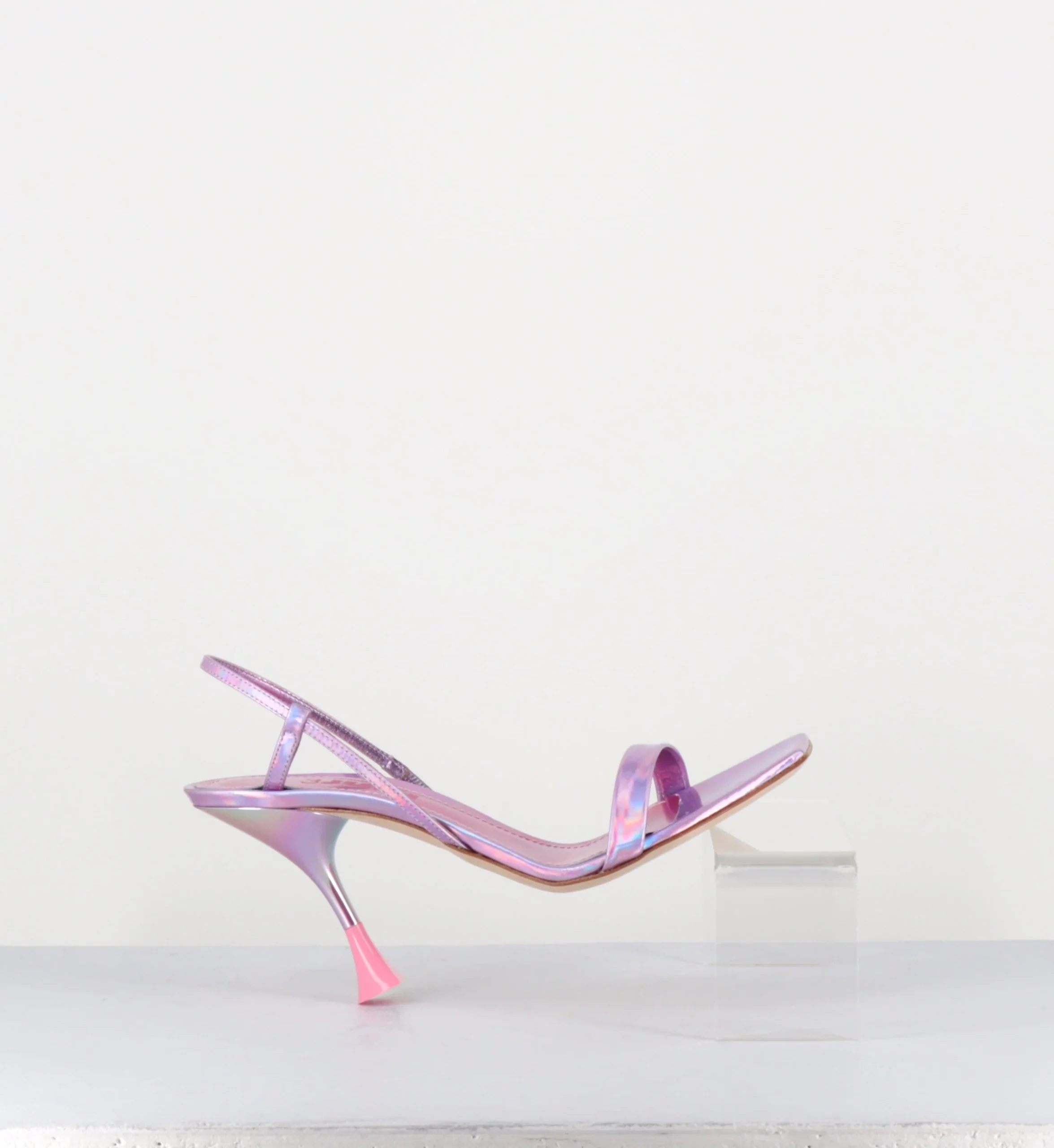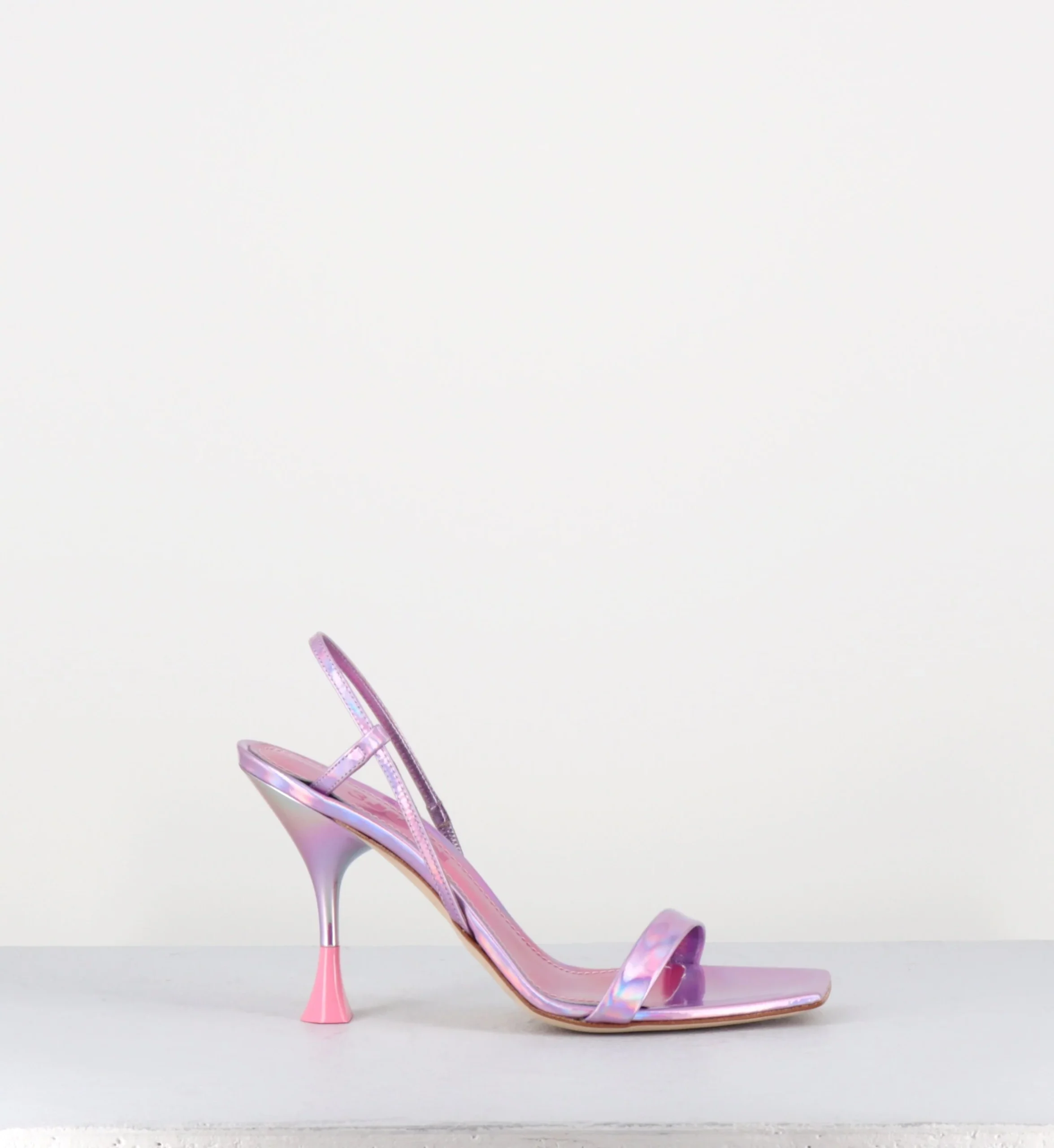 Sandales en cuir effet glacé/miroir rose iridescent, bout carré légèrement asymétrique, bride arrière slingback avec élastique intérieur pour plus d’aisance, montées sur un talon structurée avec détails PVC crême.