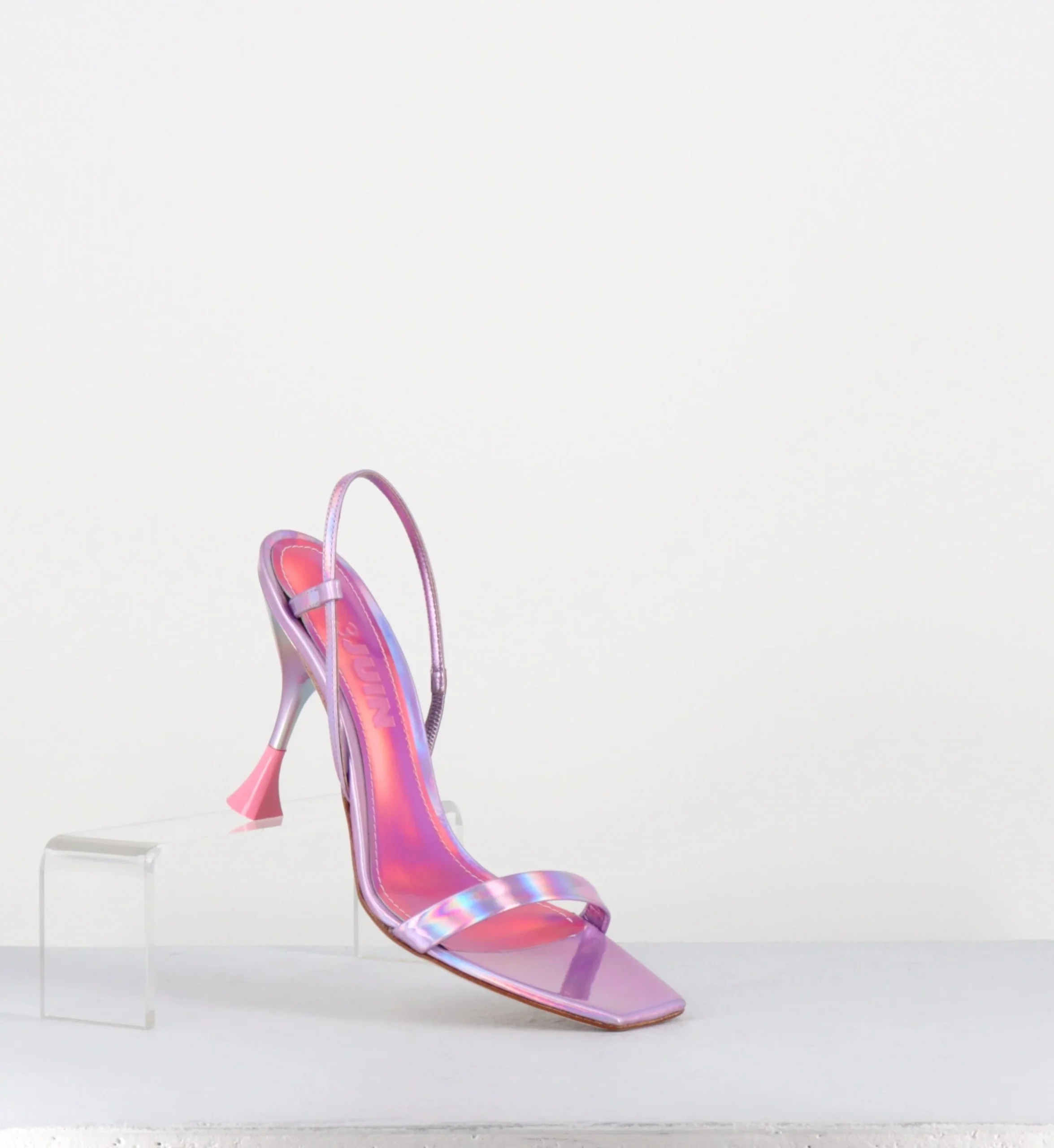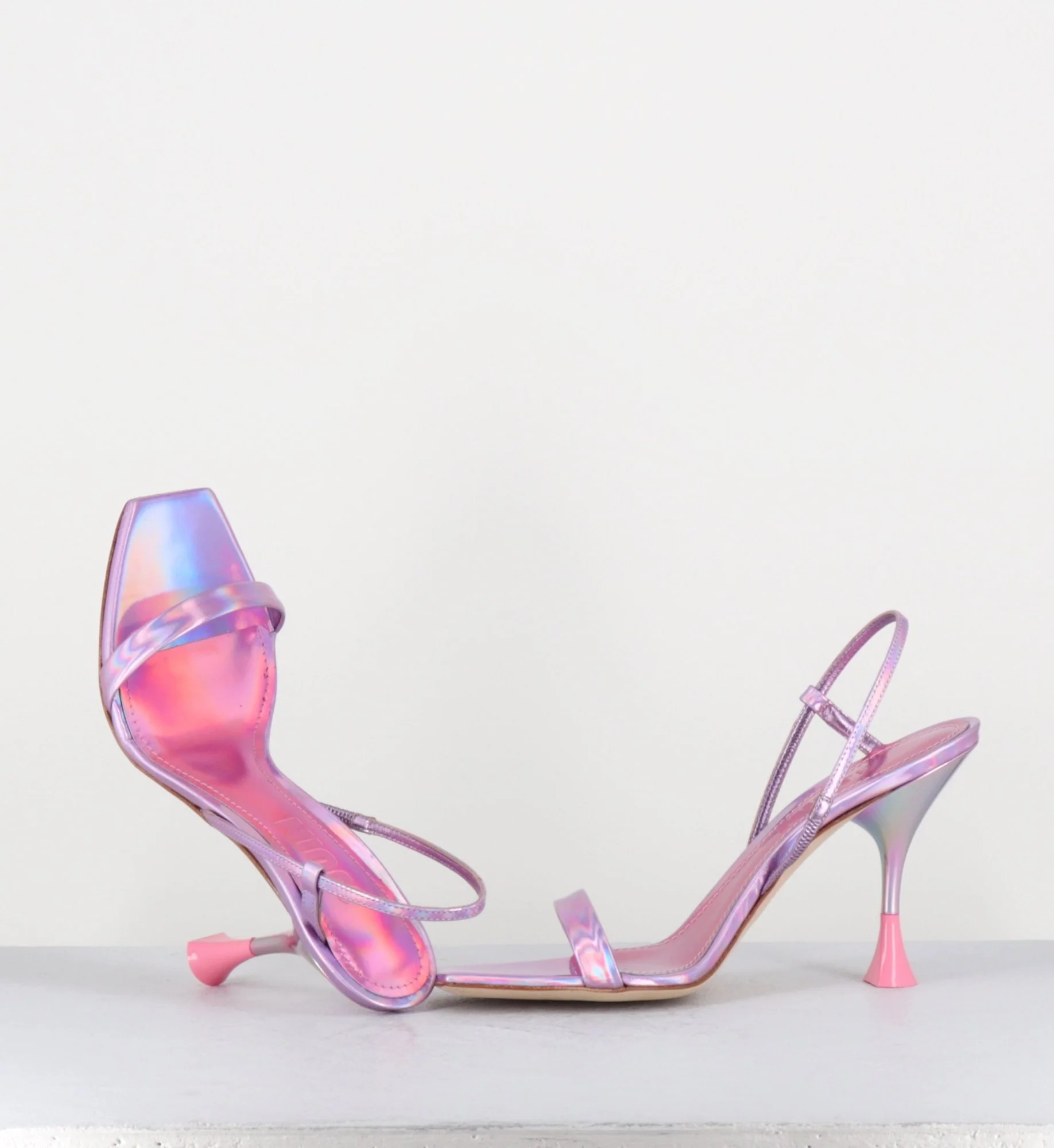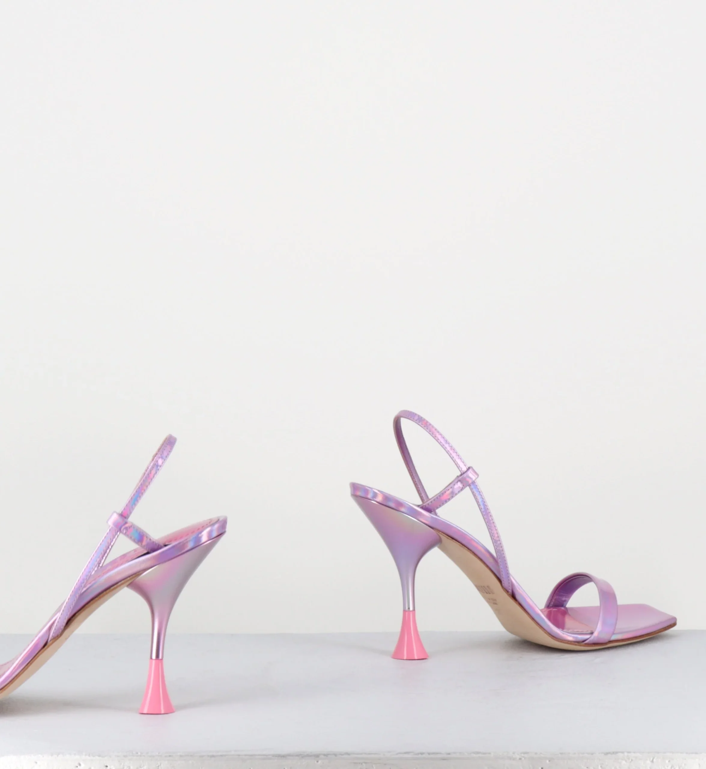 Sandales en cuir effet glacé/miroir rose iridescent, bout carré légèrement asymétrique, bride arrière slingback avec élastique intérieur pour plus d’aisance, montées sur un talon structurée avec détails PVC crême.