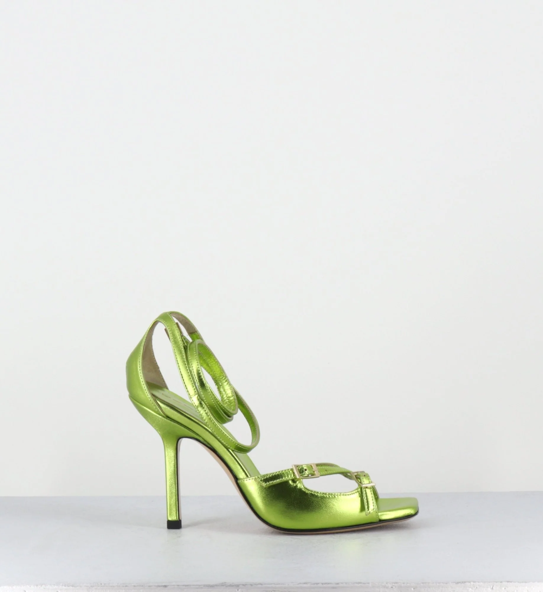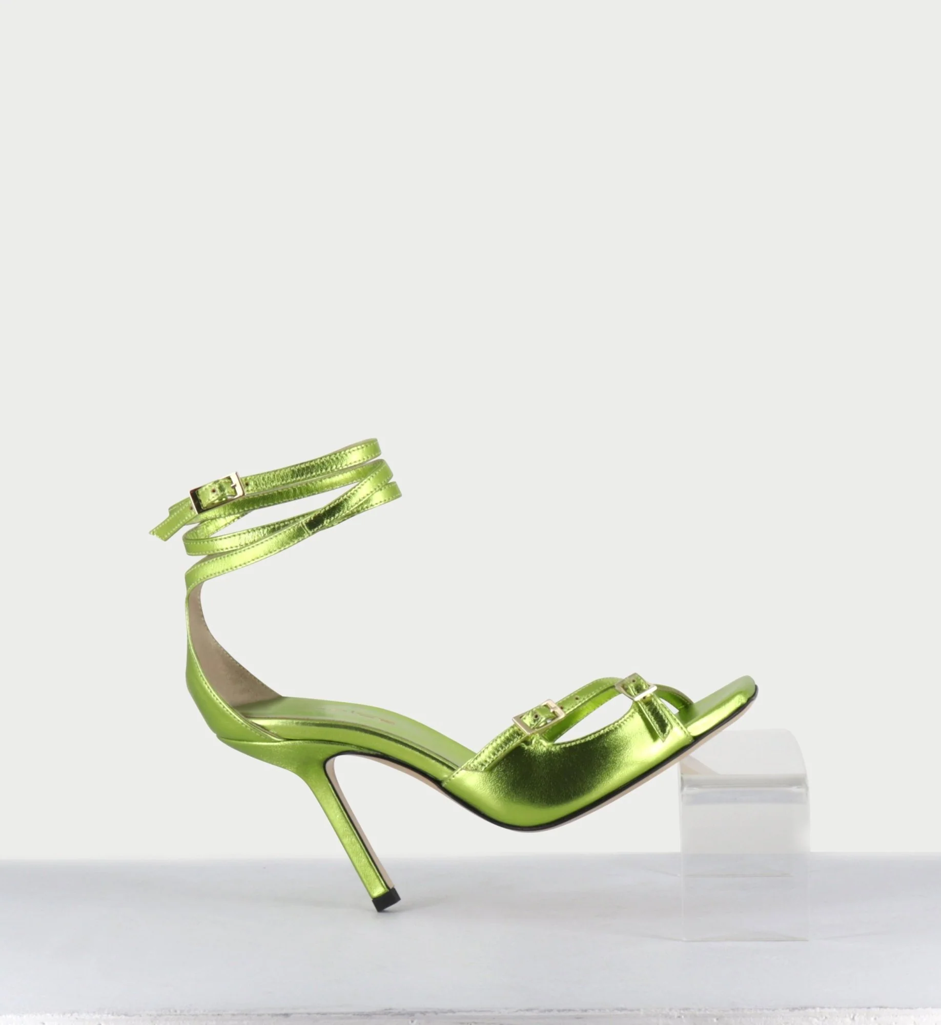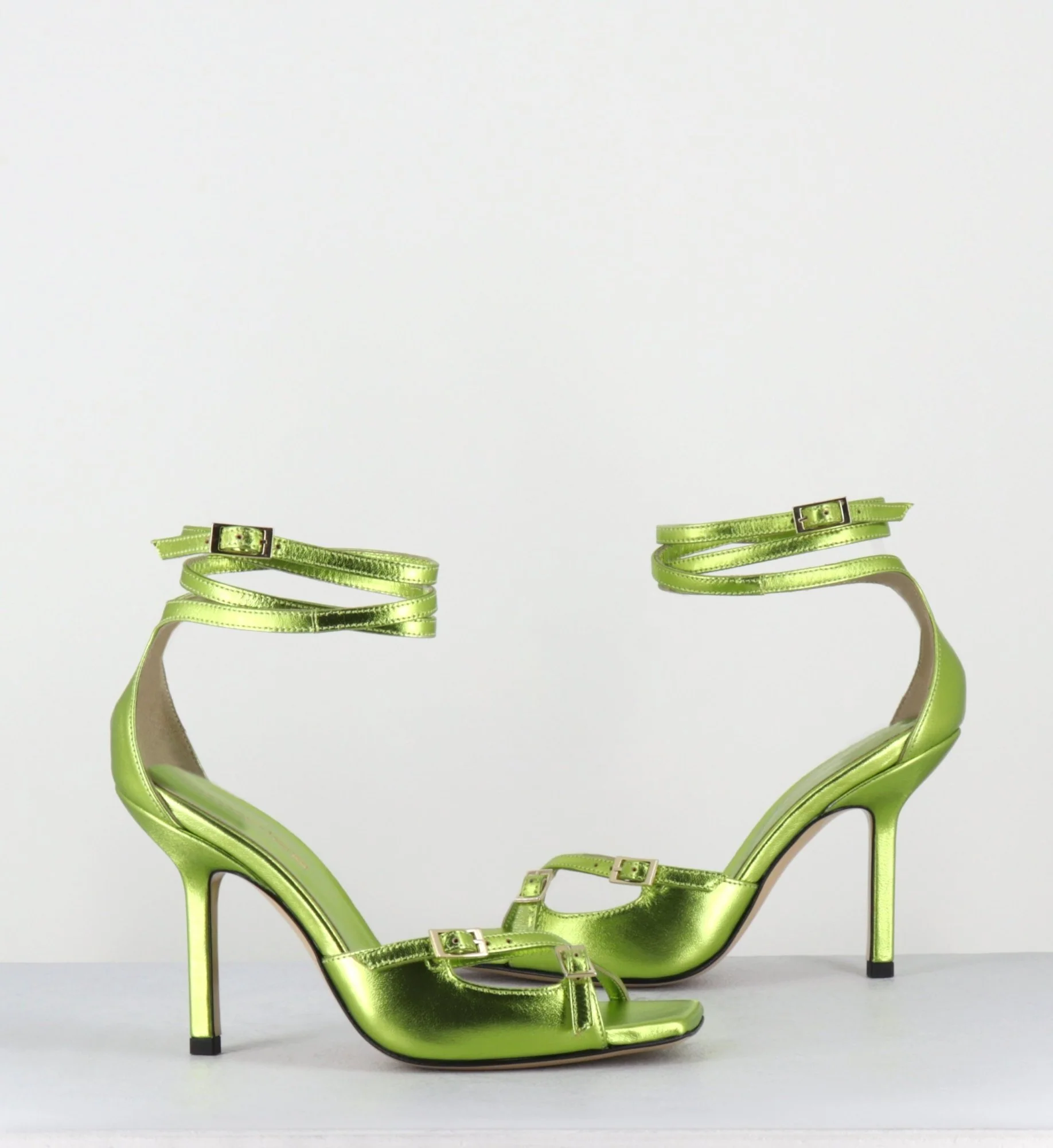 Sandales à haut talon en cuir métallisé vert, bout carré esprit années 90, multi-brides à petites boucles réglables, montées sur un talon stylisé Fabrication Artisanale Italienne – Ateliers GarriceLab Chausse normalement – voire légèrement petit