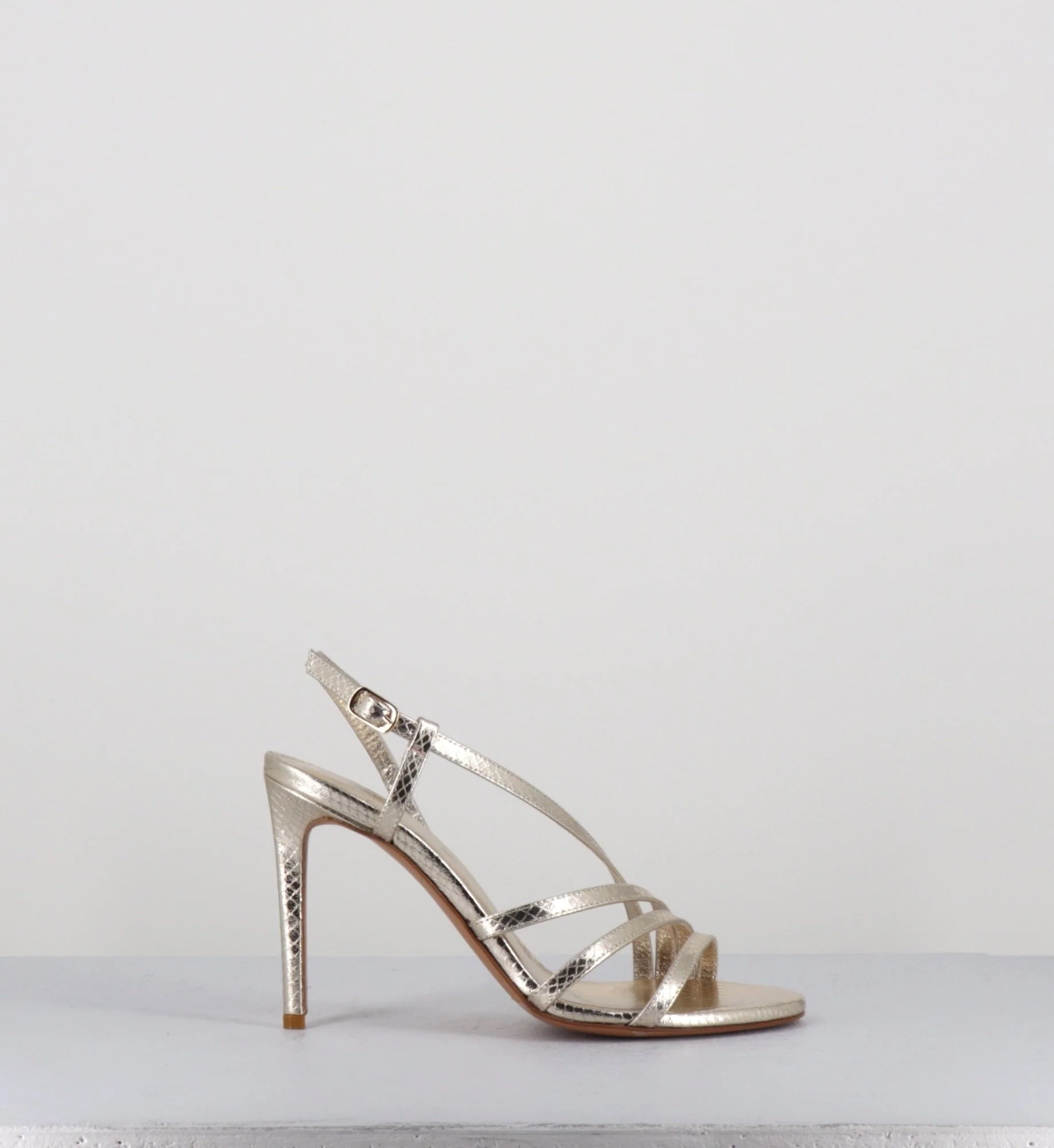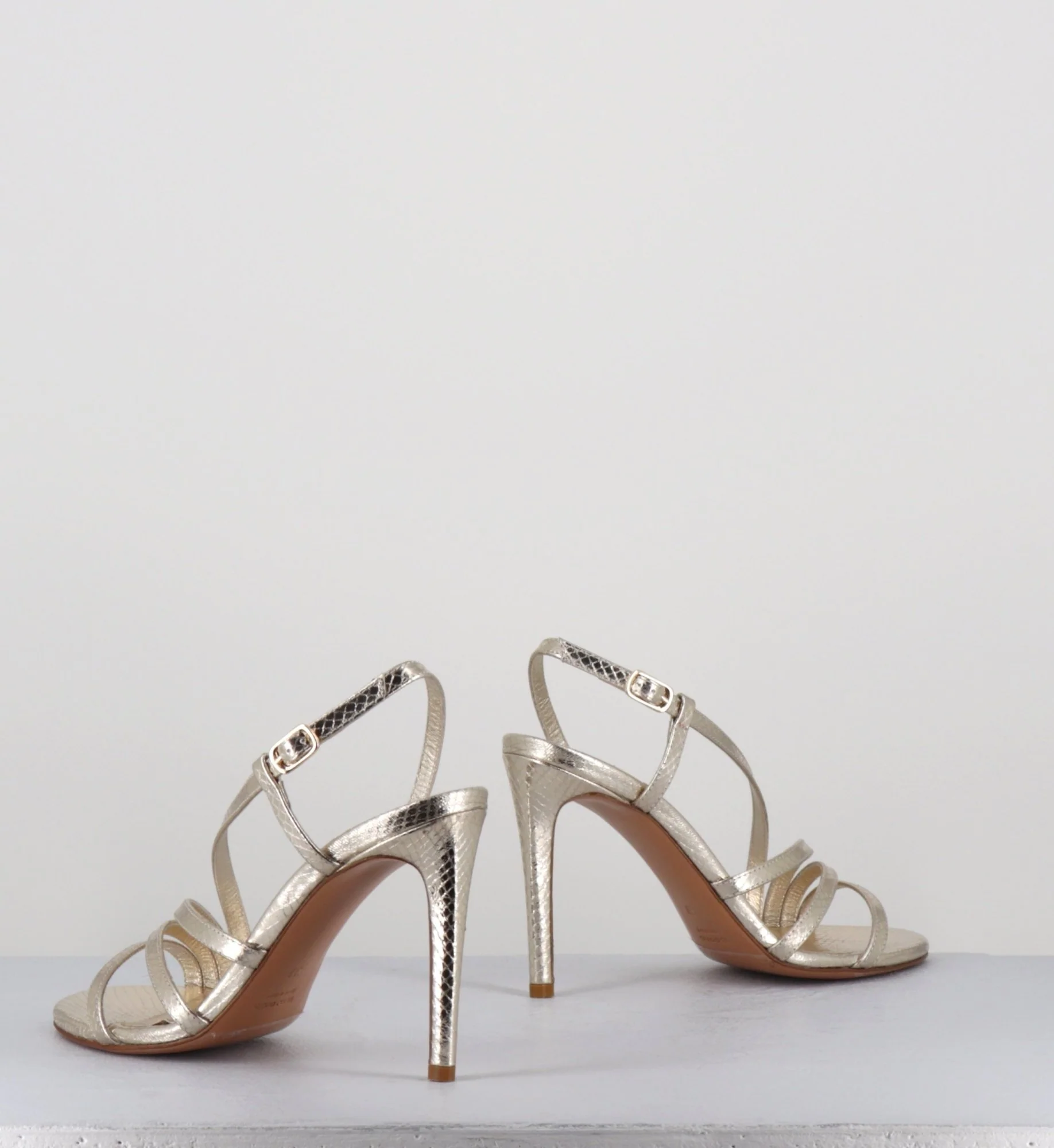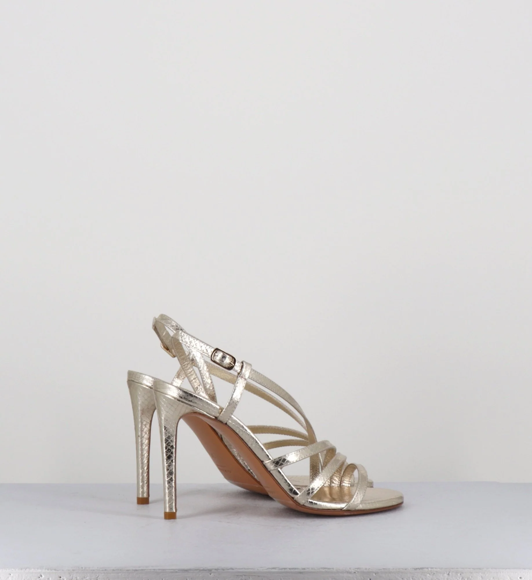 Sandales en cuir imprimé serpent métallisé doré, bout arrondi, élégant design multi-brides, avec petite boucle réglable à à l’arrière, montées sur un haut talon fin Fabrication Artisanale Italienne – Ateliers GarriceLab Chausse légèrement grand