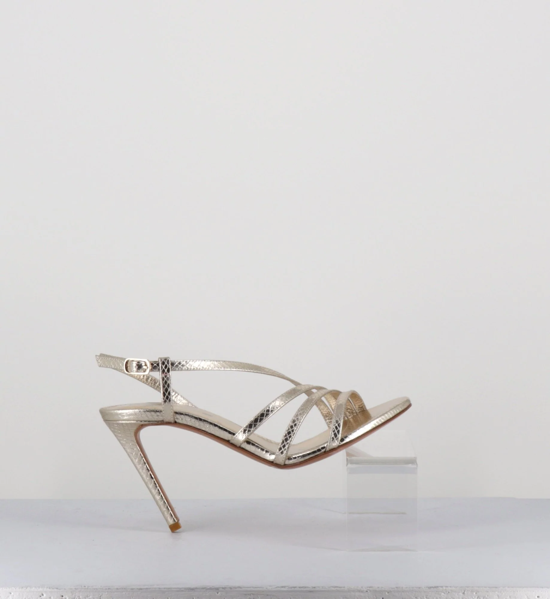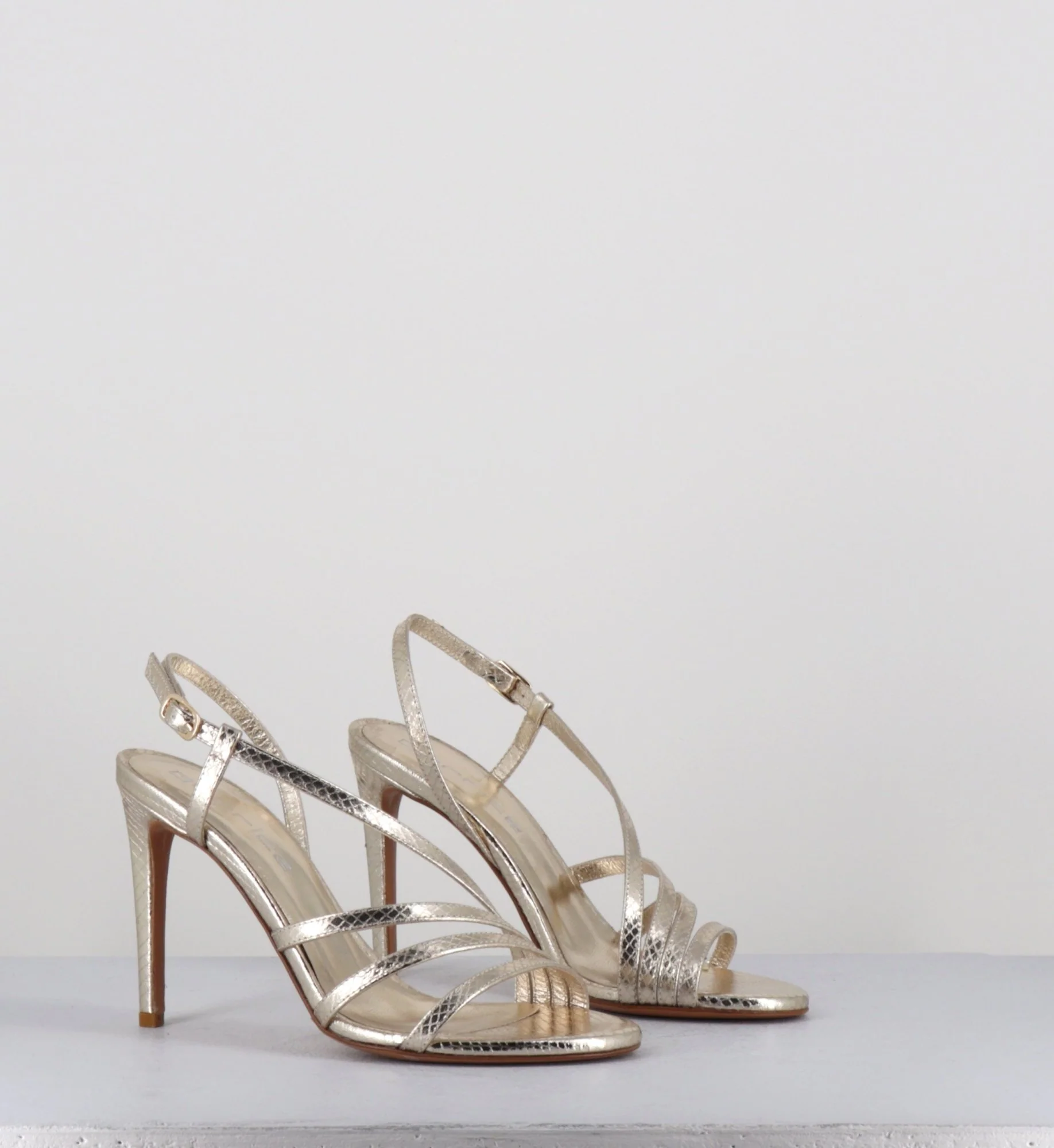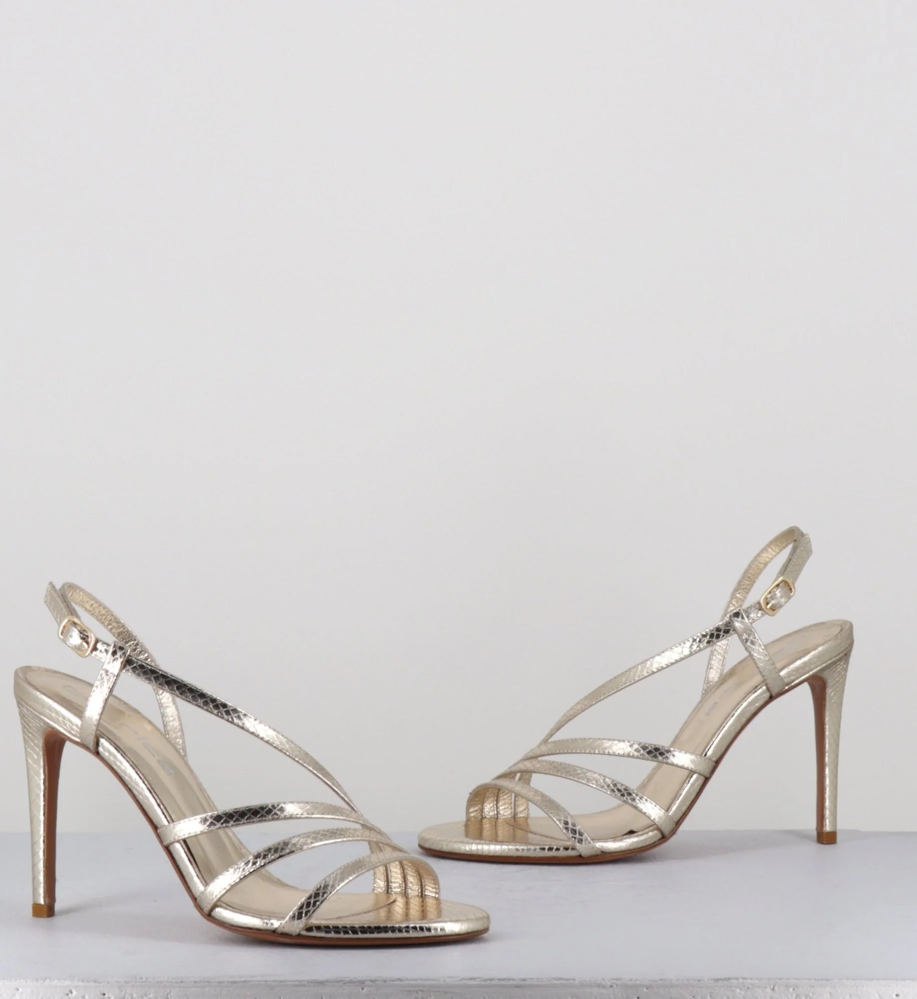 Sandales en cuir imprimé serpent métallisé doré, bout arrondi, élégant design multi-brides, avec petite boucle réglable à à l’arrière, montées sur un haut talon fin Fabrication Artisanale Italienne – Ateliers GarriceLab Chausse légèrement grand