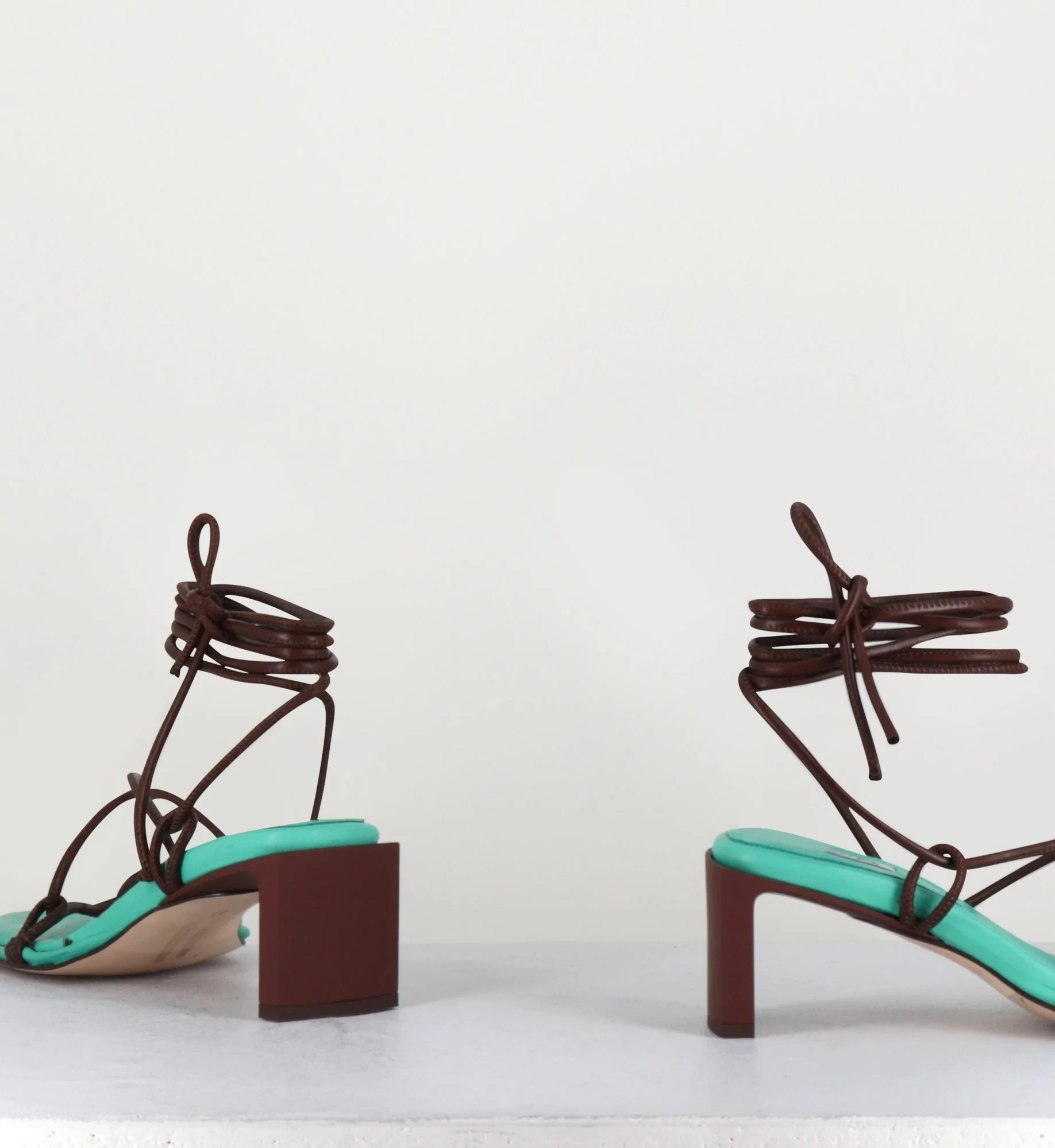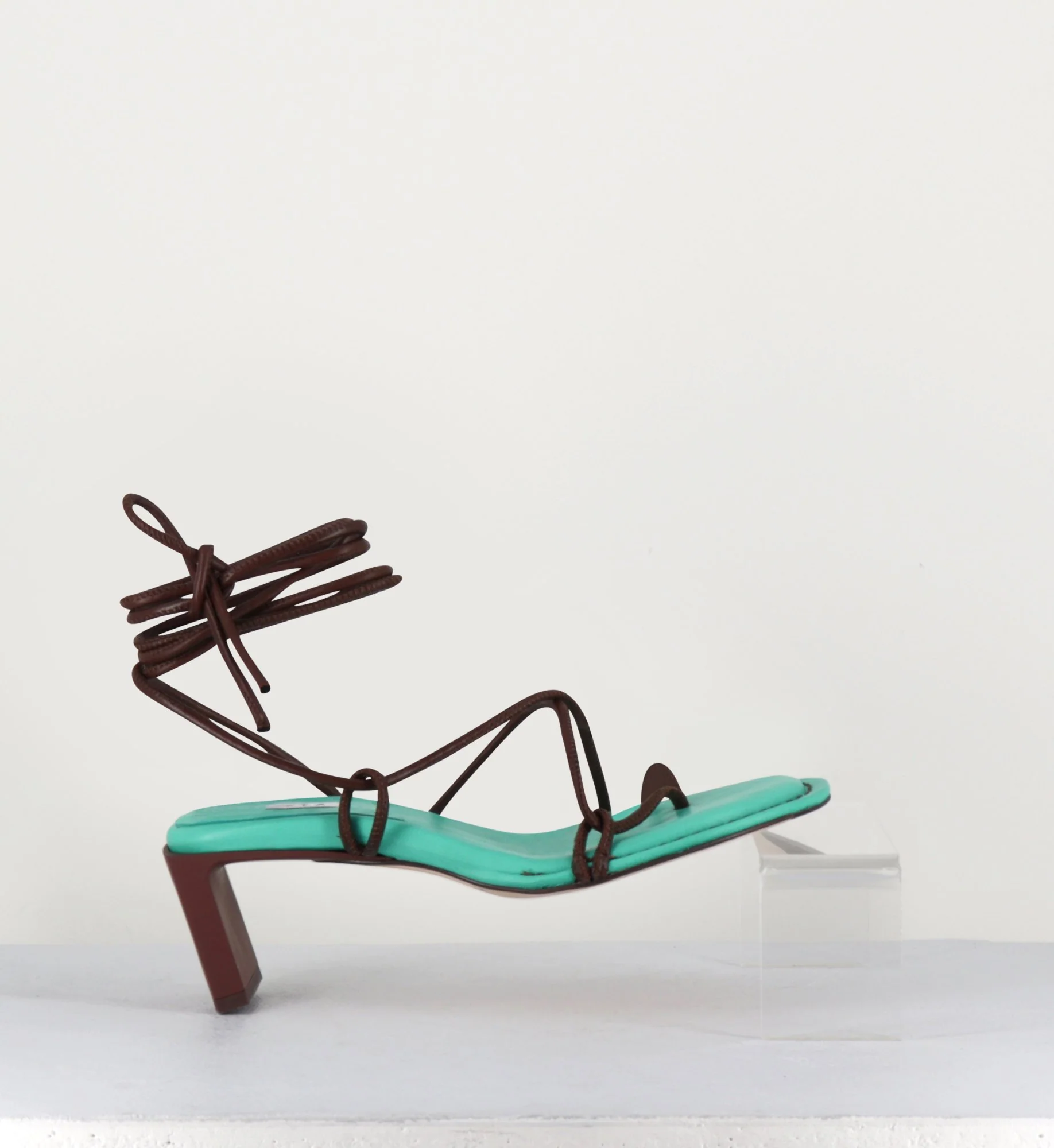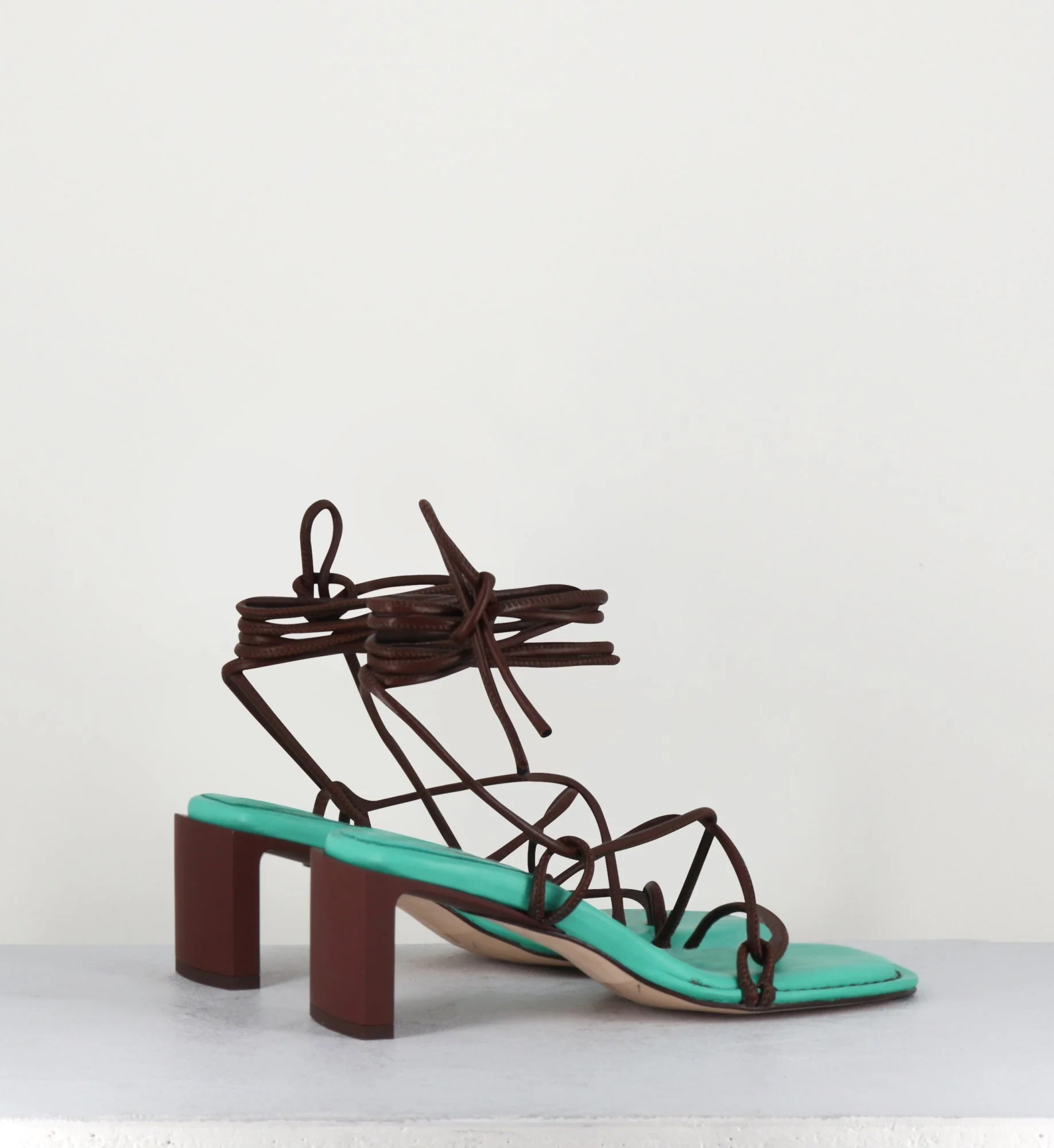Sandales vertes à fines lanières de cuir marron lacées entre les orteils et sur le pied se nouant sur plusieurs tours à la cheville pour un ajustemant optimal, semelle intérieure rn cuir à mousse mémoire de forme cousue à la main, monté sur un talon caoutchouté droit et une semelle en cuir injecté de gomme pour plus d’adhérence.