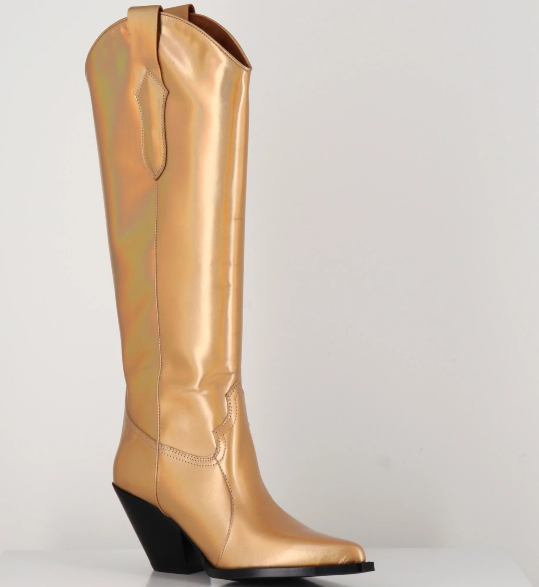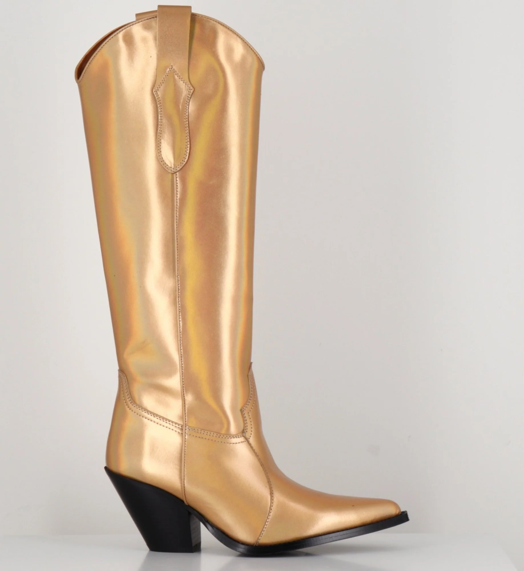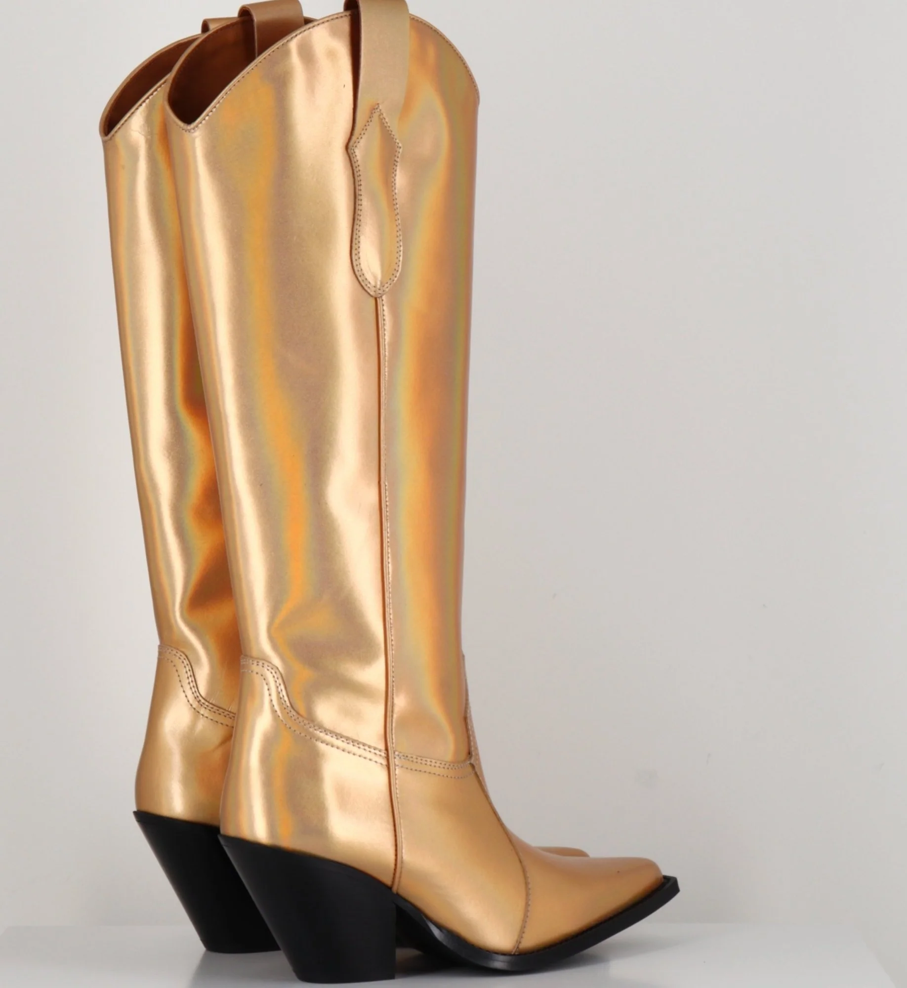 Bottes Santiags tige haute en cuir légèrement glacé couleur or irisé, bout pointu avec petite pointe carré, montées sur un talon biseauté noir.