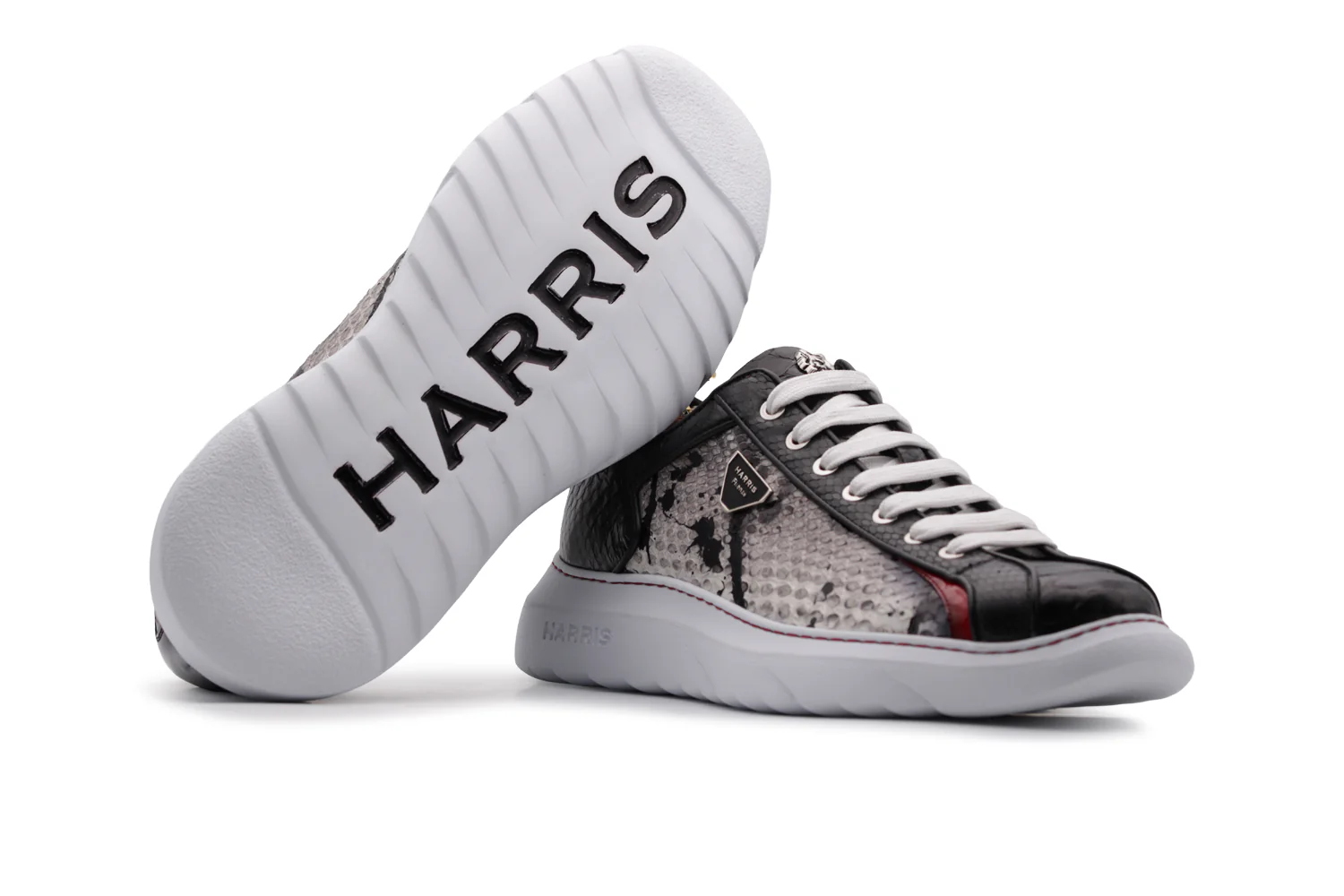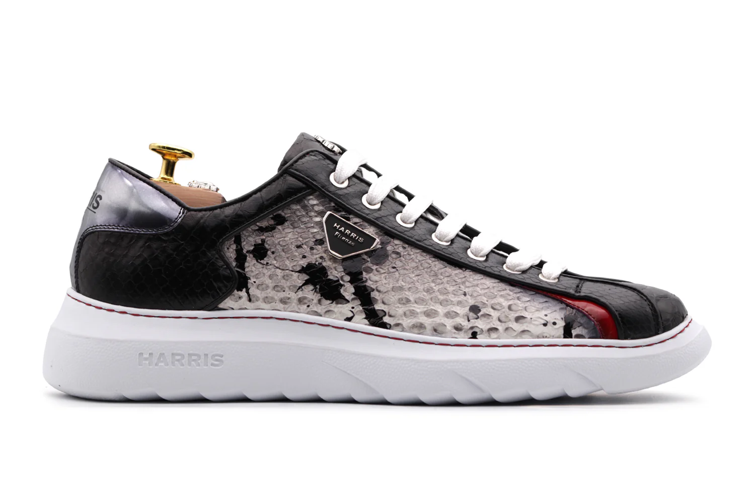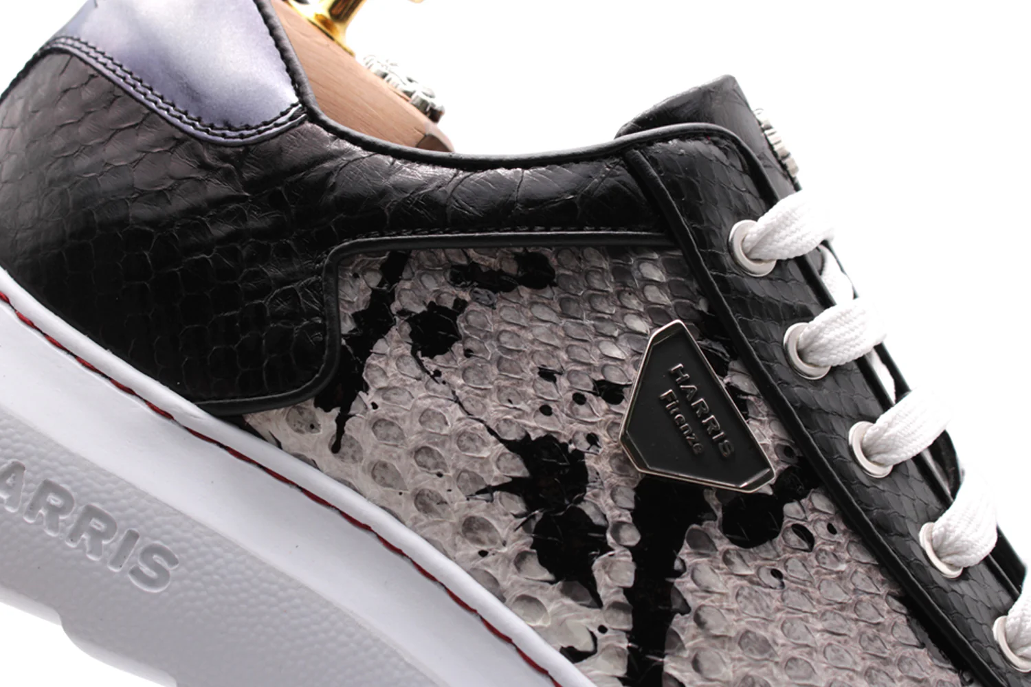 Cette sneaker Harris est en cuir rock python avec des détails peintes à la main en noir, combinés à des inserts de python noir pour un effet décisif et sophistiqué. Les contrastes de cuir à brossage en argent ajoutent de la luminosité et du caractère à la tige. Pour compléter le design, la semelle en caoutchouc de cassette d’innovation, qui garantit un confort et un style contemporains et des accessoires Harris à Nichel Finish qui donnent l’exclusivité.
