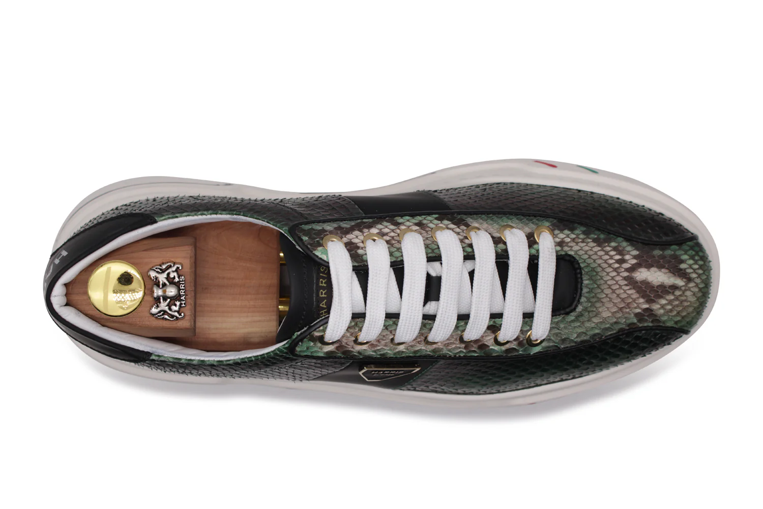 Réalisée en cuir de python fin dans des tons de vert et de noir, cette sneaker est agrémentée d’accessoires aux finitions dorées qui embellissent le design. Pour compléter le modèle, la semelle cassette Innovazione qui assure confort et stabilité, valorisant un style qui allie luxe, savoir-faire et style moderne.