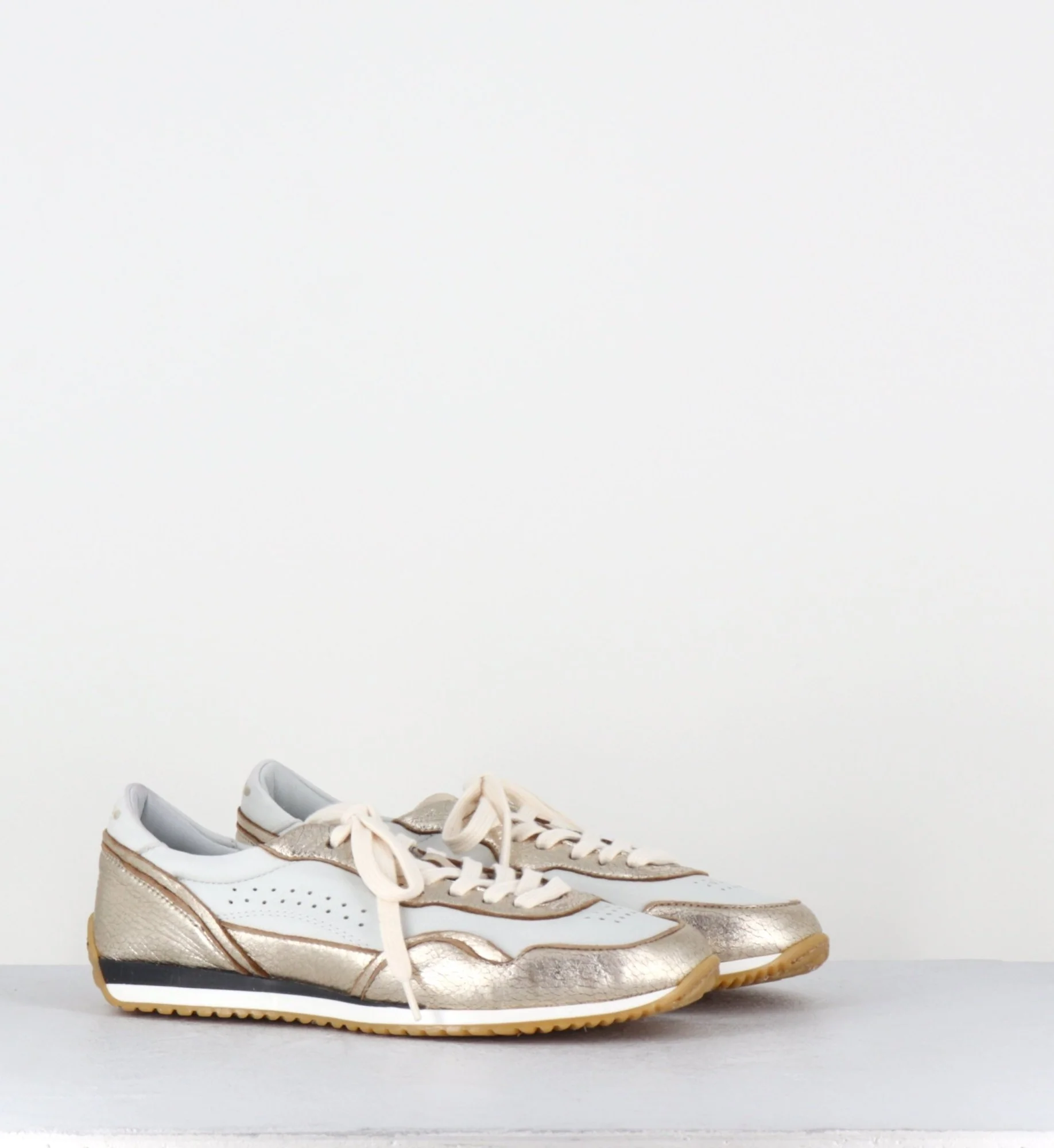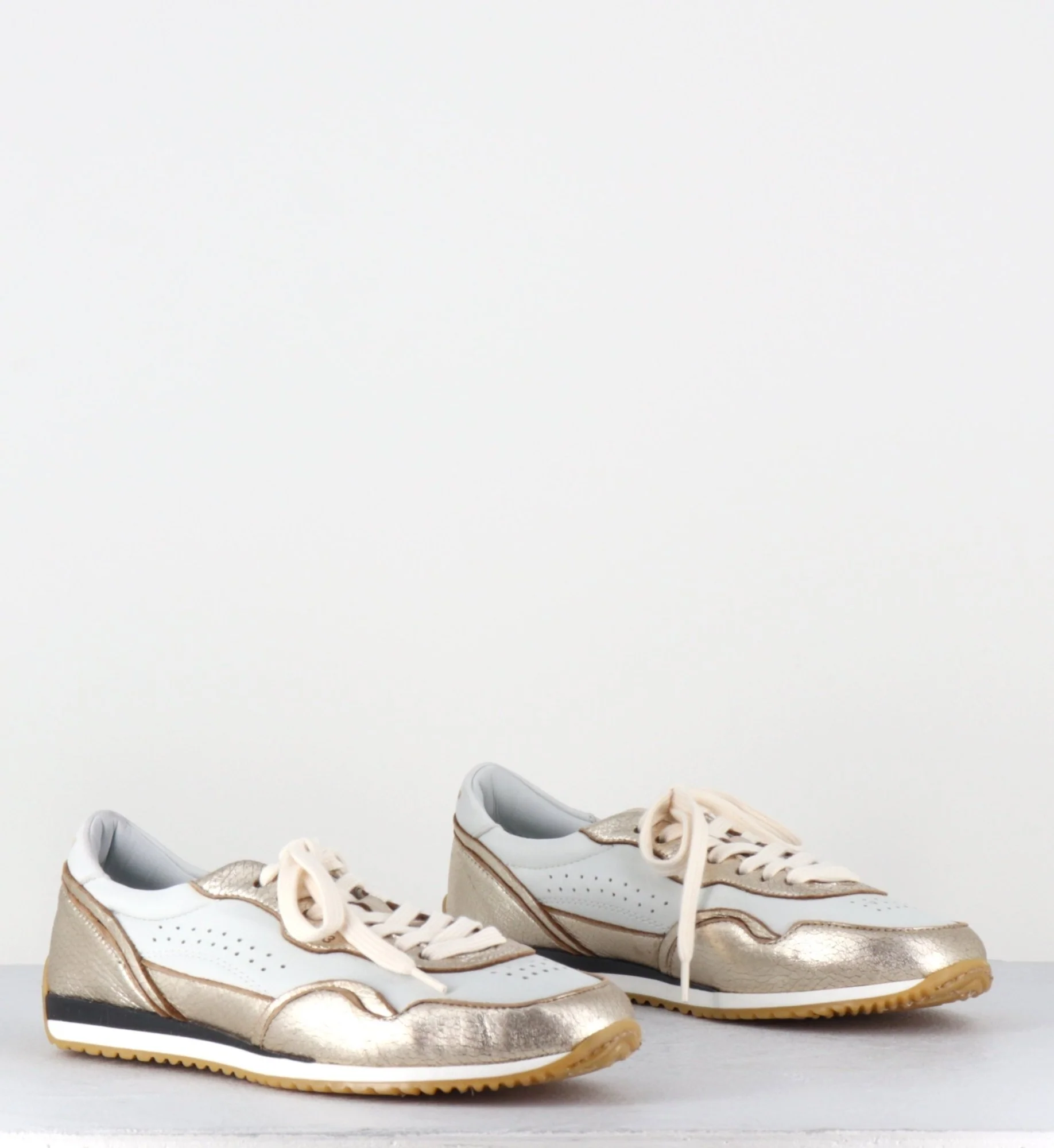Sneakers légères en cuir blanc & métallisé doré, construction extrêmement souple cousue main et semelle en gomme légère