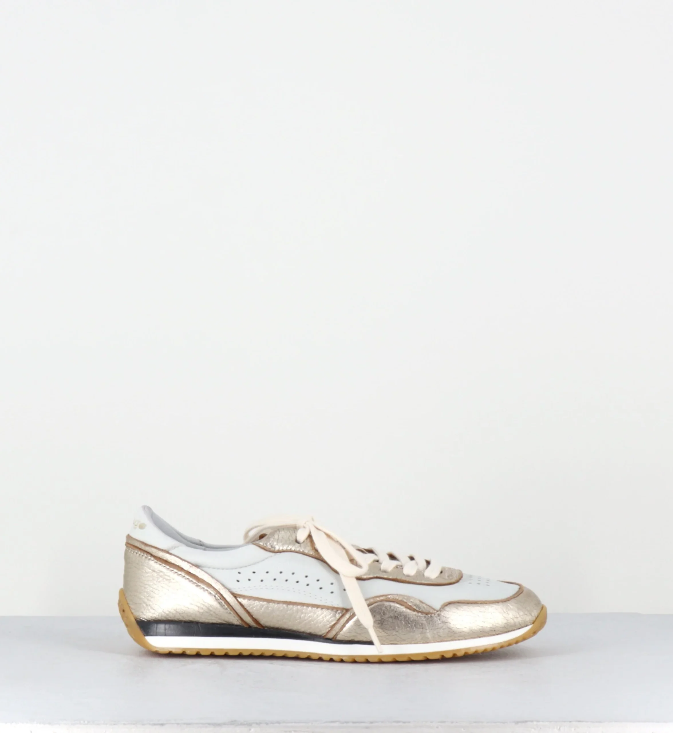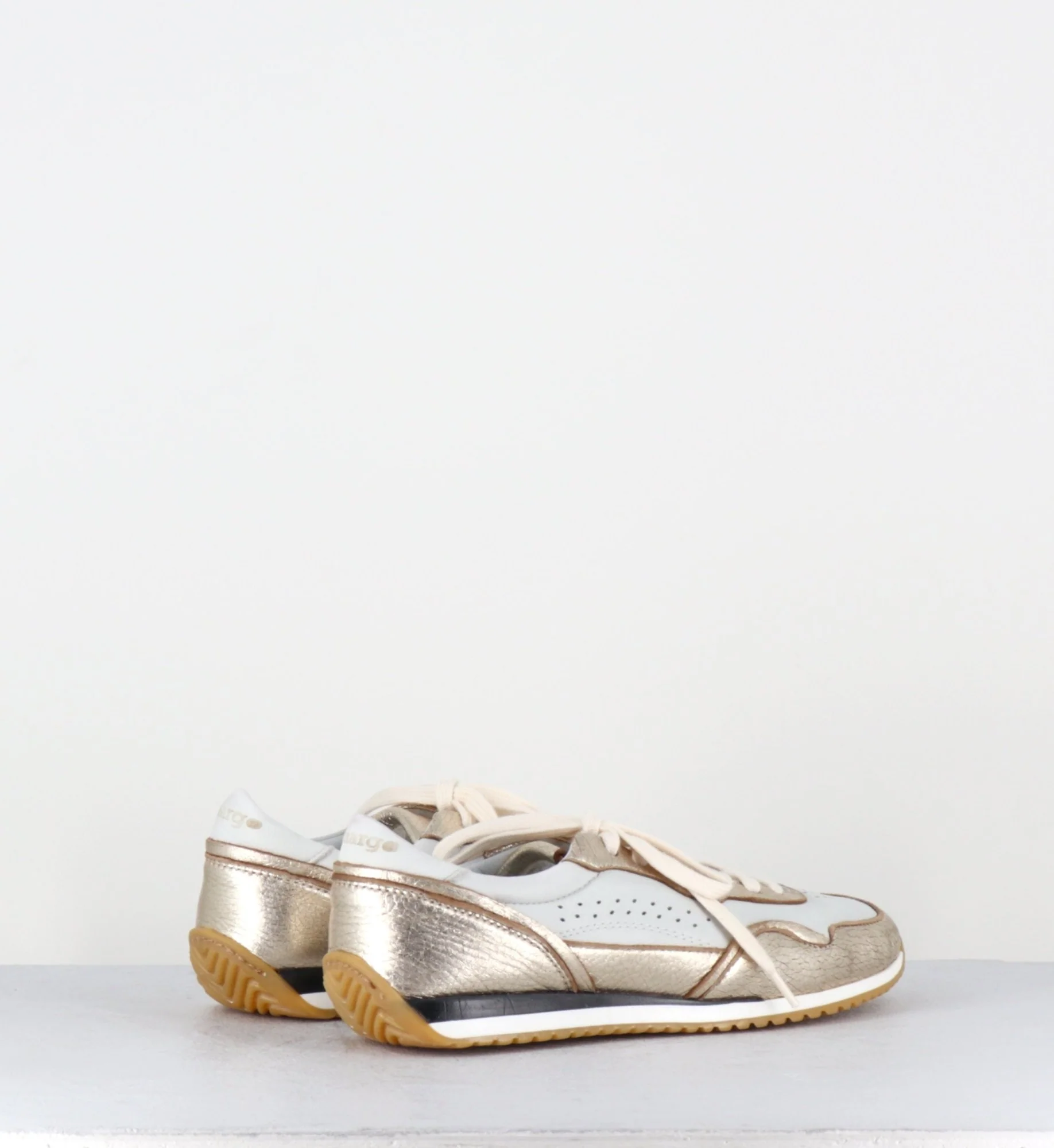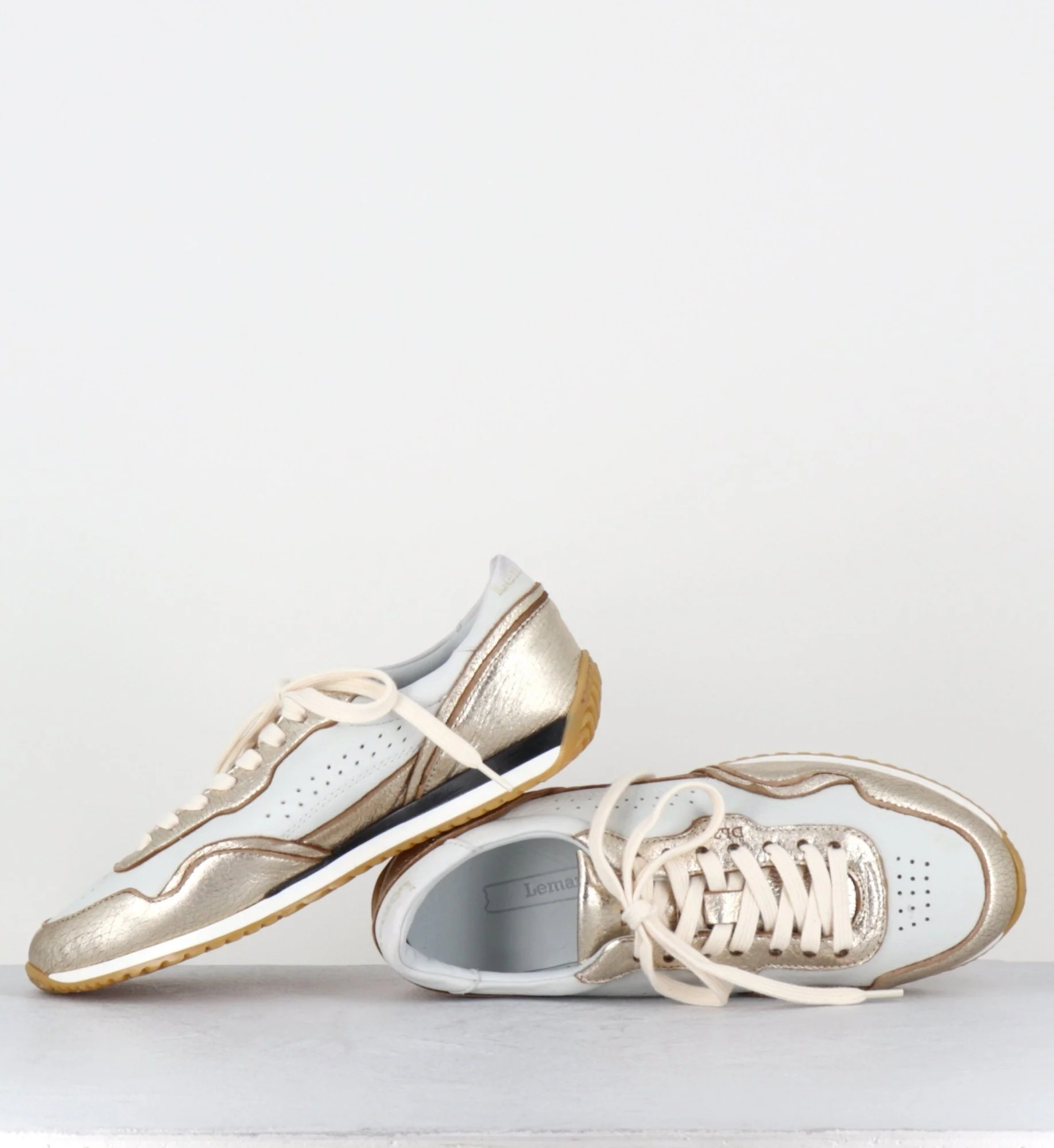 Sneakers légères en cuir blanc & métallisé doré, construction extrêmement souple cousue main et semelle en gomme légère Fabrication Artisanale Italienne – Ateliers Lemargo