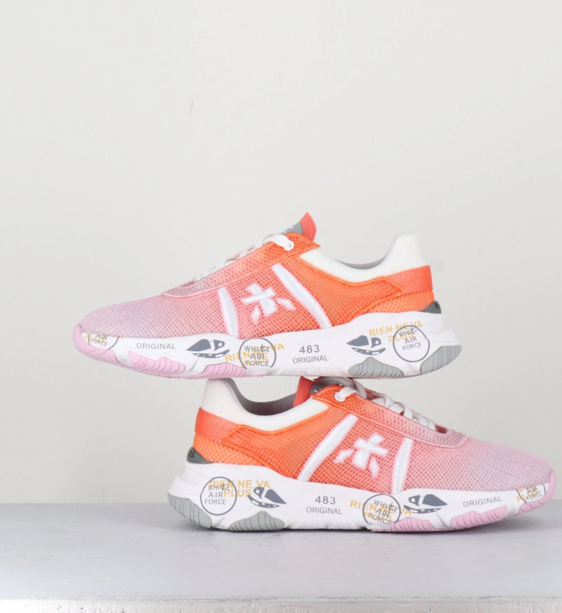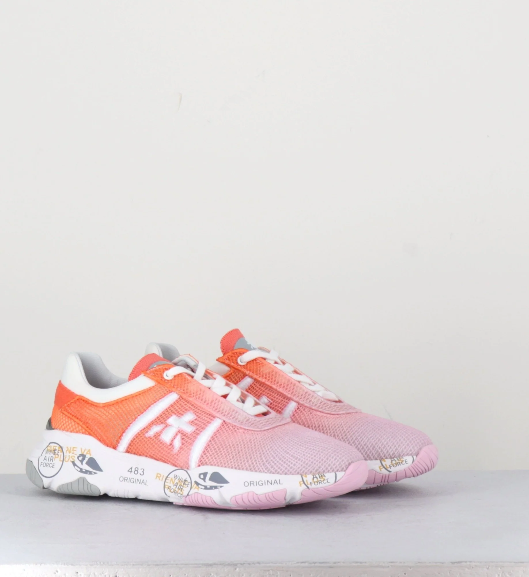 Sneakers légères dégradé du rose clair au orange réalisé en broderie tridimensionnel en nylon des designers Italiens Premiata. Montée sur une semelle légère, imprimée.