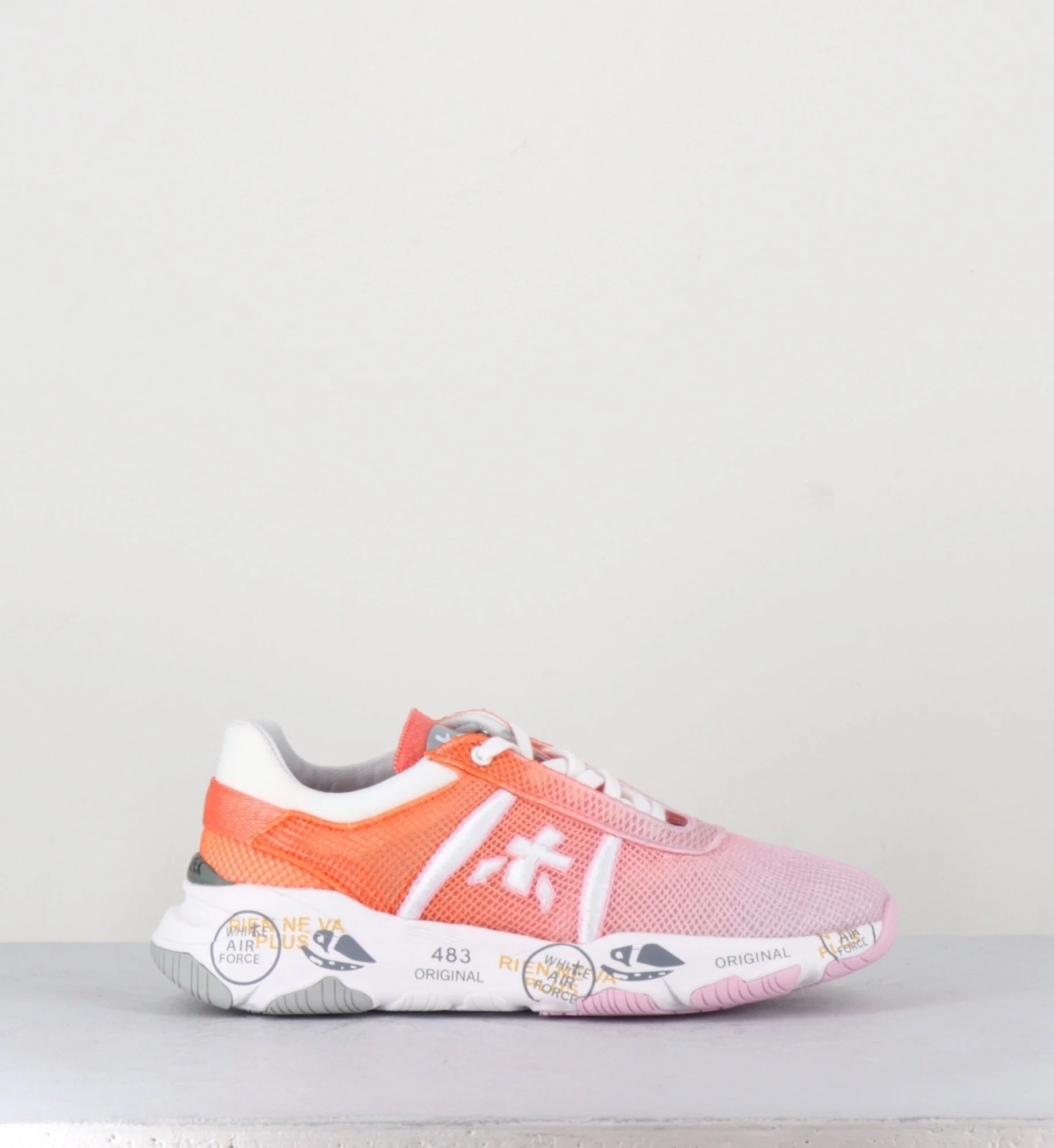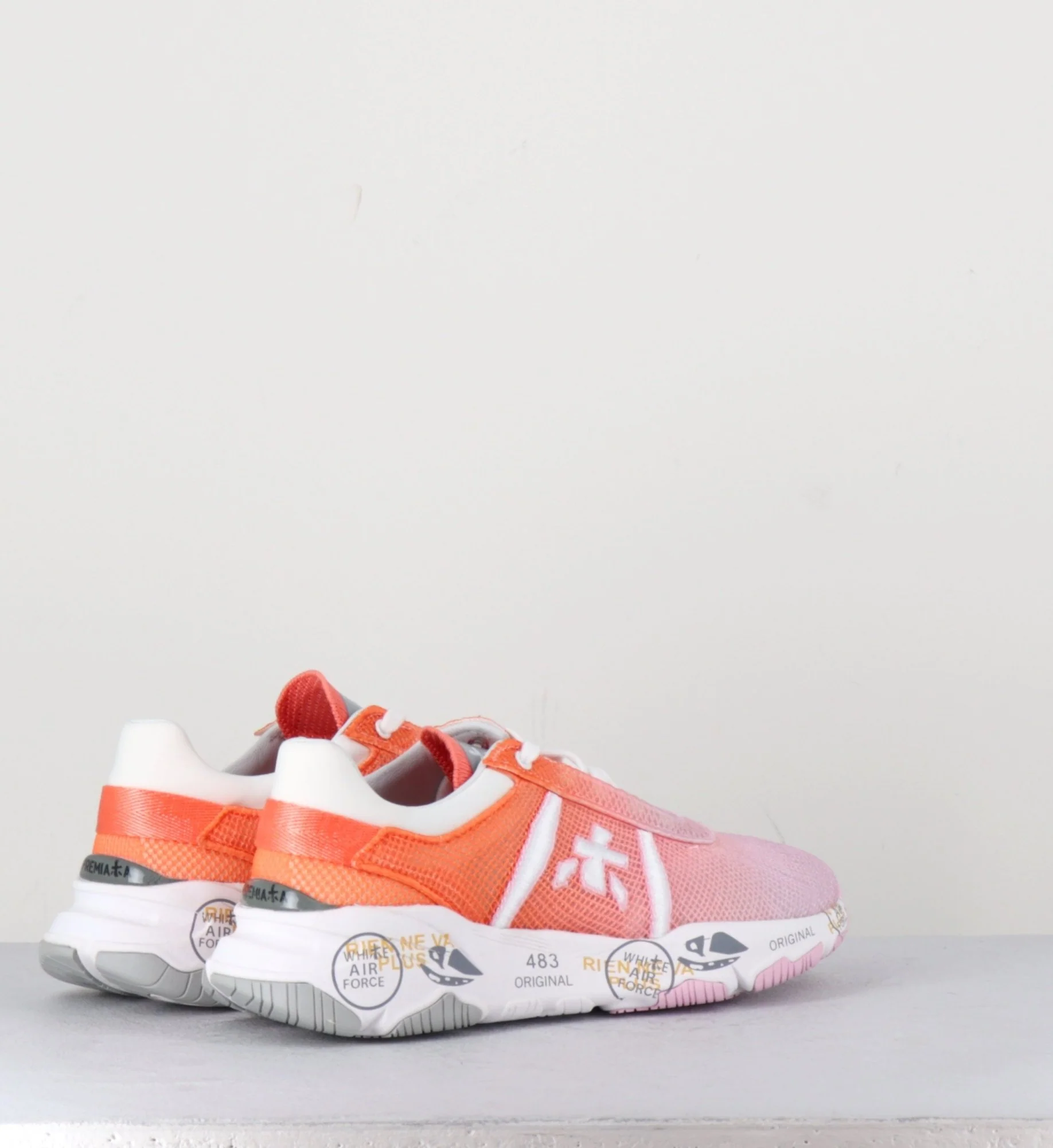 Sneakers légères dégradé du rose clair au orange réalisé en broderie tridimensionnel en nylon des designers Italiens Premiata. Montée sur une semelle légère, imprimée. Chausse normalement.