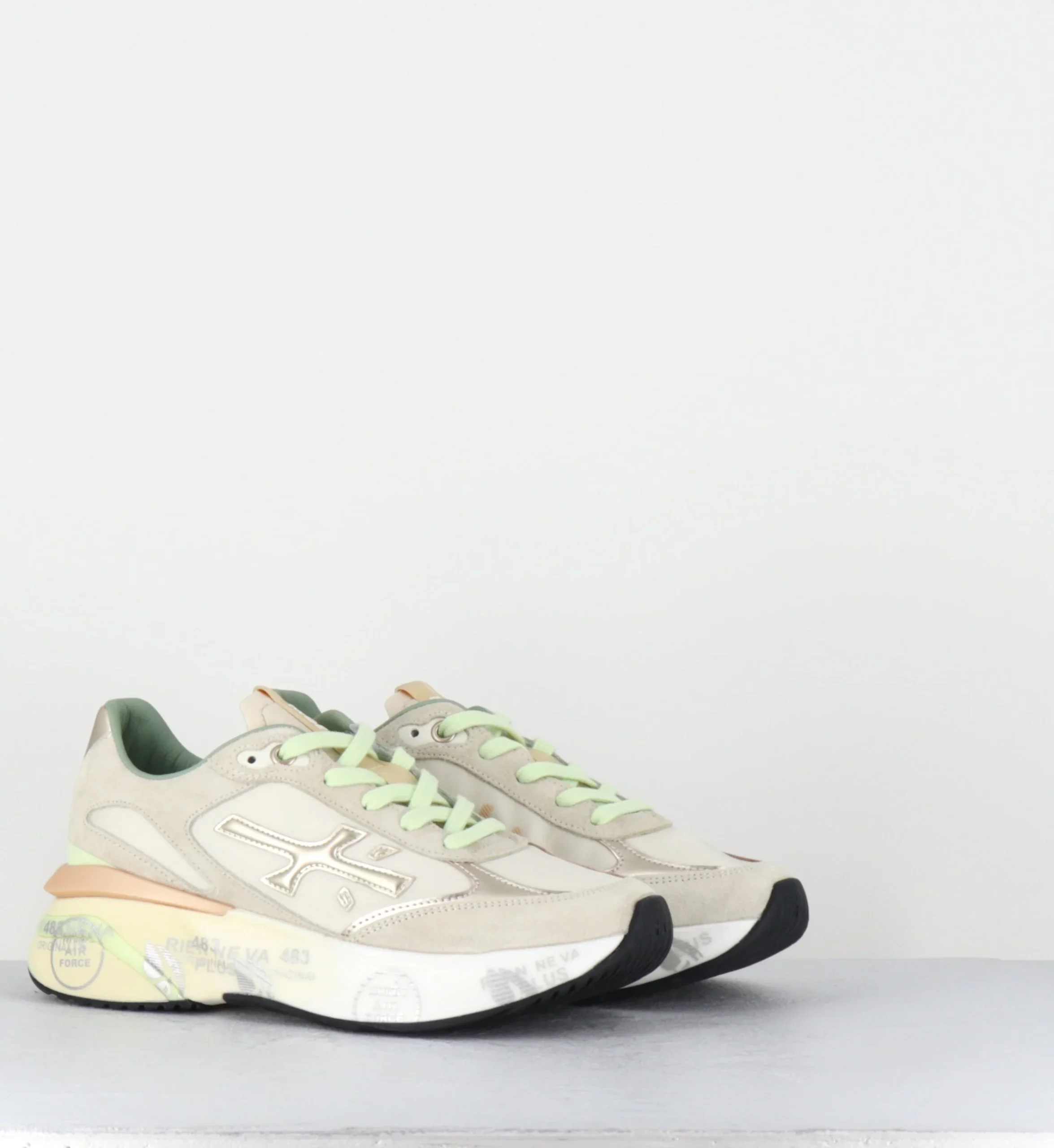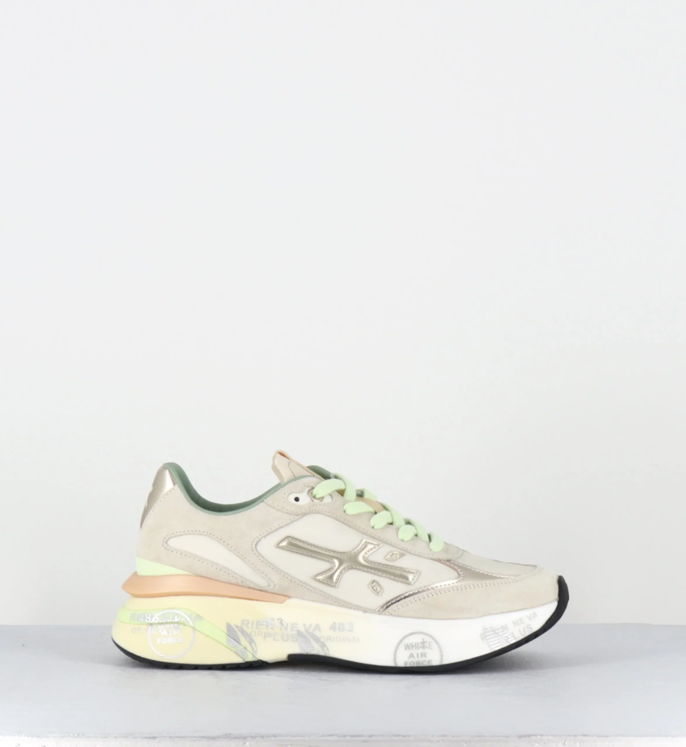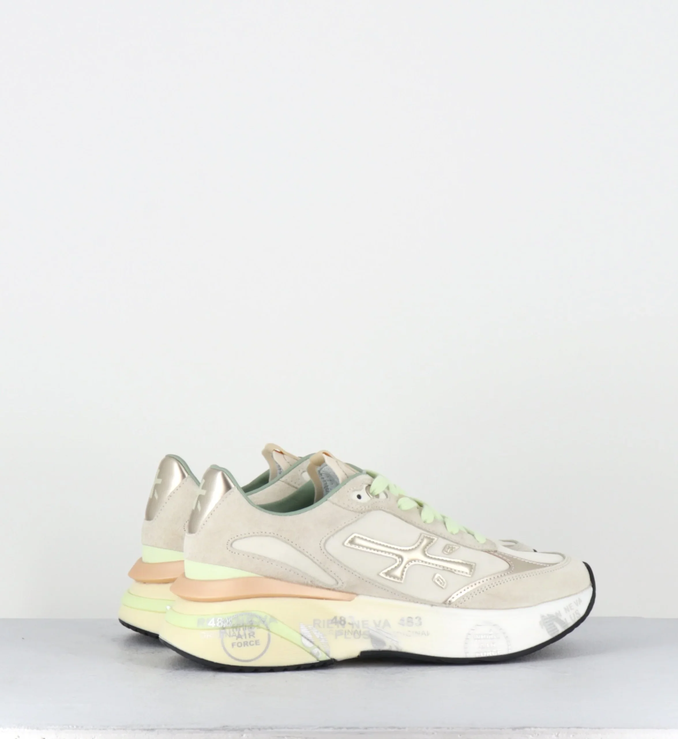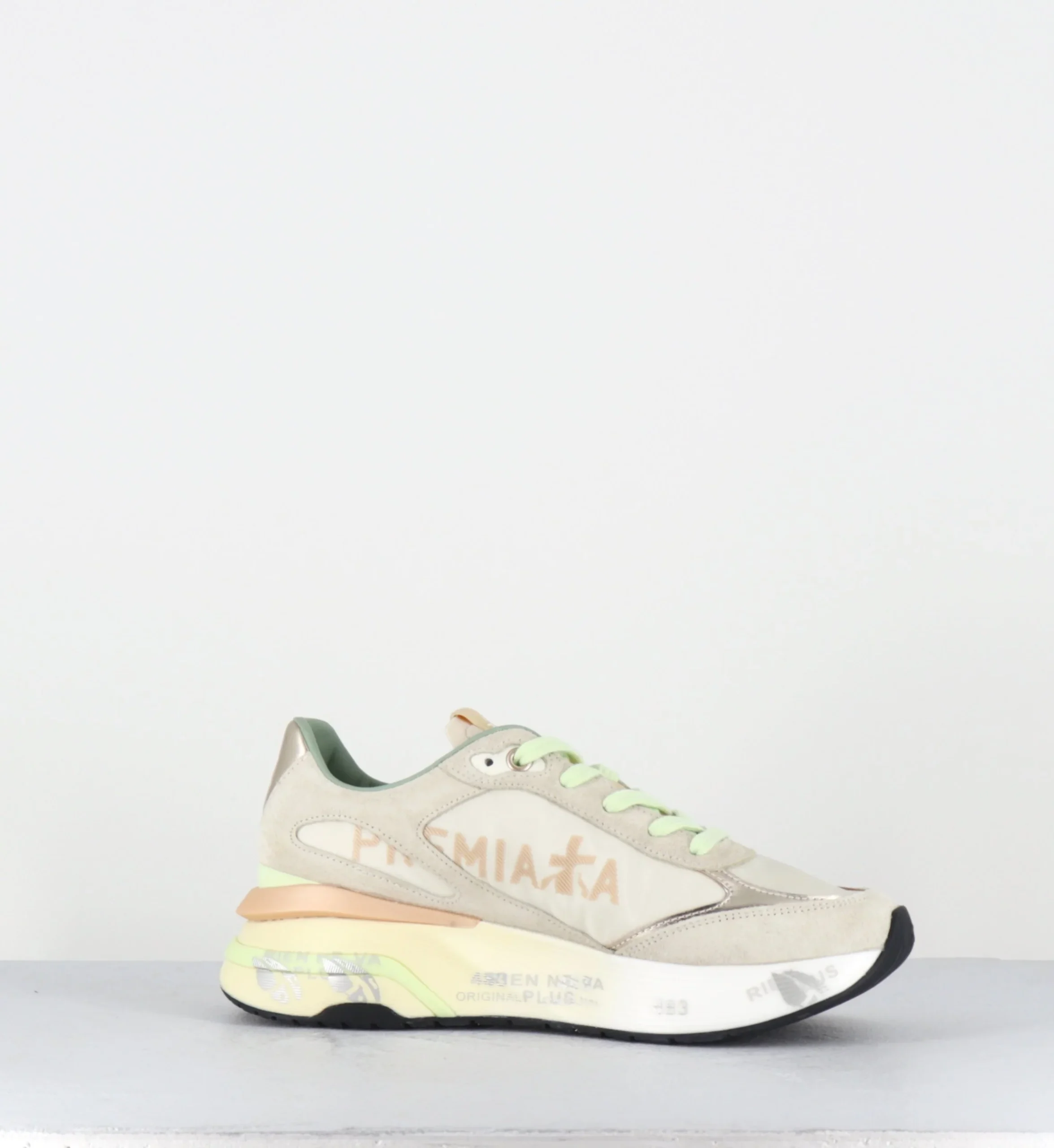 The Moerun is based on the lightness of movement, stability and cushioning sensation provided by the innovation of the bottom. The new silhouette is rich in details: logo on the outer side, PREMIATA lettering on the inner side and model name on the label.