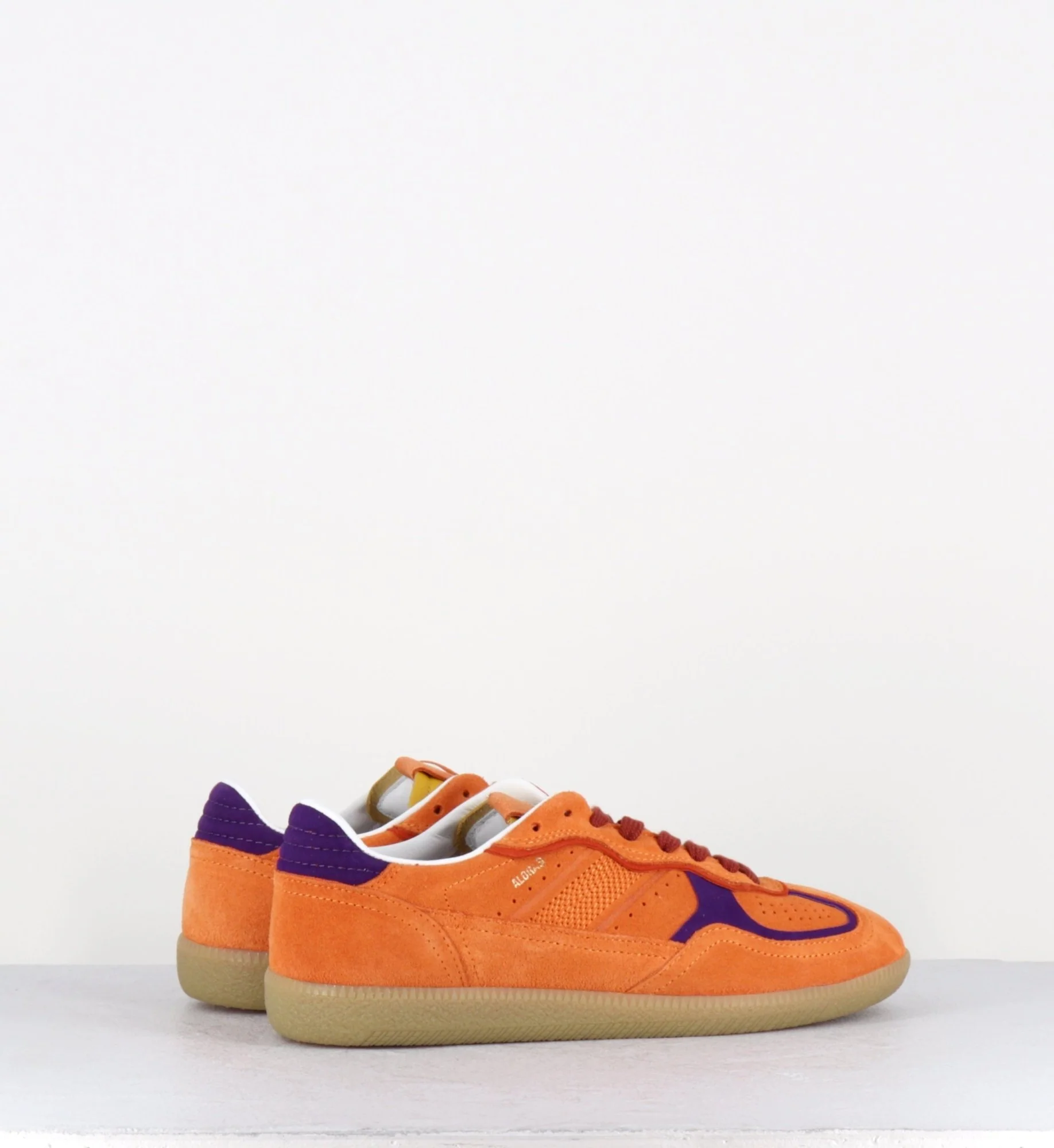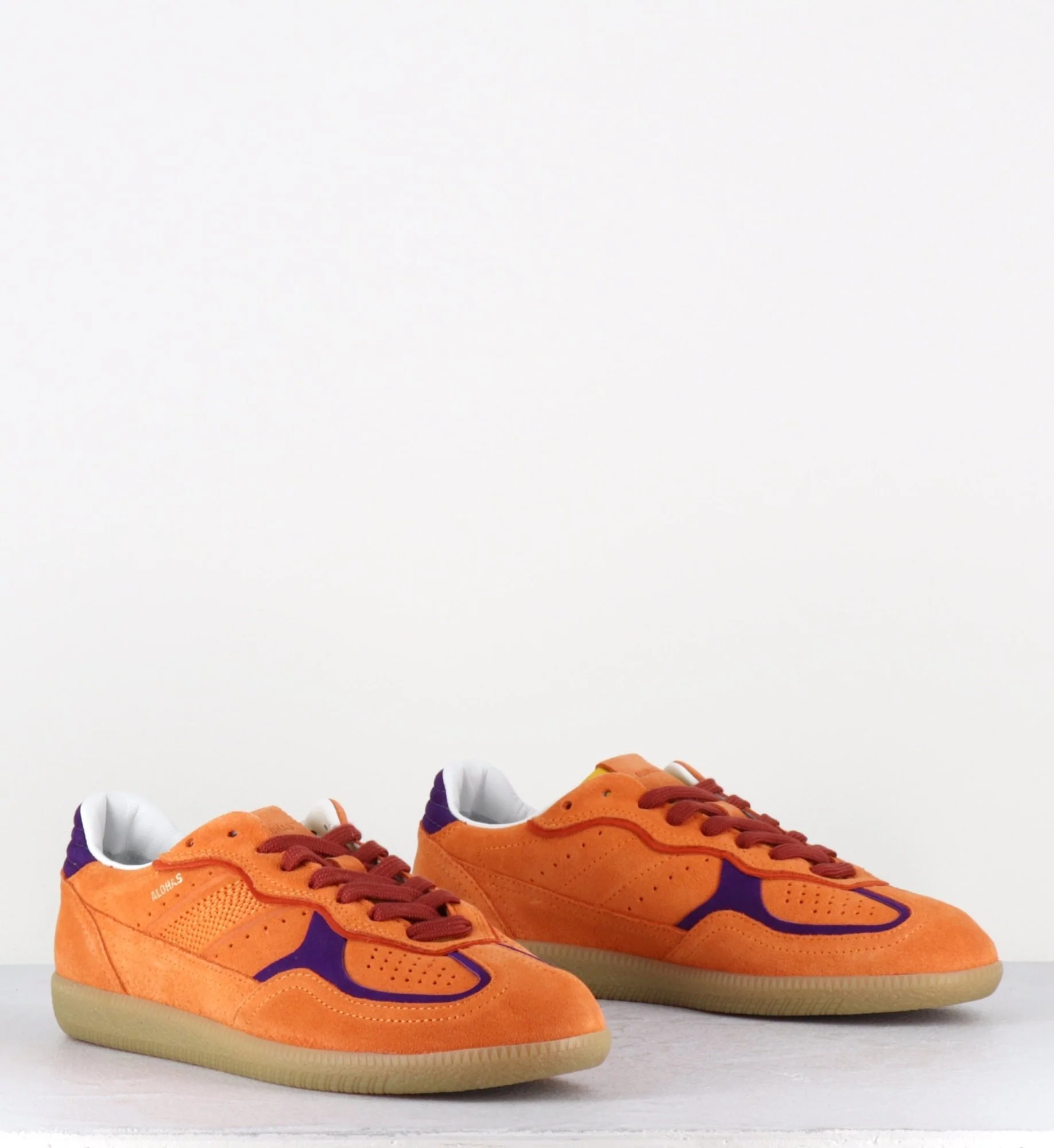 Orange suede sneakers with contrast details Coming in the brightest colors, the Tb.490 sneaker is made from orange suede with purple contrast details. Designed in a low-top silhouette sitting on rubber soles, it’s complete with classic features, including exposed stitching and logo stamps. Designed in Barcelona | Made in Portugal Chausse normalement
