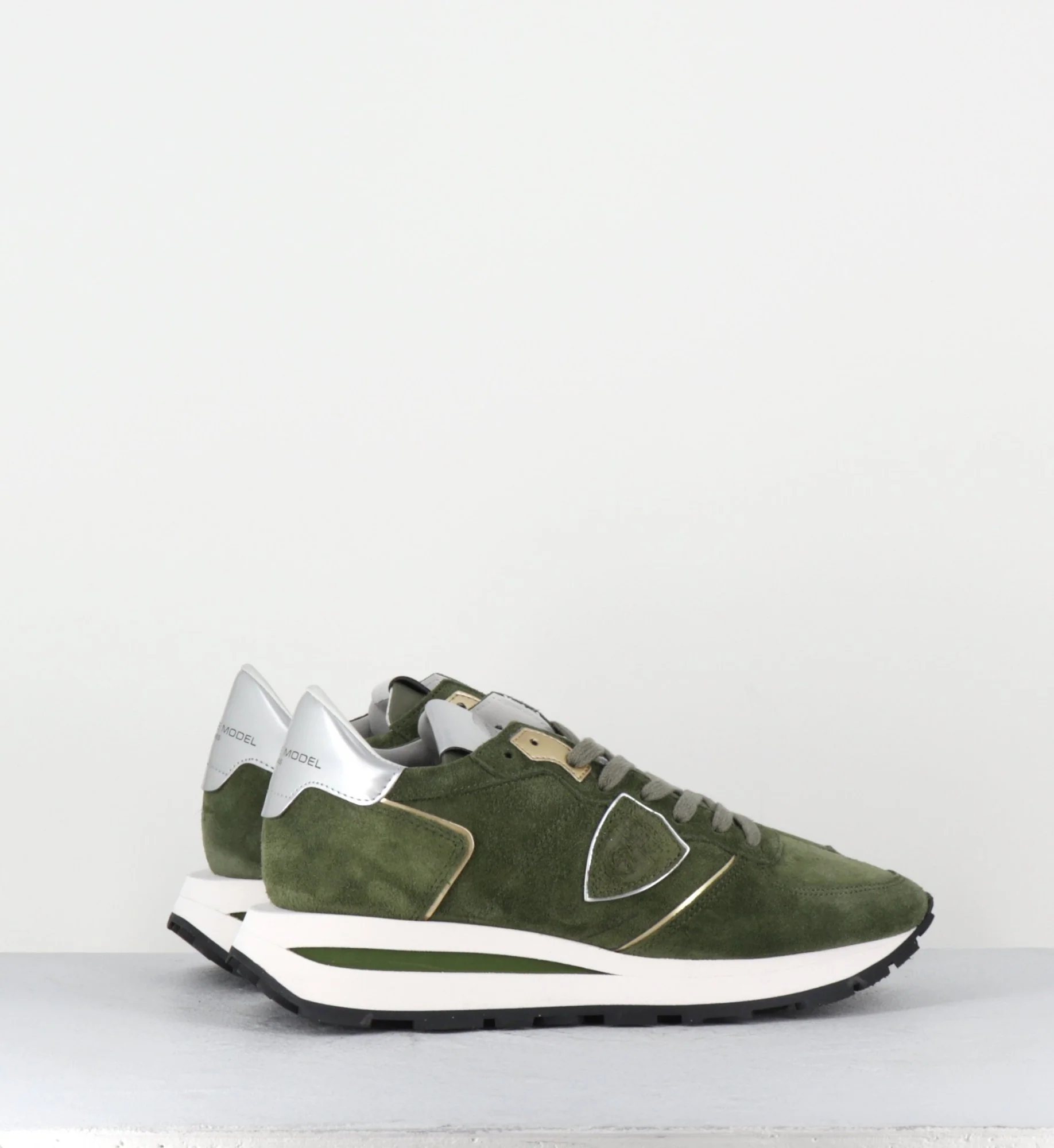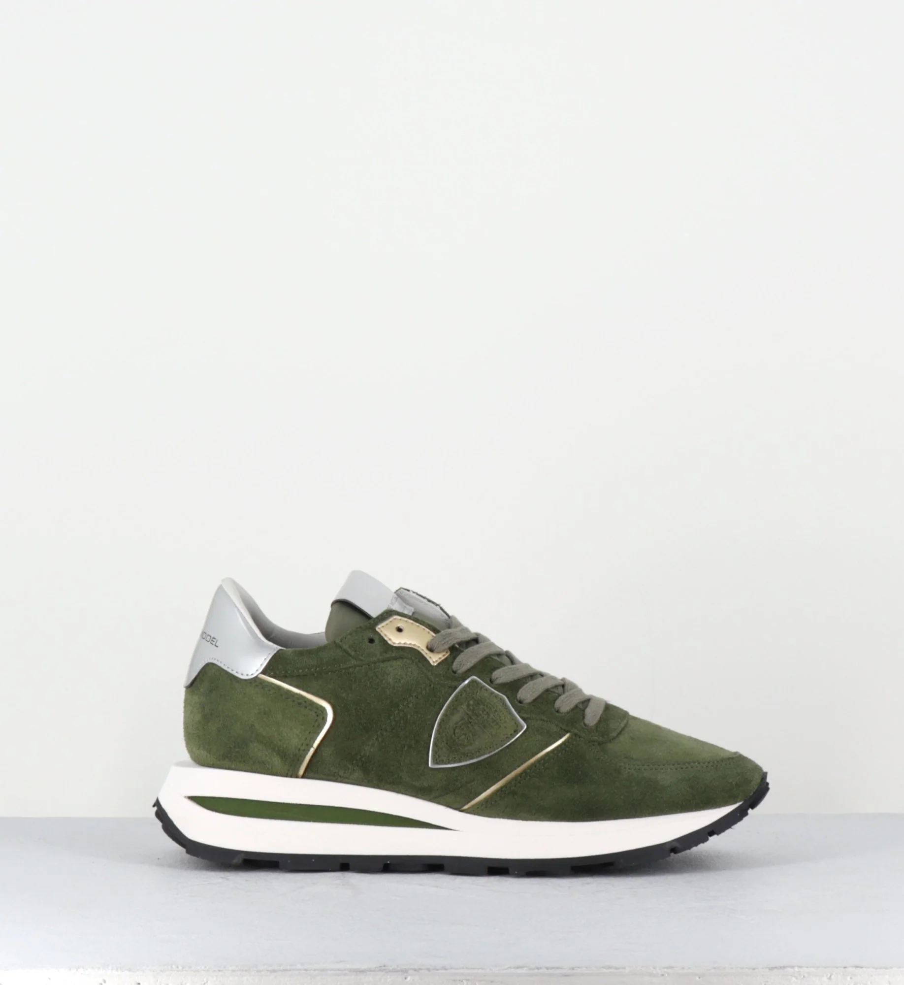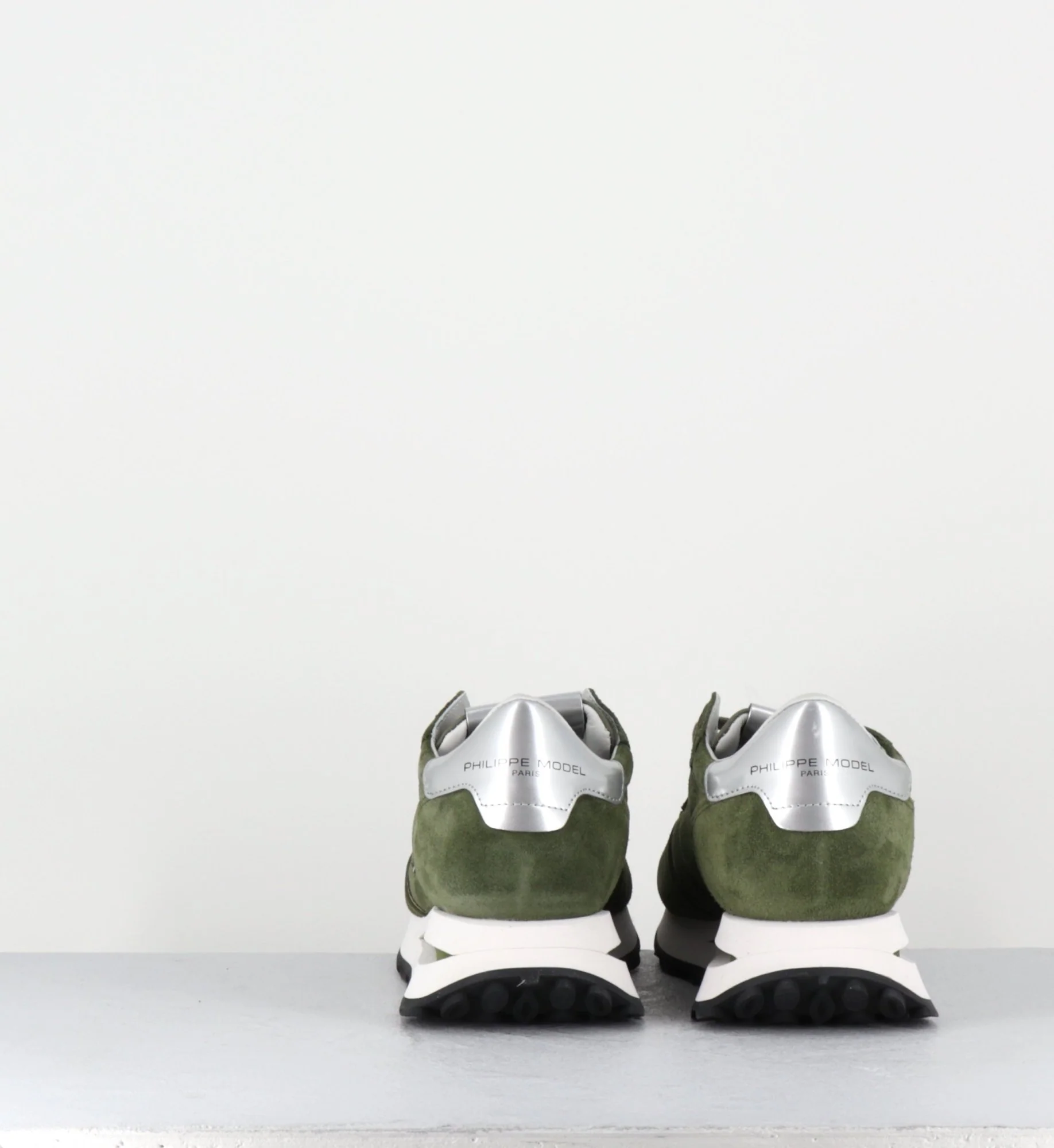 TKLD-DM02 Basket avec tige en suède vert kaki. Détails en cuir laminé. Semelle en mémoire de forme amovible, avec doublure intérieure en tissu. Semelle en caoutchouc ultra-léger fraisée artisanalement avec un empiècement tridimensionnel contrasté sous le talon. Fabrication Artisanale Italienne – Philippe Model