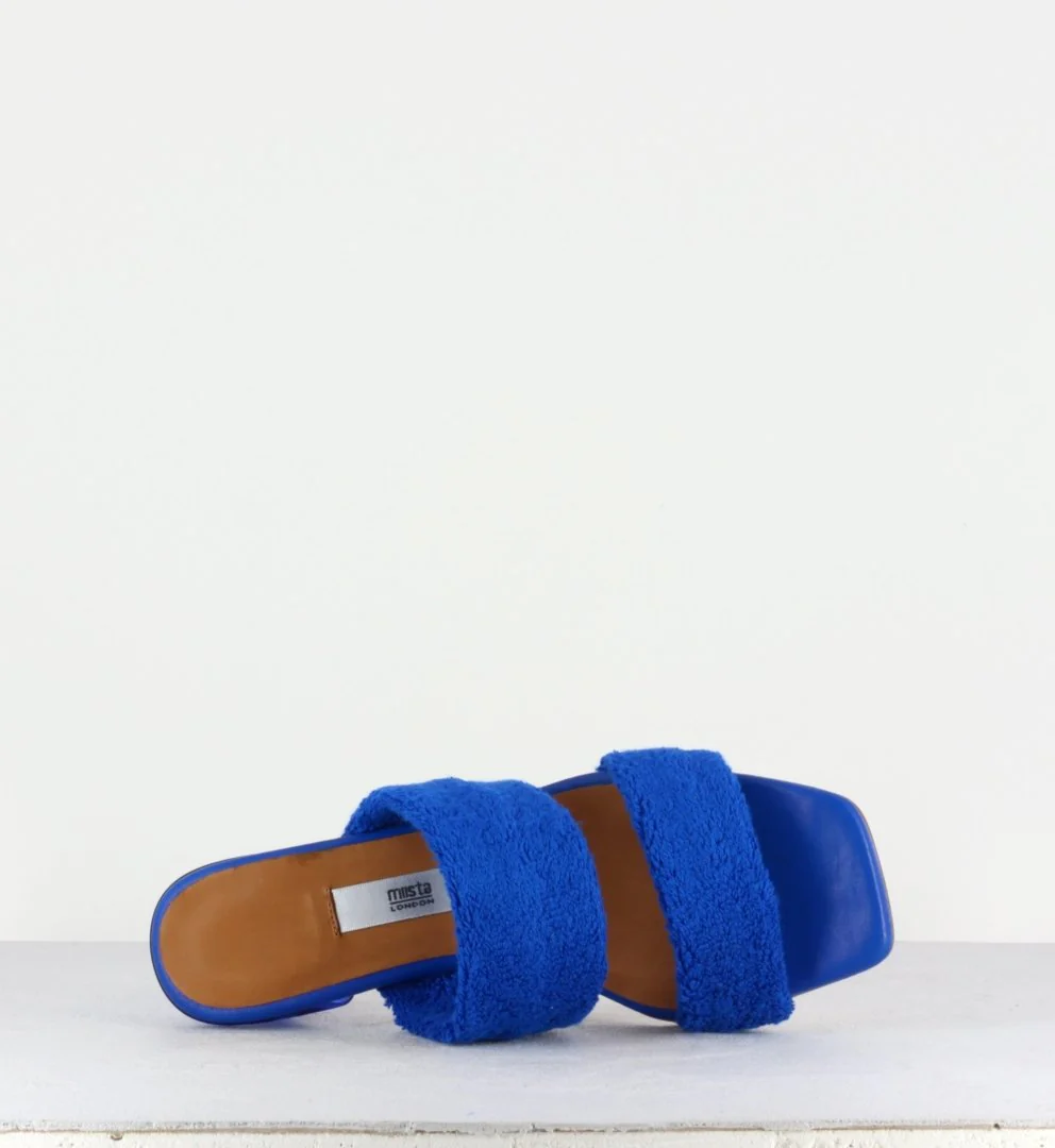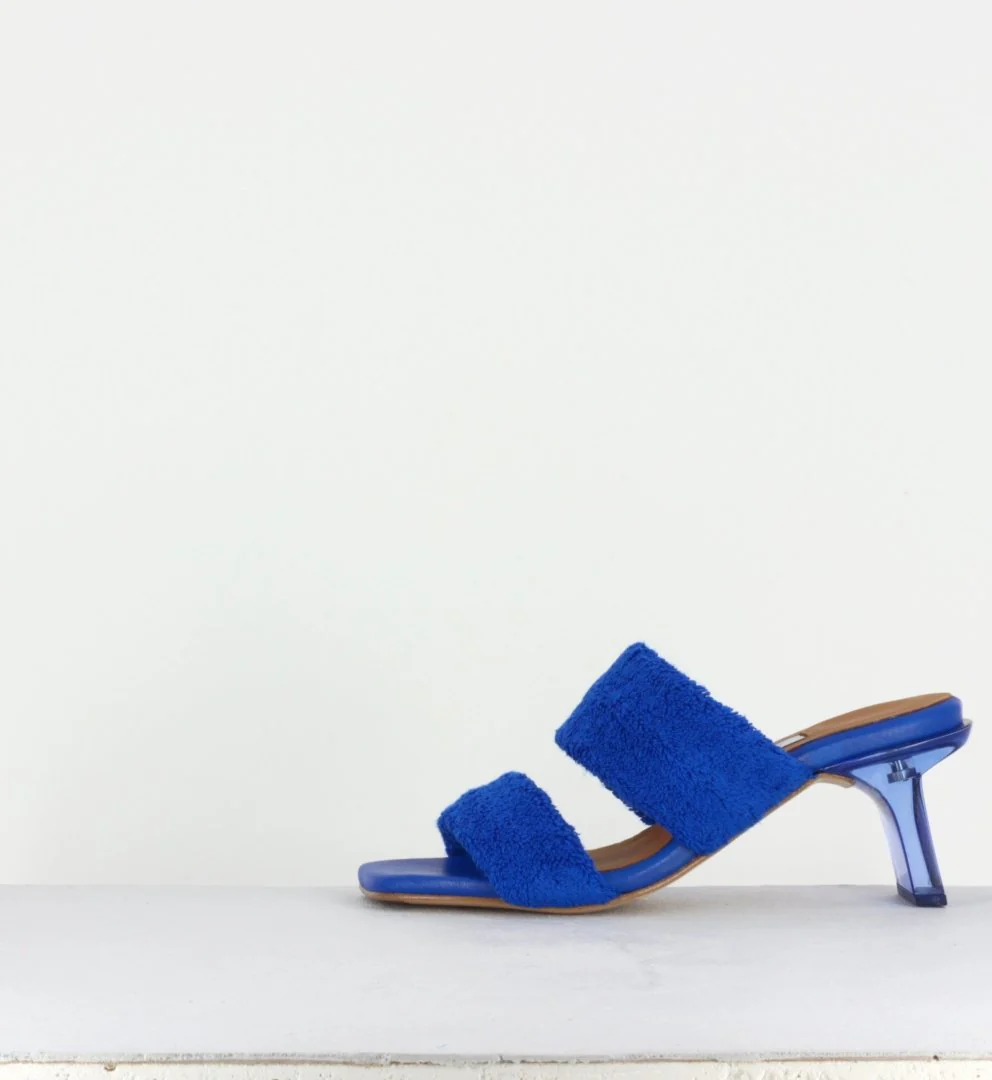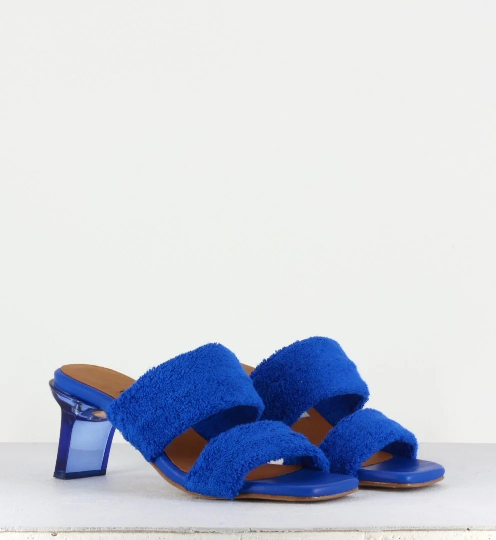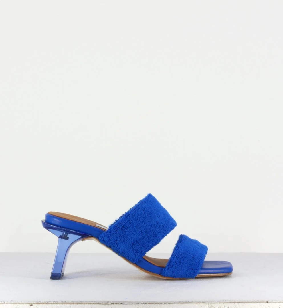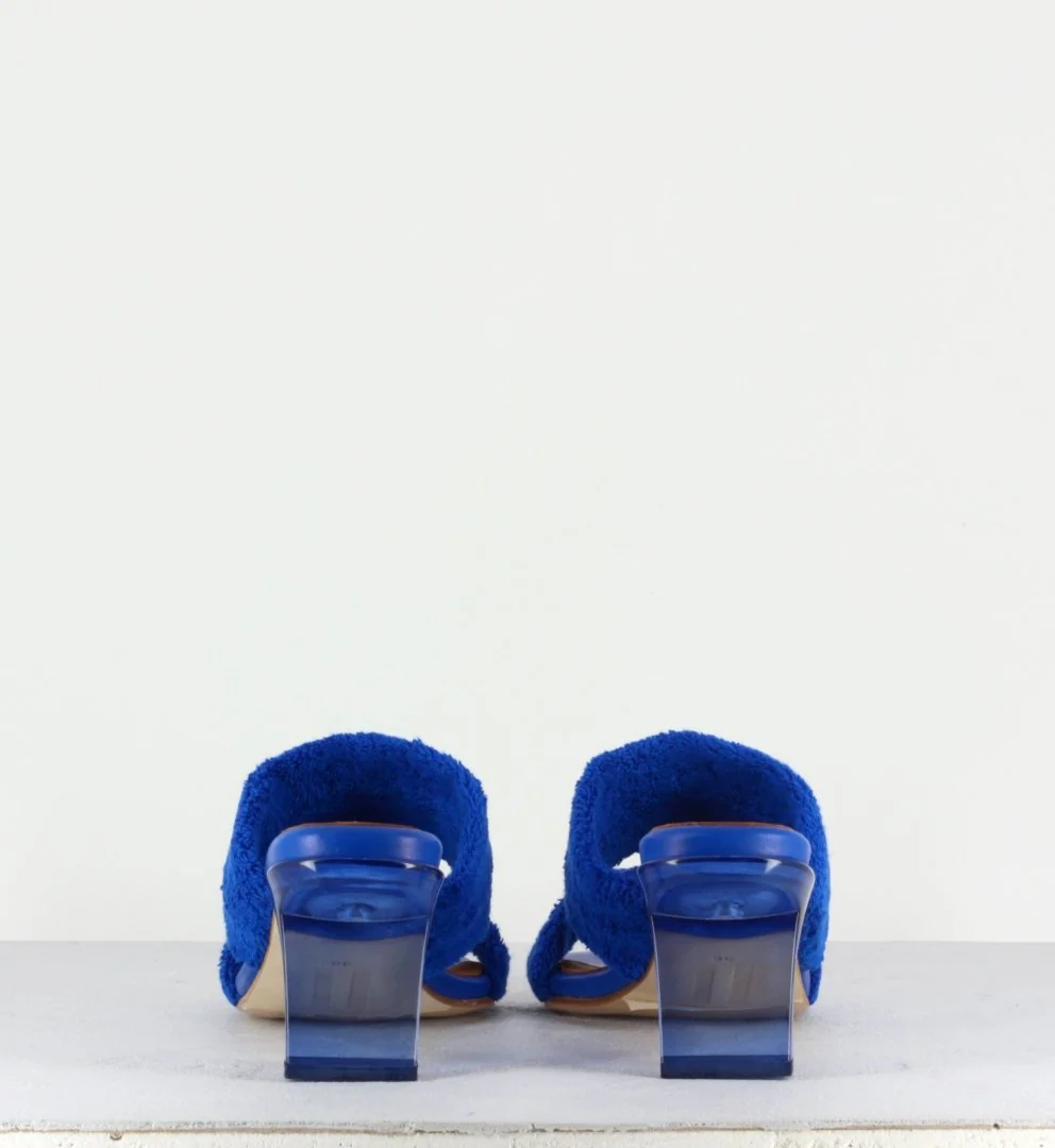 Sandales en éponge bleu Miista – Tyler Navy Towel Mules à bout carré en cuir lisse et éponge bleu, montées sur un talon sculptural en pléxi ton sur ton. Chic au soleil! Chausse normalement