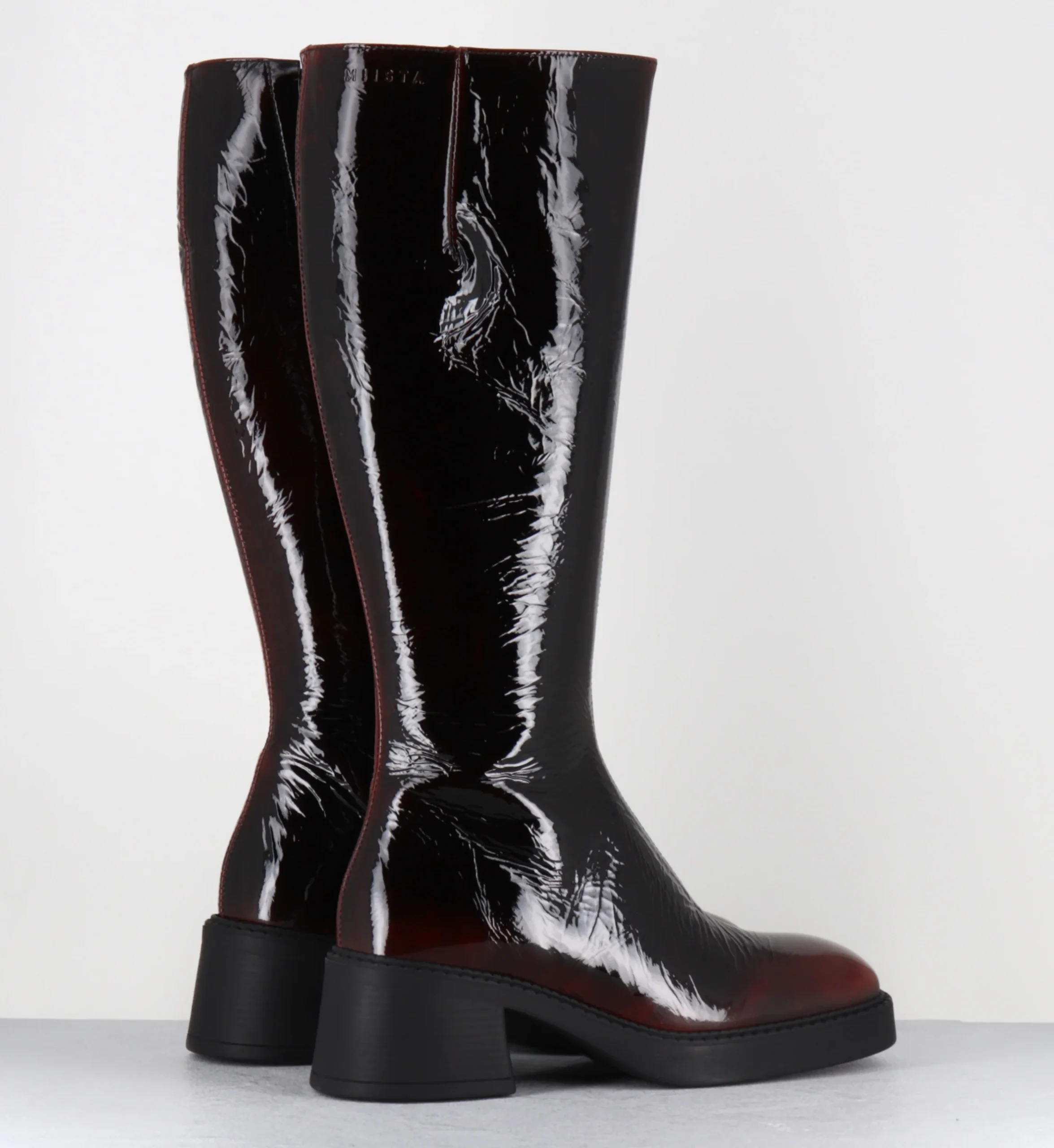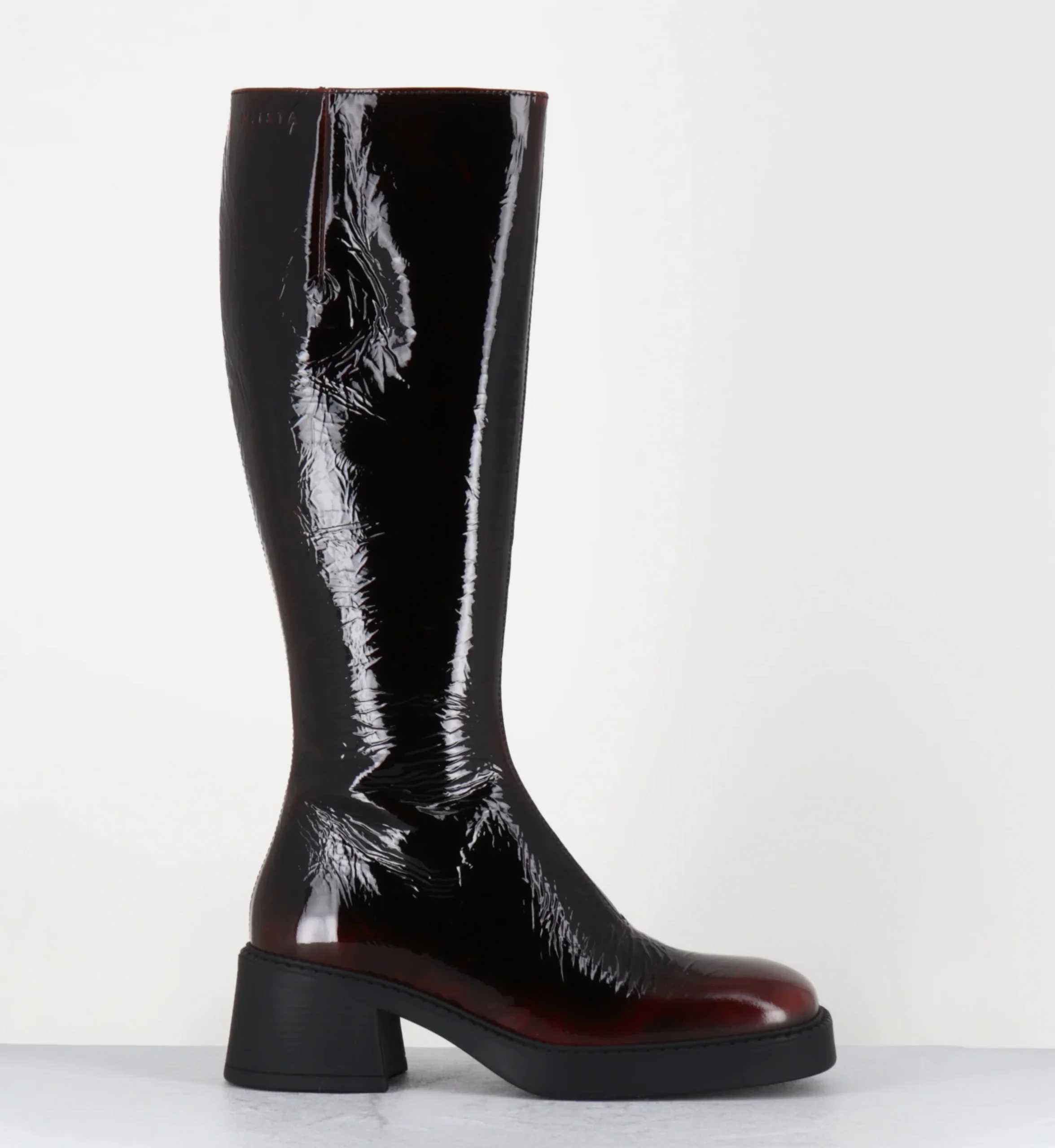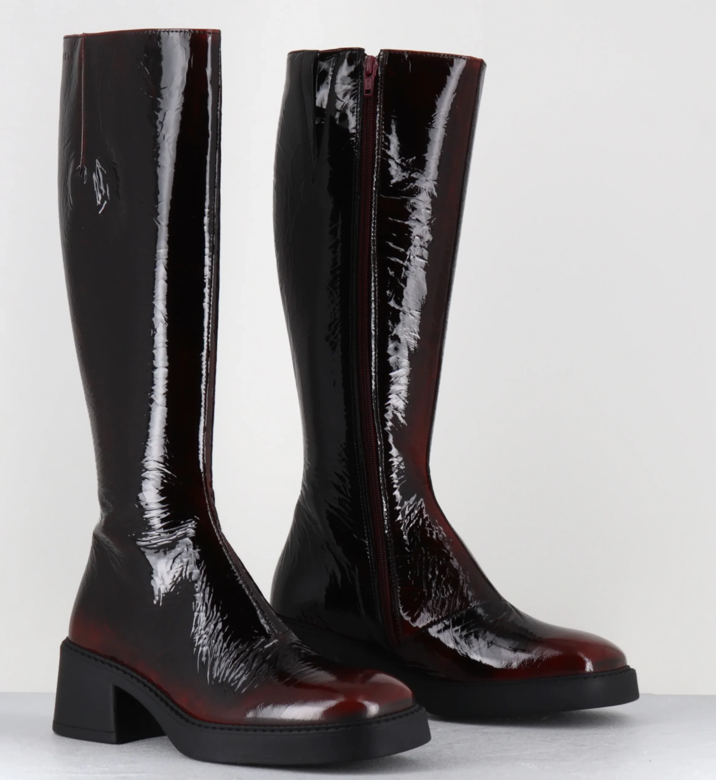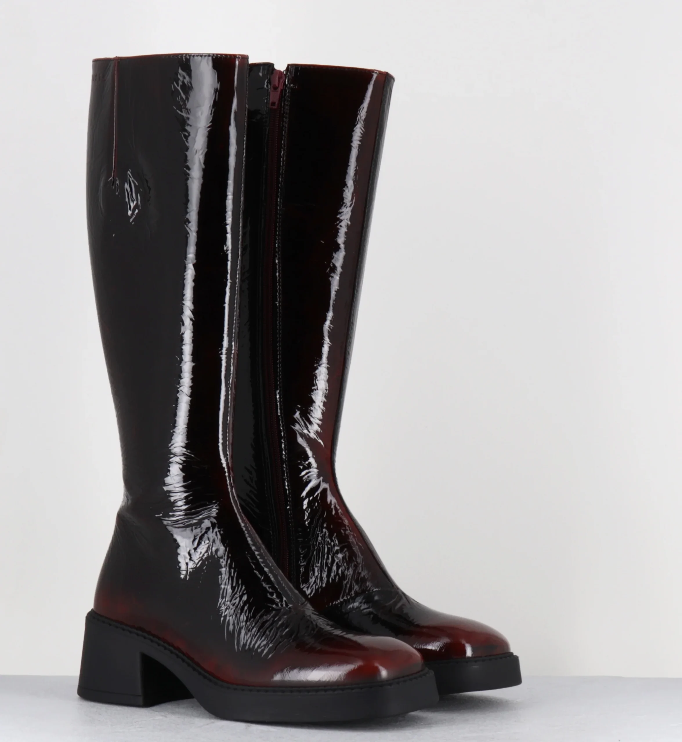 Bottes en cuir vernis effet froissé et dégradé bordeaux, bout carré arrondi, montées sur une petite plateforme en gomme et un bloc confortable